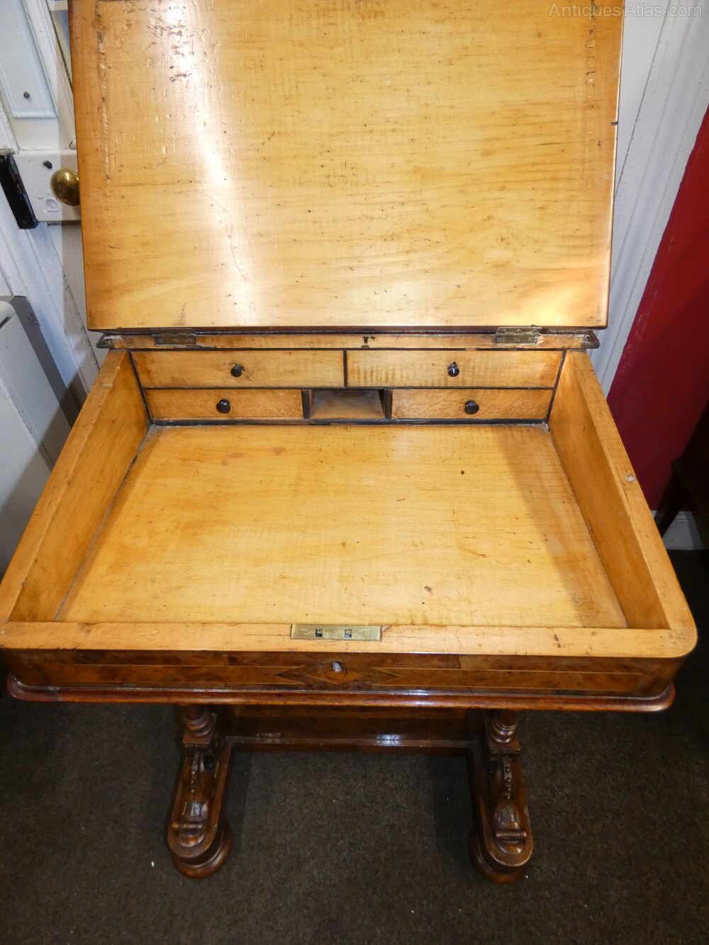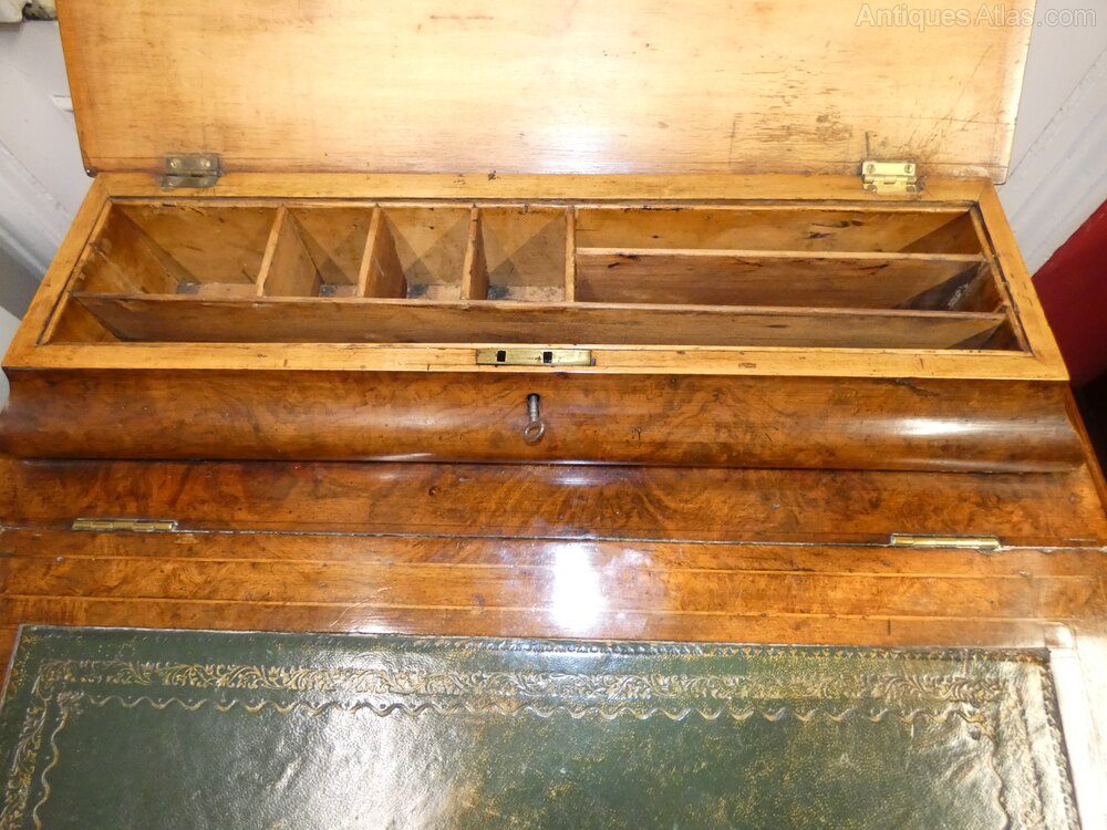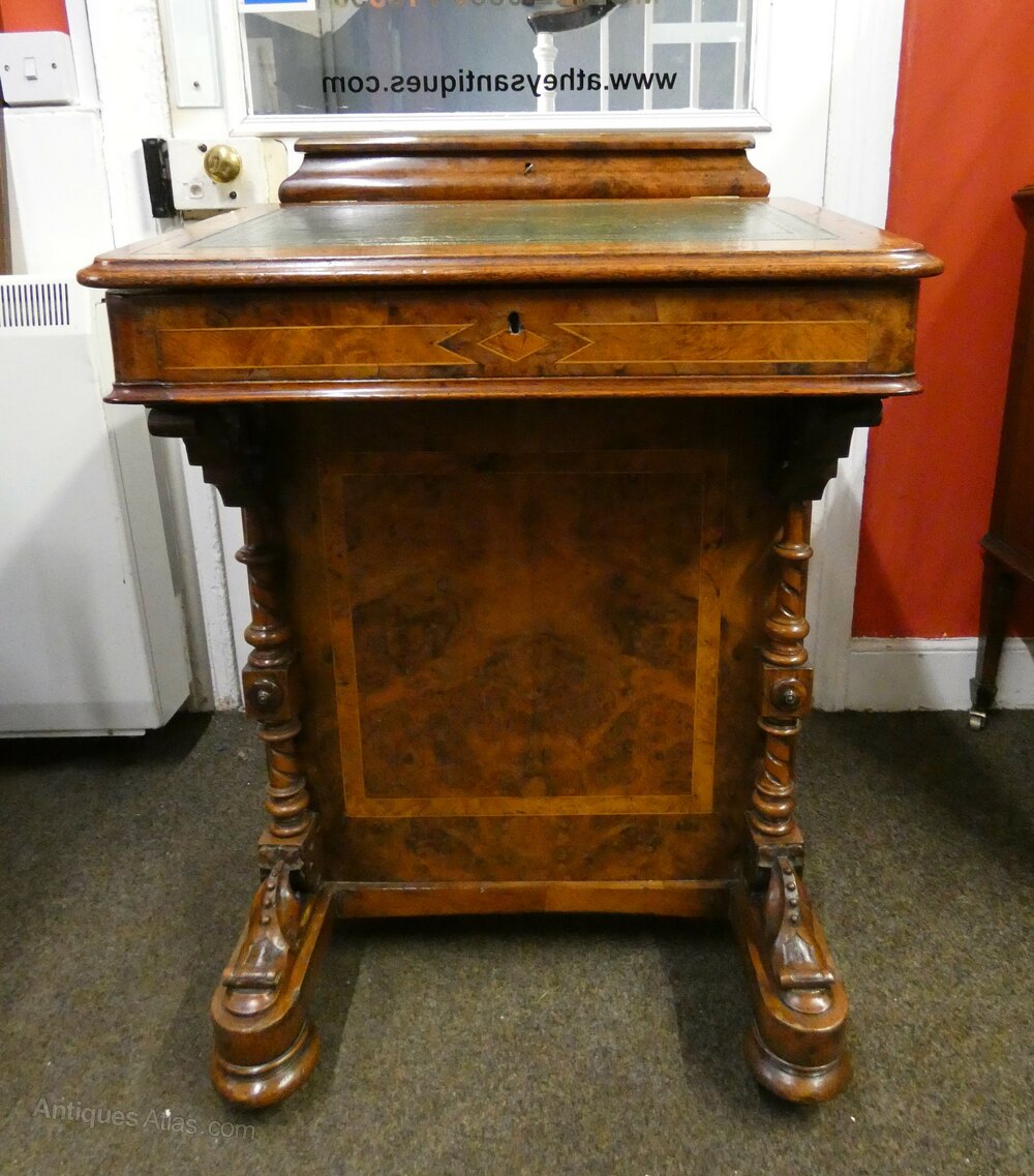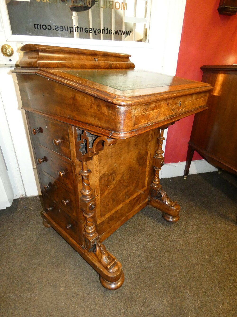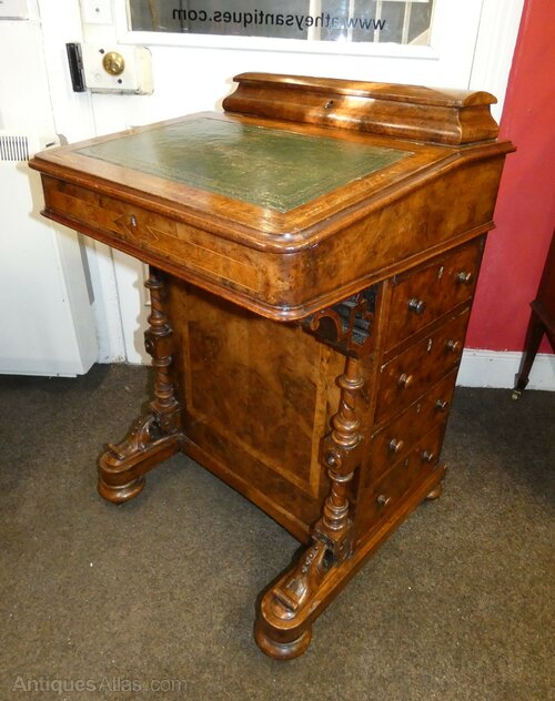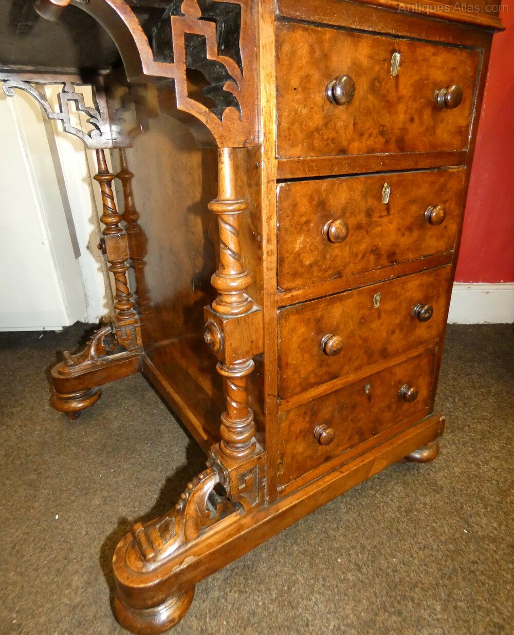 Lovely burr walnut Davenport desk, the inlaid hinged top opens to a fitted stationery compartment, the green / gilt tooled leather writing slope with ornate carved and turned supports encloses a satinwood fitted interior, four drawers to one side and four faux drawers to the other, standing on flattened bun feet.