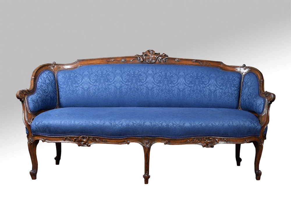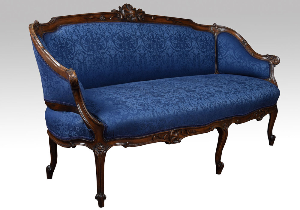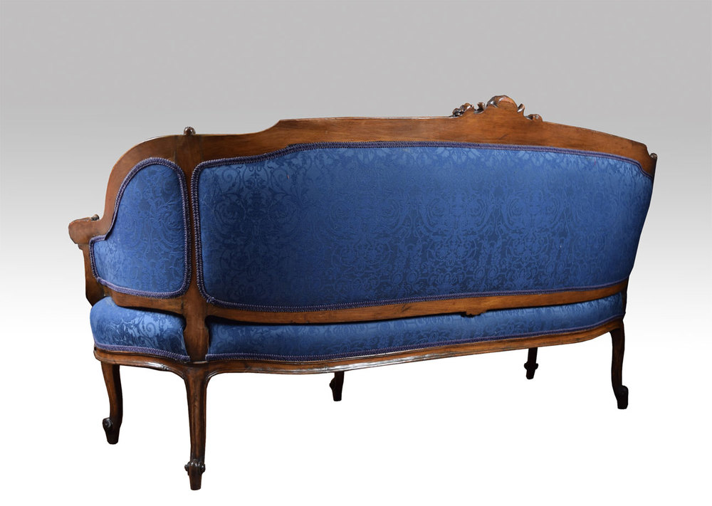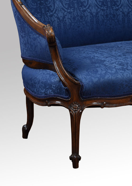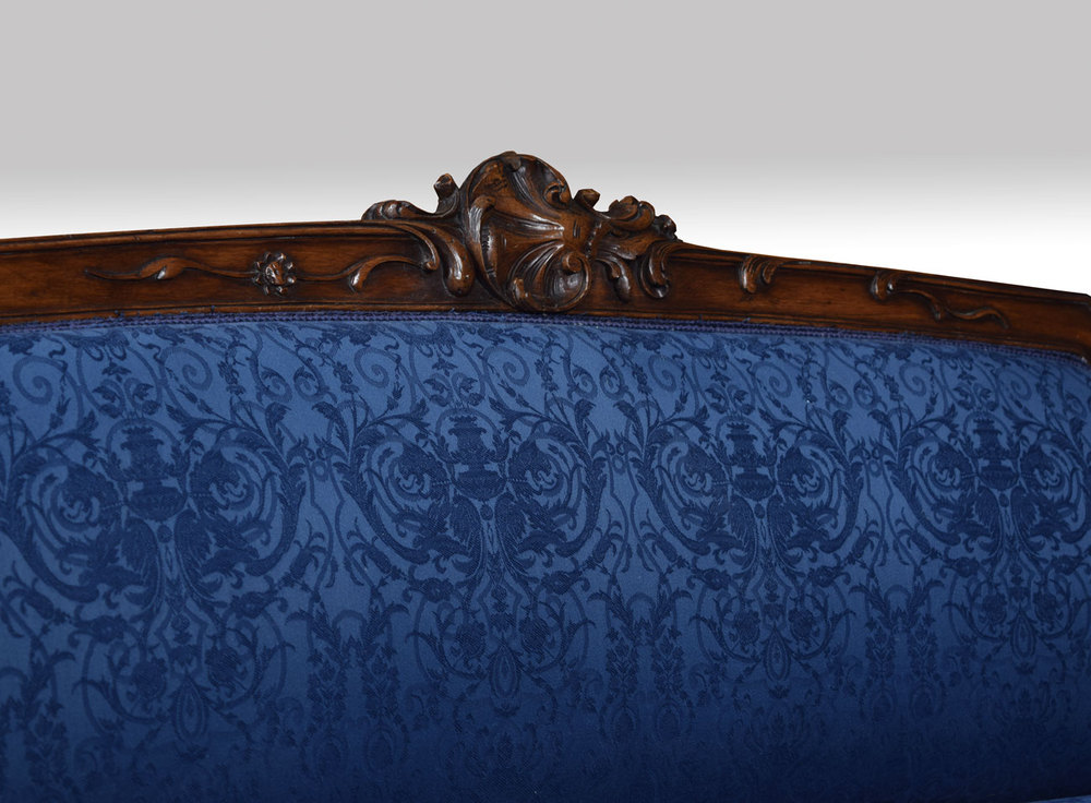 Walnut framed two-seater settee, the finely carved shape frame above upholstered back, seat and arms in blue damask fabric all raised up on carved cabriole legs with scrolling feet