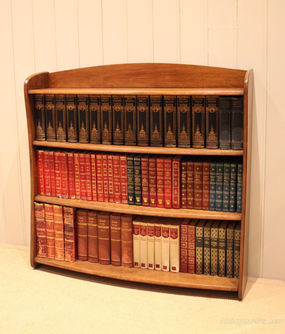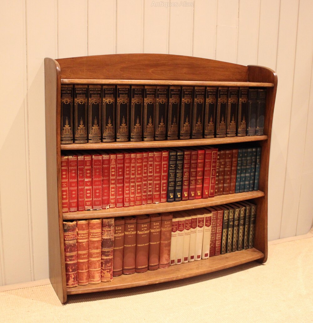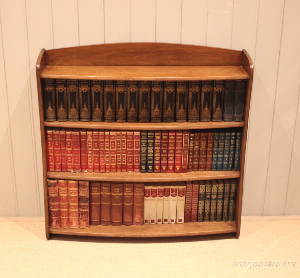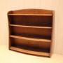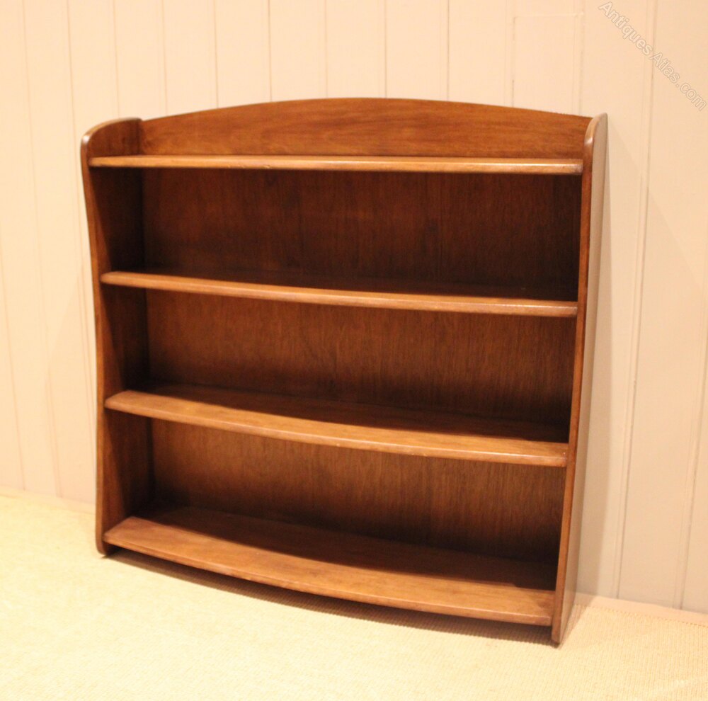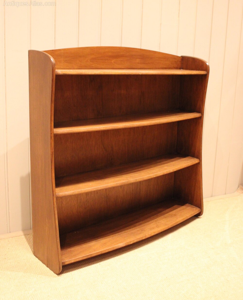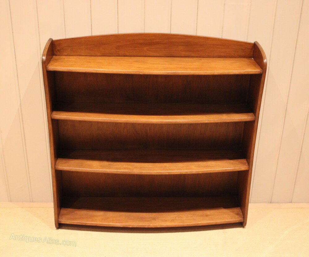 Walnut open bookcase having graduated bow front shelves , raised on side brackets , the shelf dimensions are from the bottom up 25 cm high x 23.5 cm deep , 22 cm high x 20 cm deep , and at the top 20 cm high x 19 cm deep .