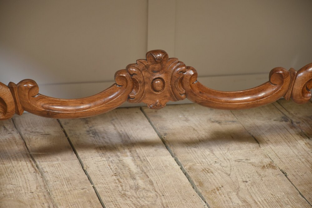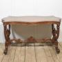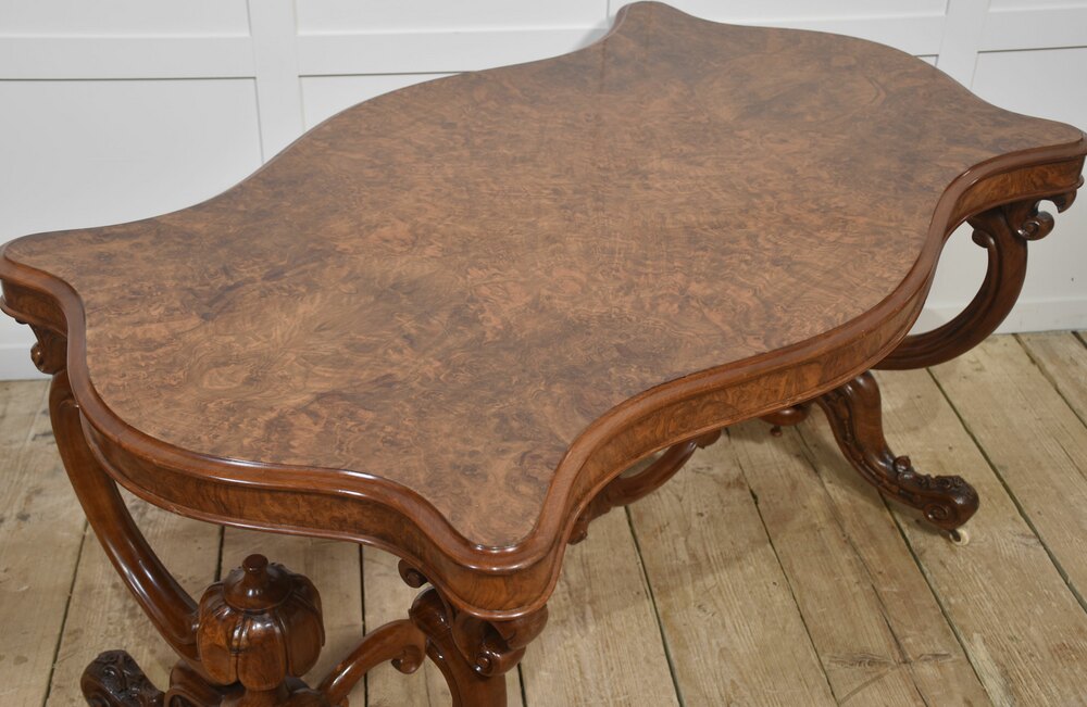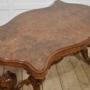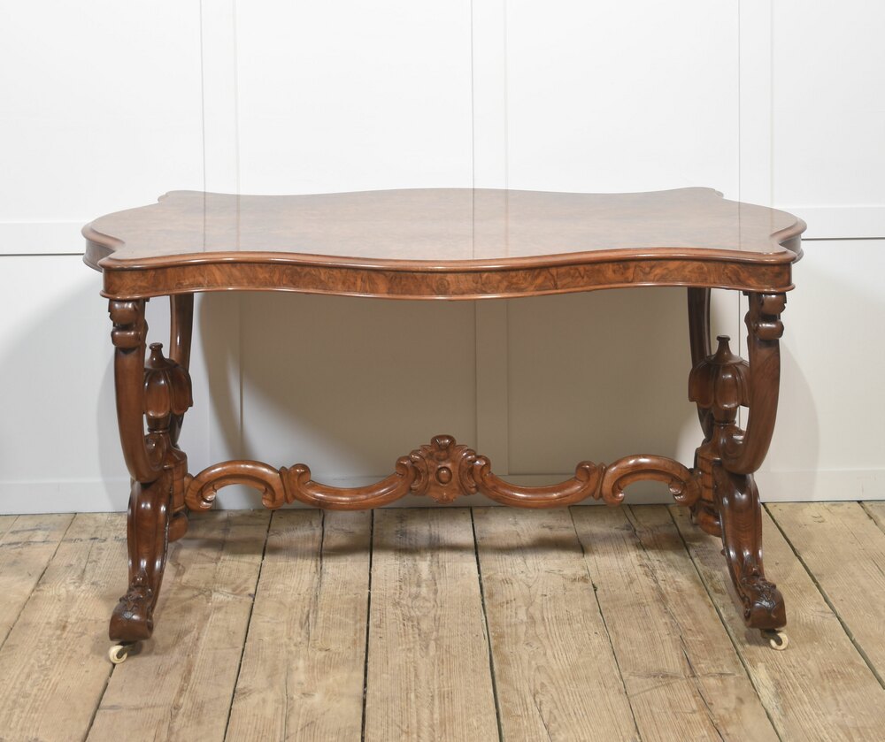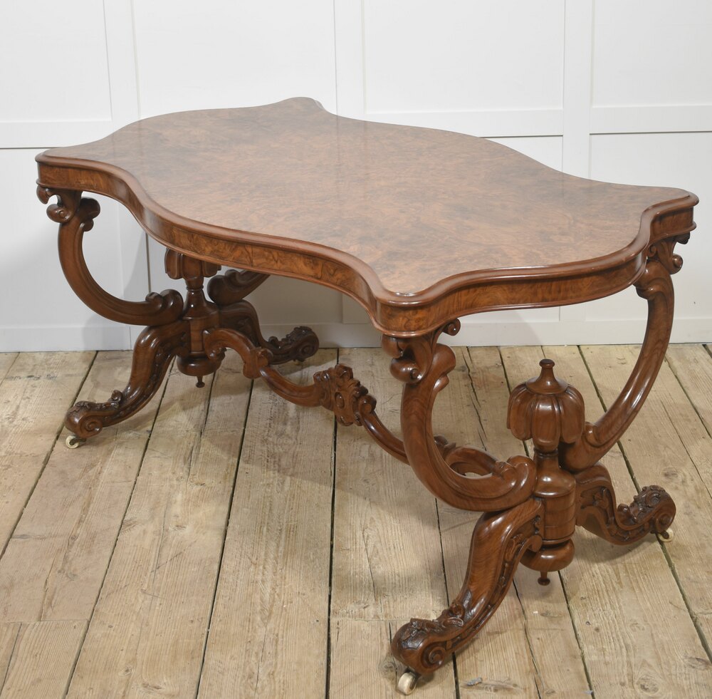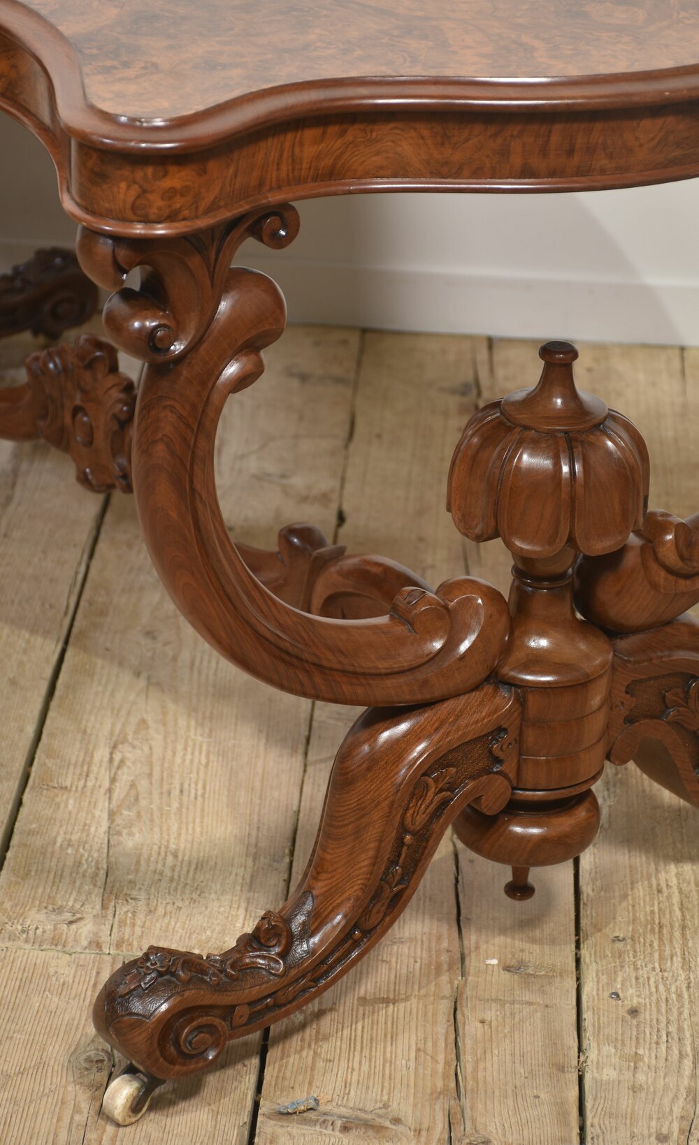 Walnut centre table, the large shaped burr walnut top above scrolling end supports with central carved bulbous turnings all raised up on carved cariole legs terminating in ceramic castors