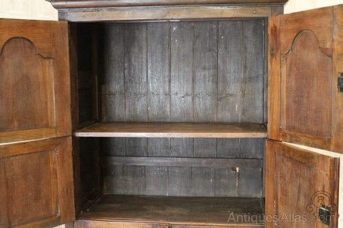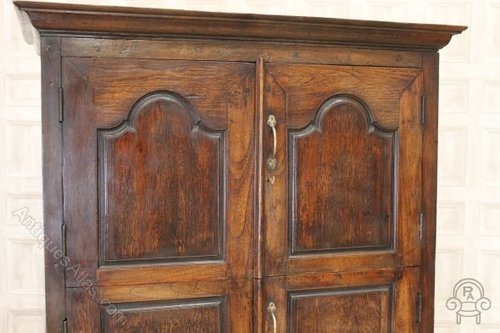 It has three internal compartments and two large drawers to base. The piece has a lovely patina and colour, making it almost indistinguishable from a genuine George II country cupboard.