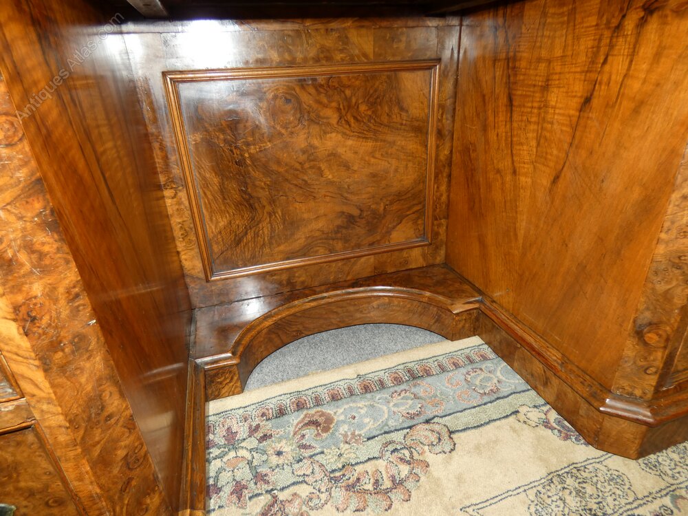 The beautifully figured crossbanded top above a frieze drawer and eight further drawers ( working locks and key ) to one side and a further frieze drawer to the opposing side with shelved cupboards, panelled sides, plinth base , raised on castors for ease of movement.