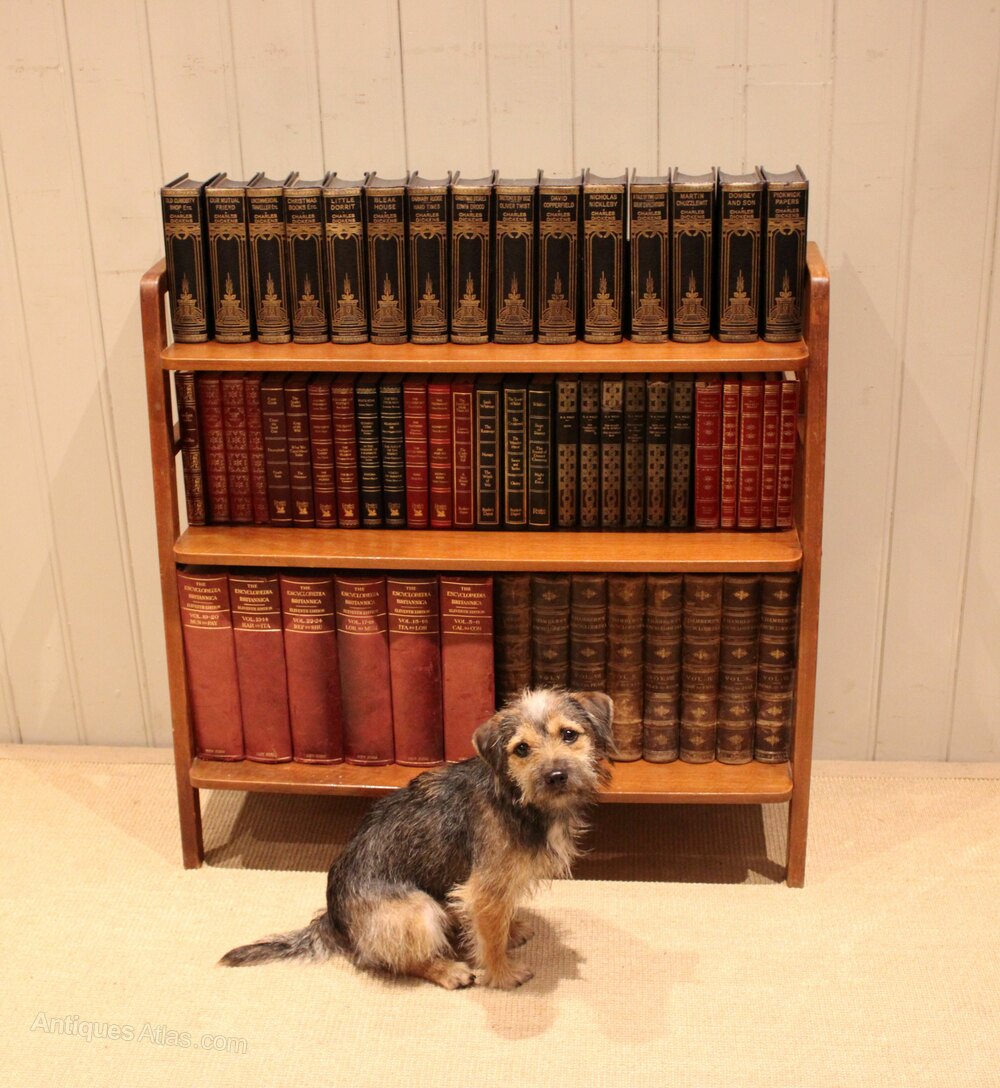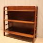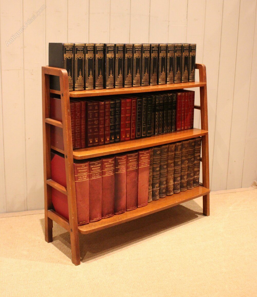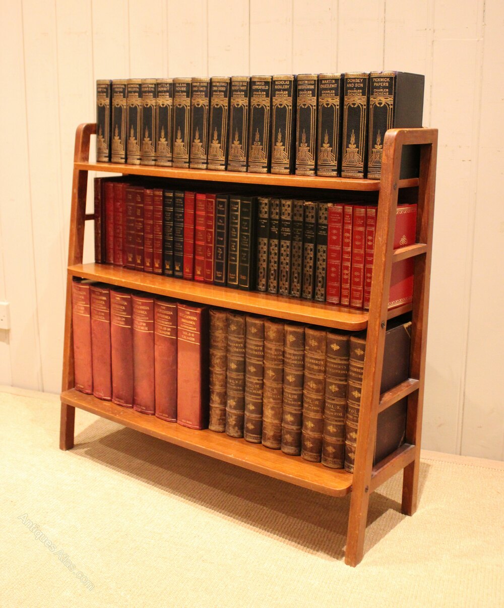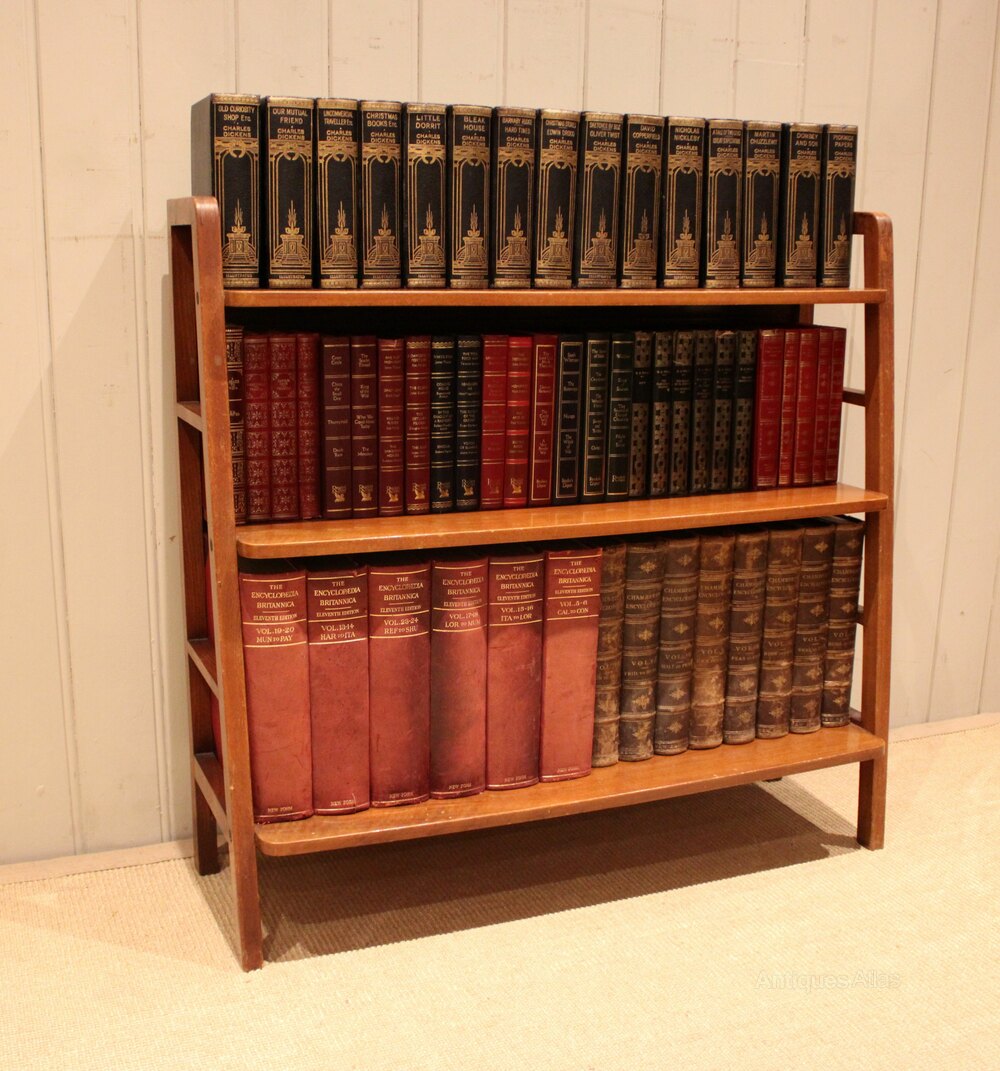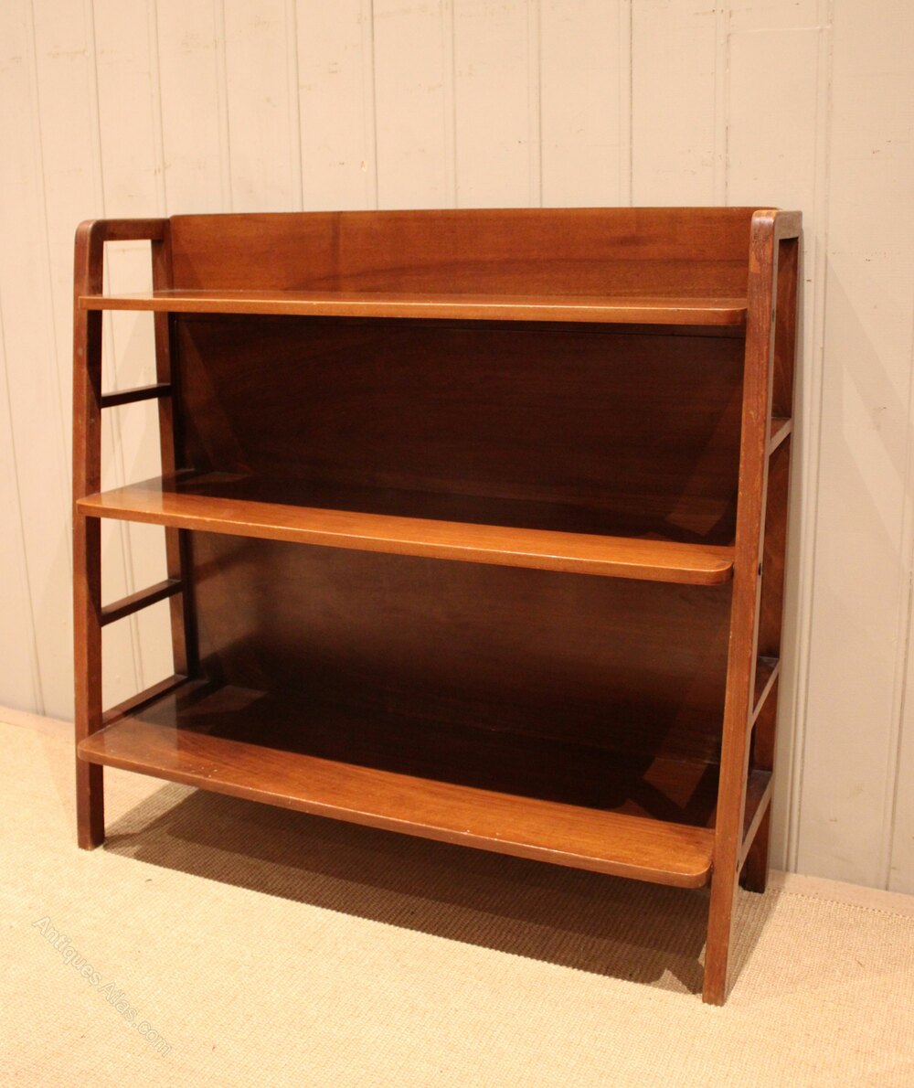 Walnut three tier graduated open bookcase having open sides , raised on straight supports . The shelf dimensions are 82 cm wide and from the bottom up 28 cm deep , 24.5 cm deep and at the top 22 cm deep , the height from the bottom up 30 cm and 24 cm high.