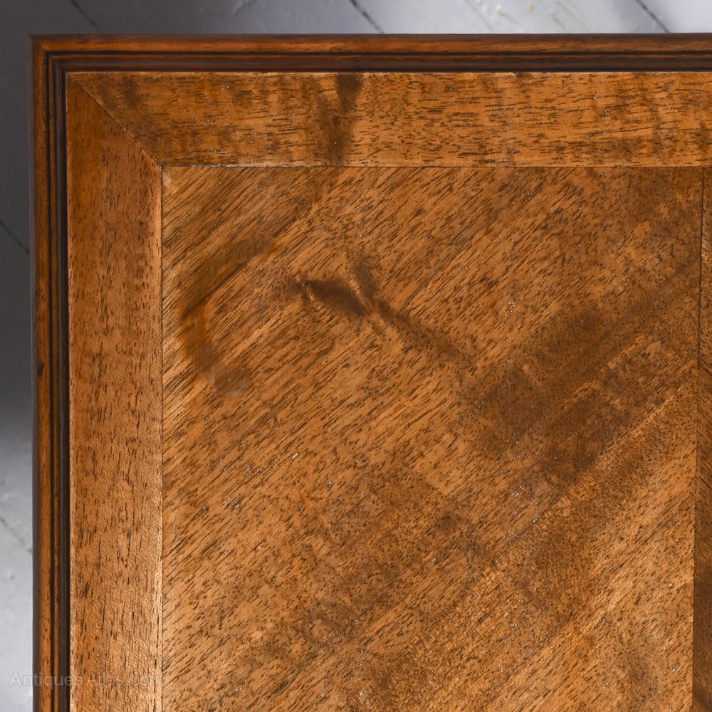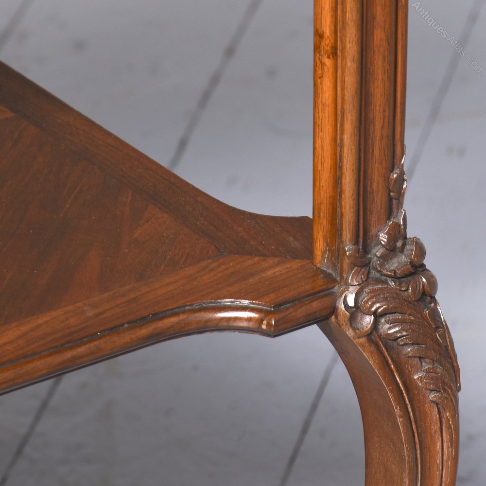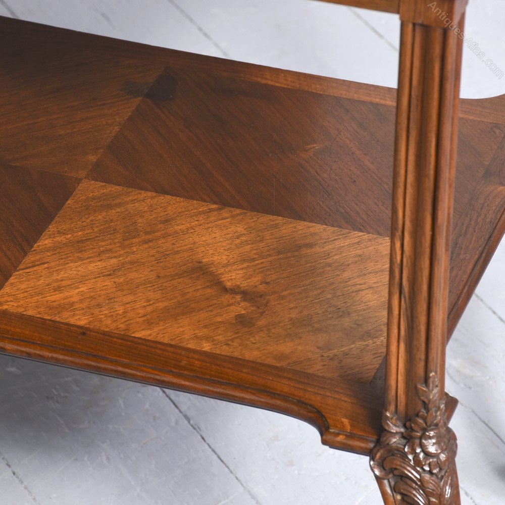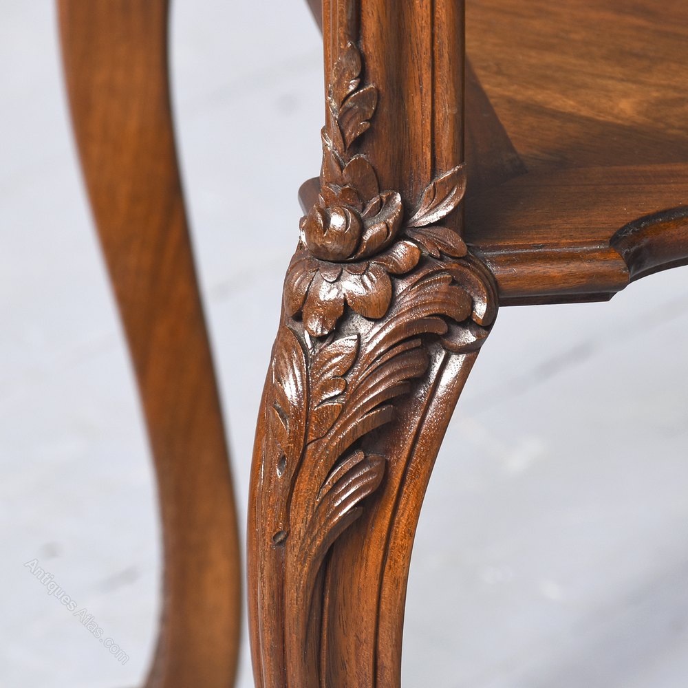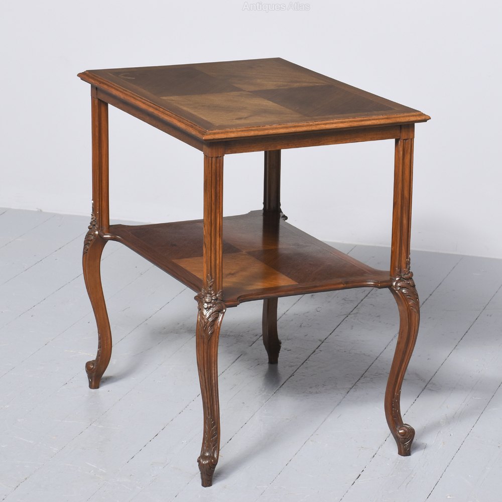 Circa 1900. A walnut 2 tier occasional table (probably by Morrison and Co of Edinburgh). the top with quarter matching walnut crossbanding and stylish moulded foredge, the tier beneath similar to the top with canted corners, supported on 4 stylish columns with beaded edges and concave centers, all resting on 4 elegant cabriole legs with foliate carving on the knee’s which also forms the quarter blocks, elegant curled toe with foliate carving on the facings and c scrolls to the sides.