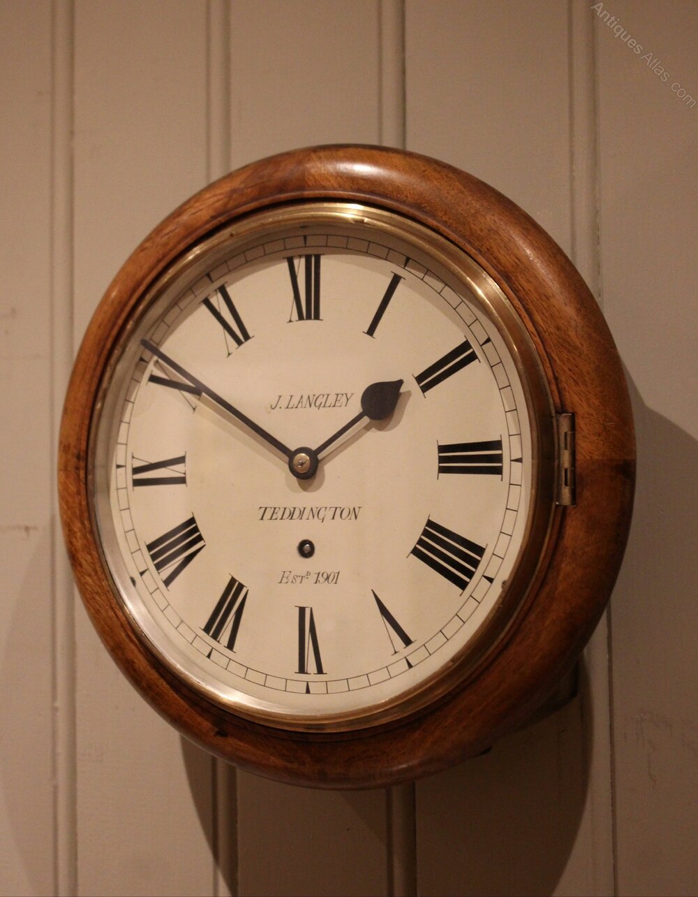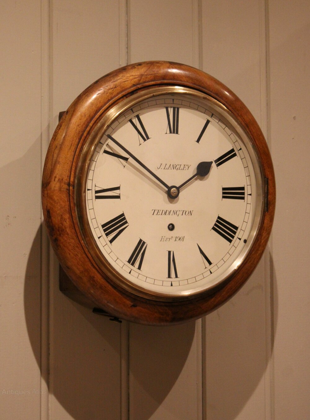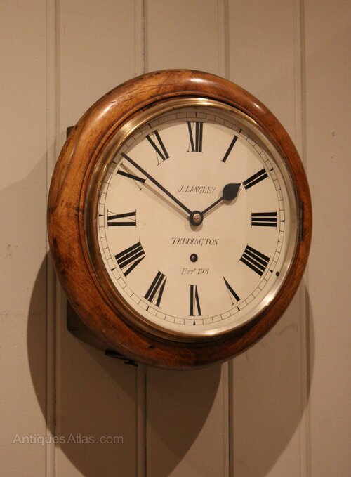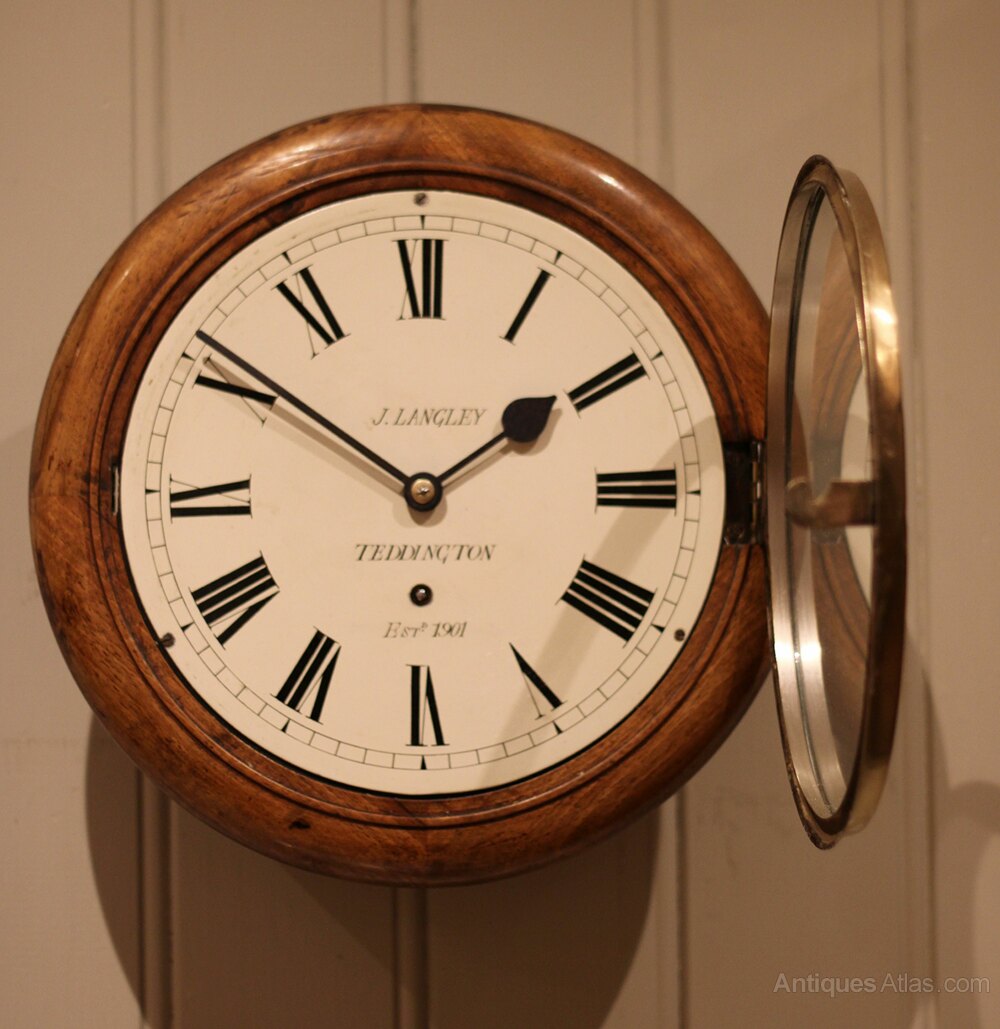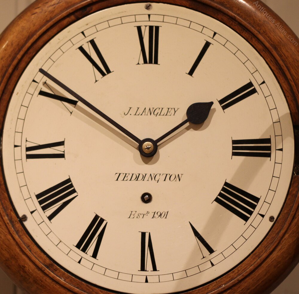 An early 20th Century walnut dial clock . It has a solid walnut turned outer rim, and a polished brass bezel The white painted enamel dial is signed by the original retailer J Langley who were in Teddington . It has an 8 day pendulum movement made by W & H , with access to the pendulum through the base door.