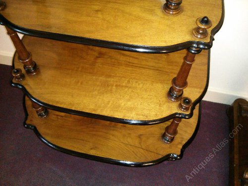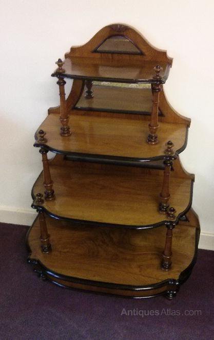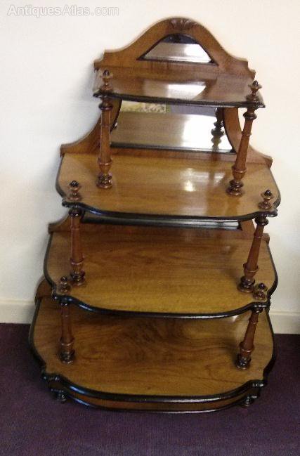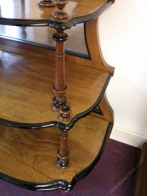 A nice clean walnut what not stand. This walnut stand with an attractive ebonised detailing is not a usual design. With a waterfall effect in the shelving and very nicely turned detail in the pillars it makes a super piece of antique furniture. We have given this a light clean and rewaxed and buffed it and it is now in good condition. A what not that is we suspect continental and not of English origin. Super shape and size, good colour in timbers too. Could go great in an alcove or just on a wall with useful display space reflecting back with the mirrored rear to the shelves