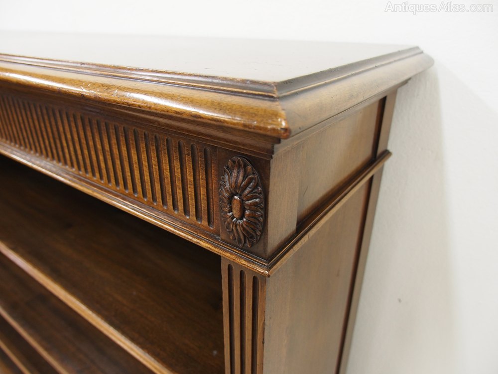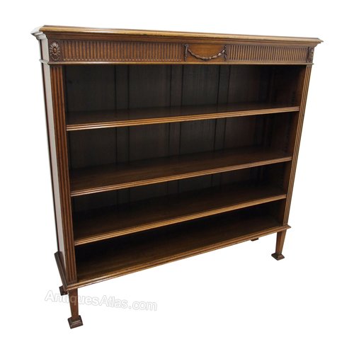 Circa 1910, Edwardian Adams style mahogany open bookcase, made by the famous cabinet making firm of Waring and Gillows. The bookcase has fluted pilasters, a fluted frieze with carved oval paterae and carved garland. With 3 adjustable shelves with fluted fronts, the piece stands on tapered supports on a small plinth. It is an excellent example of Gillows’ quality, and in perfect condition.
