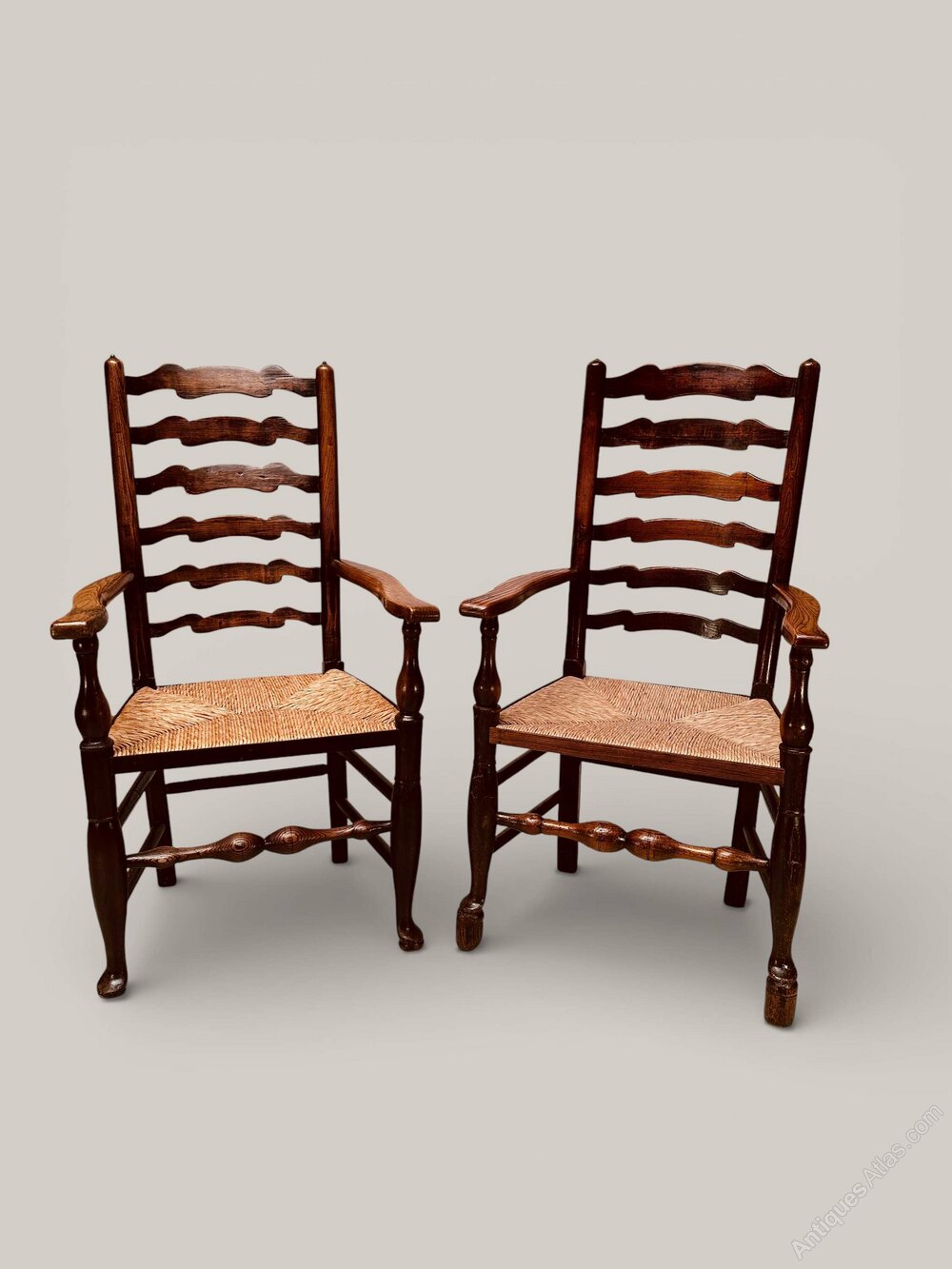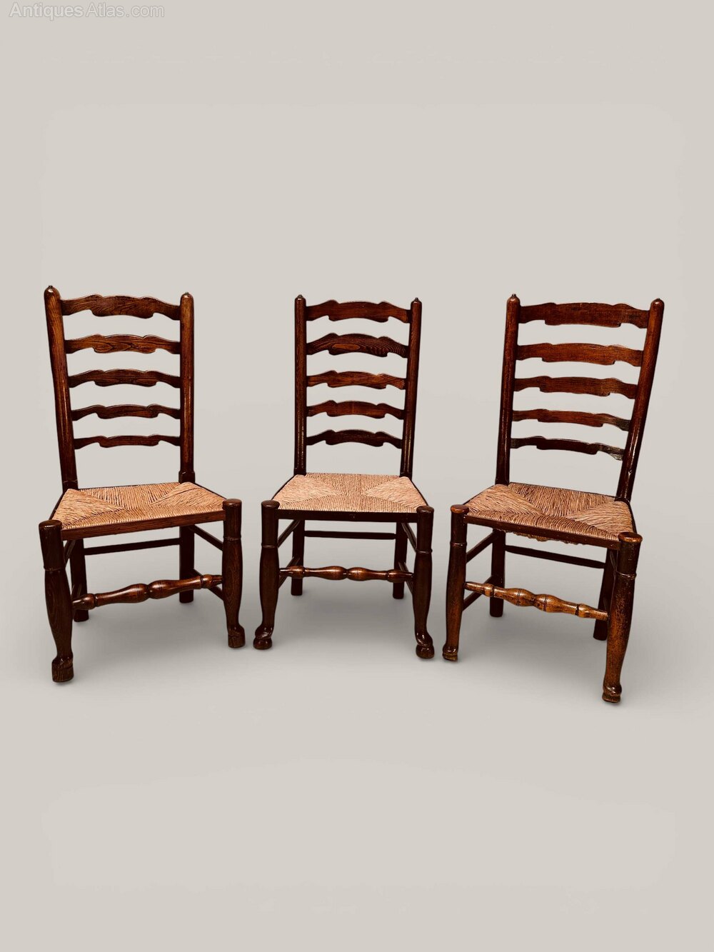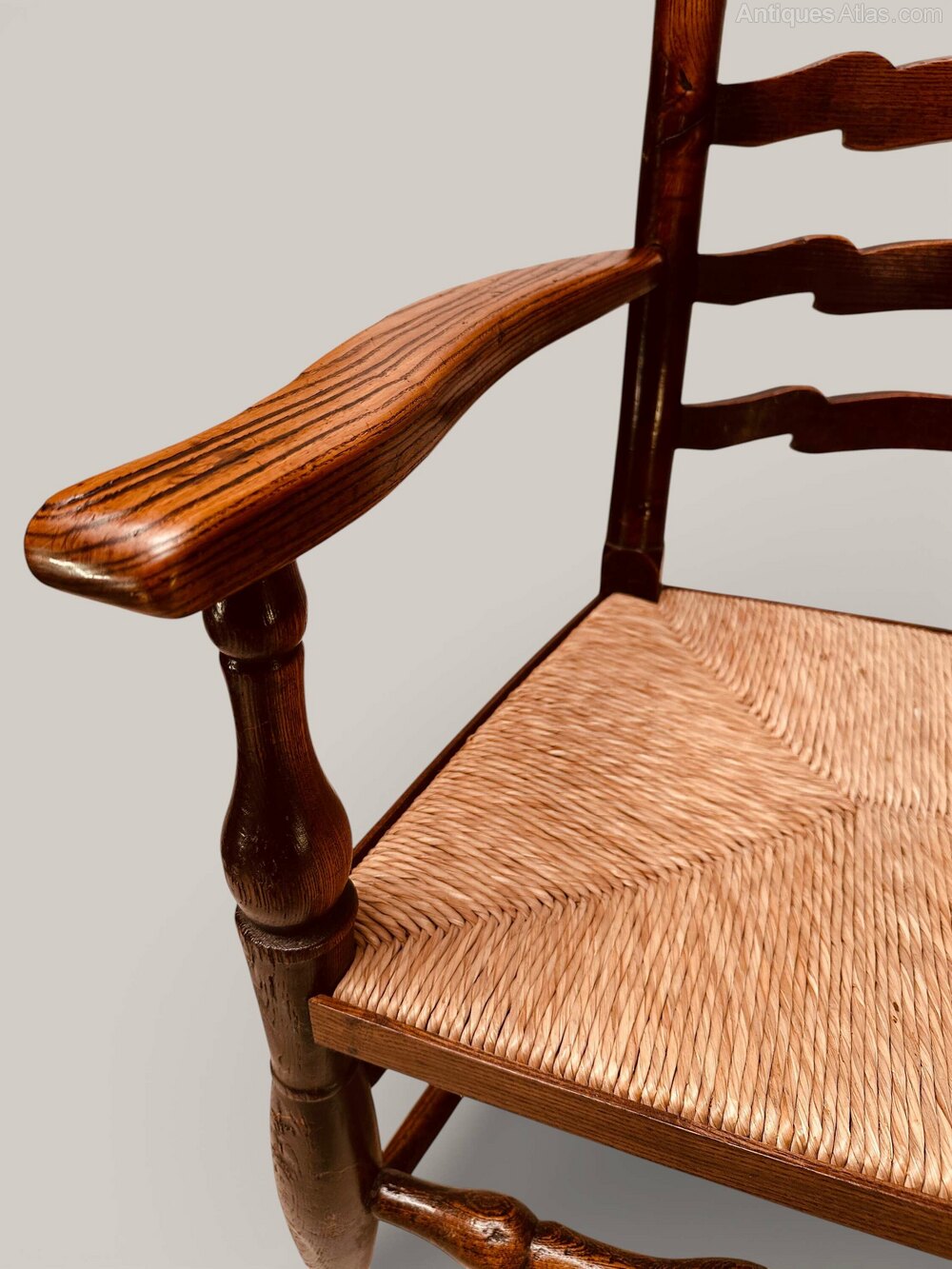 A well matched set of 8 ladderback chairs (6 x side chairs with 2 x armchairs). Wavy ladder back rush seat chairs from Lancashire, in ash, c1840. All chairs have been through our workshop and are sound and firm with good rush seats (one side chair with a small rush defect as per photo, one armchair with tips to raise feet).