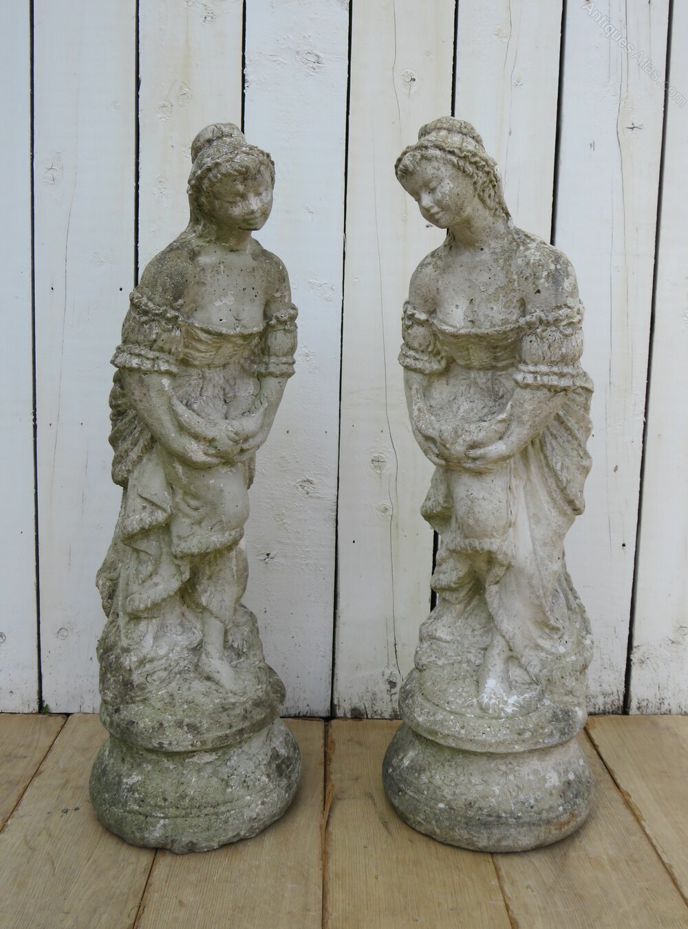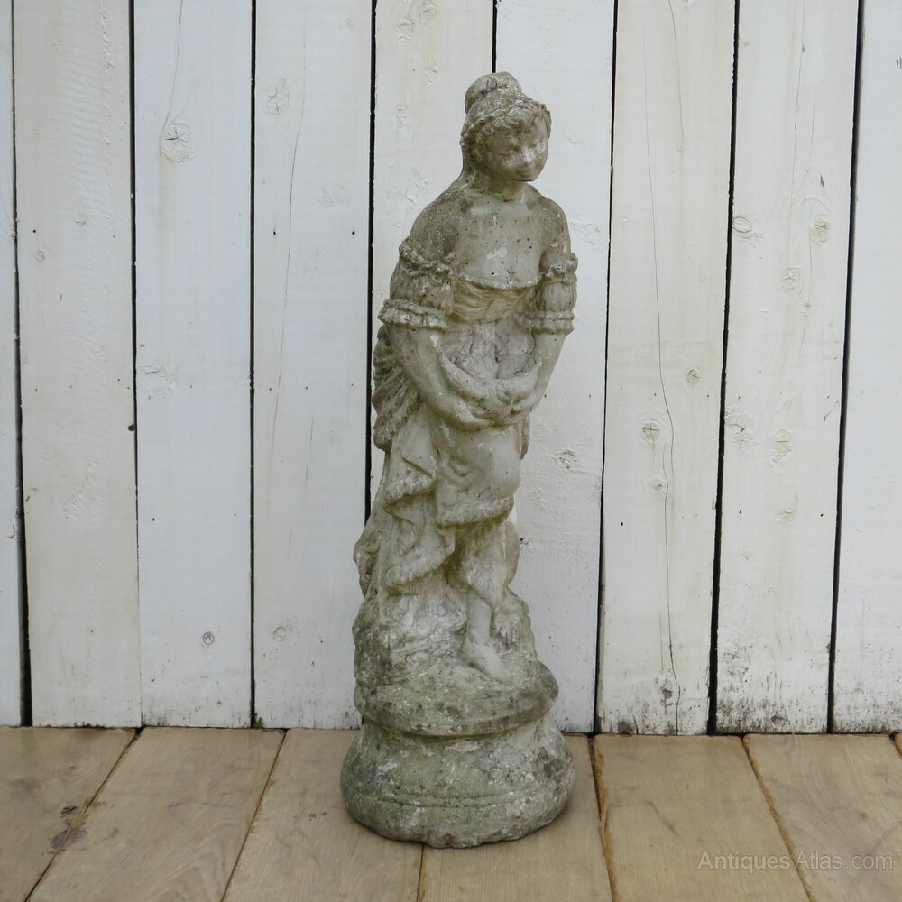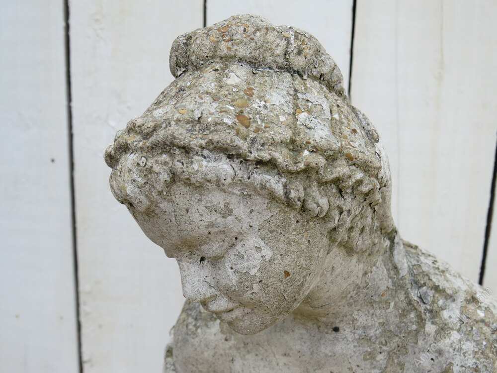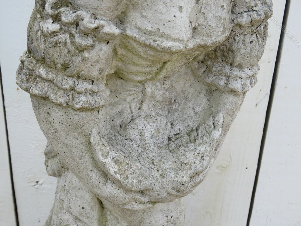 Vintage English decorative reconstituted stone statuary weathered garden maiden holding a dove statue. Two available.