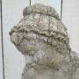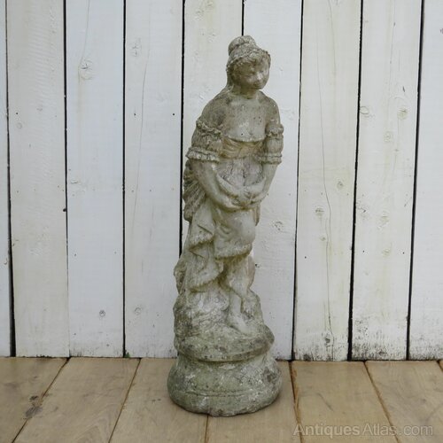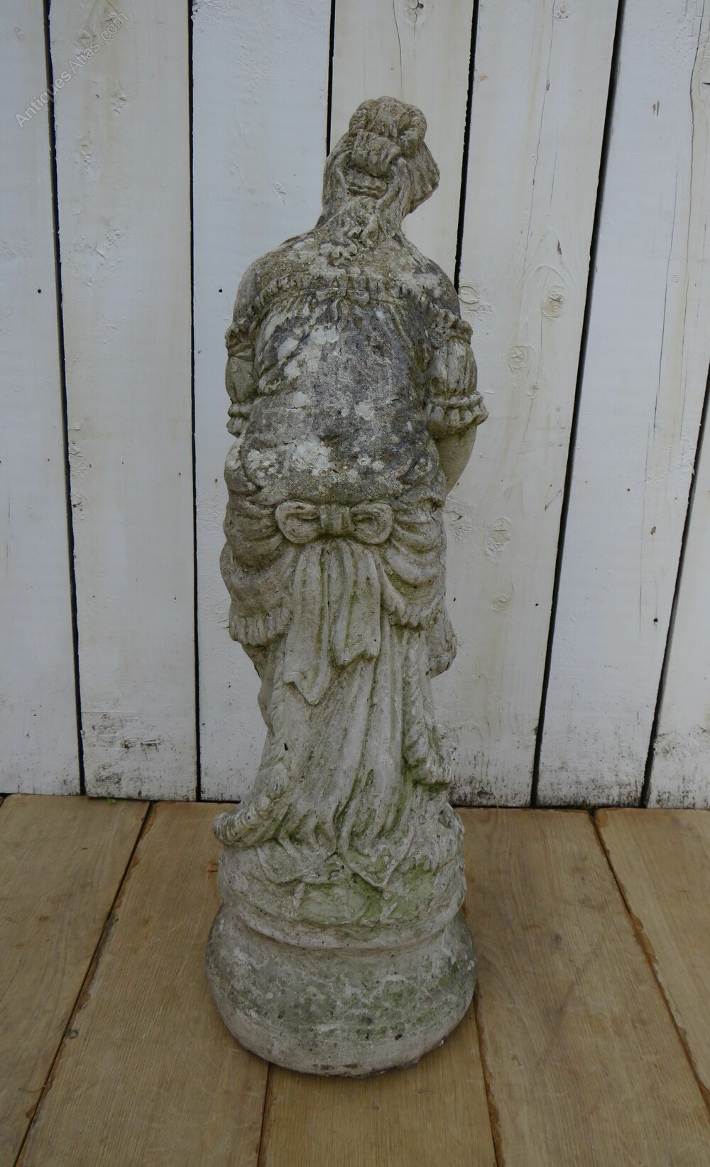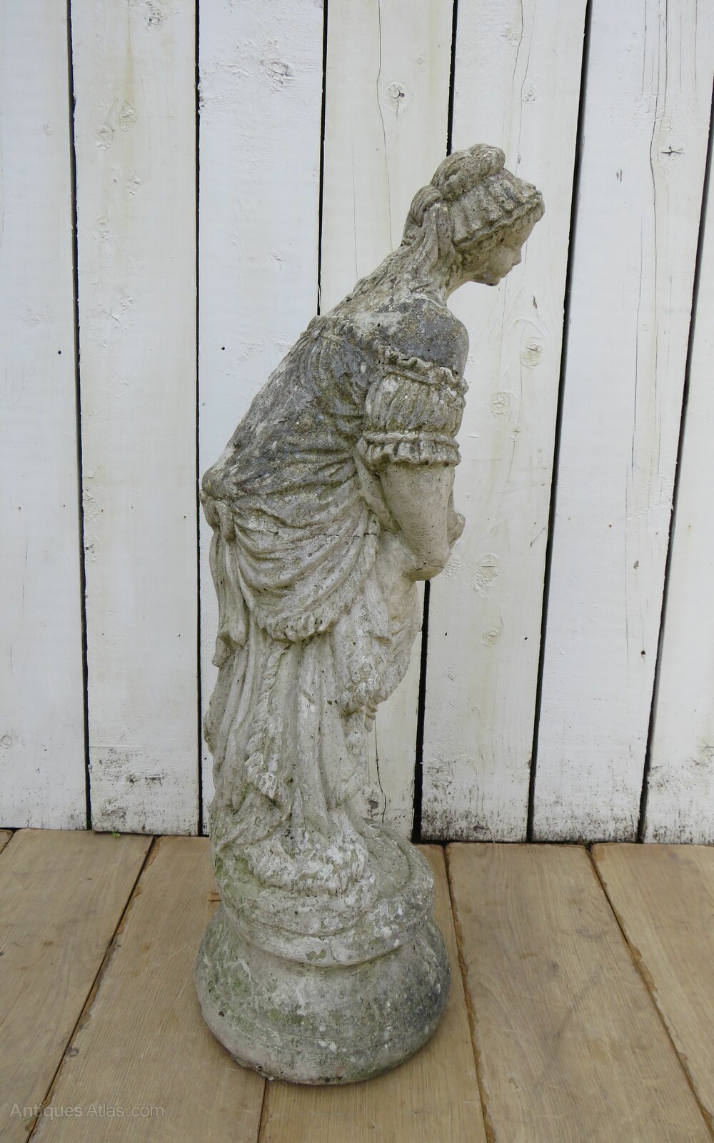 Vintage English decorative reconstituted stone statuary weathered garden maiden holding a dove statue. Two available.