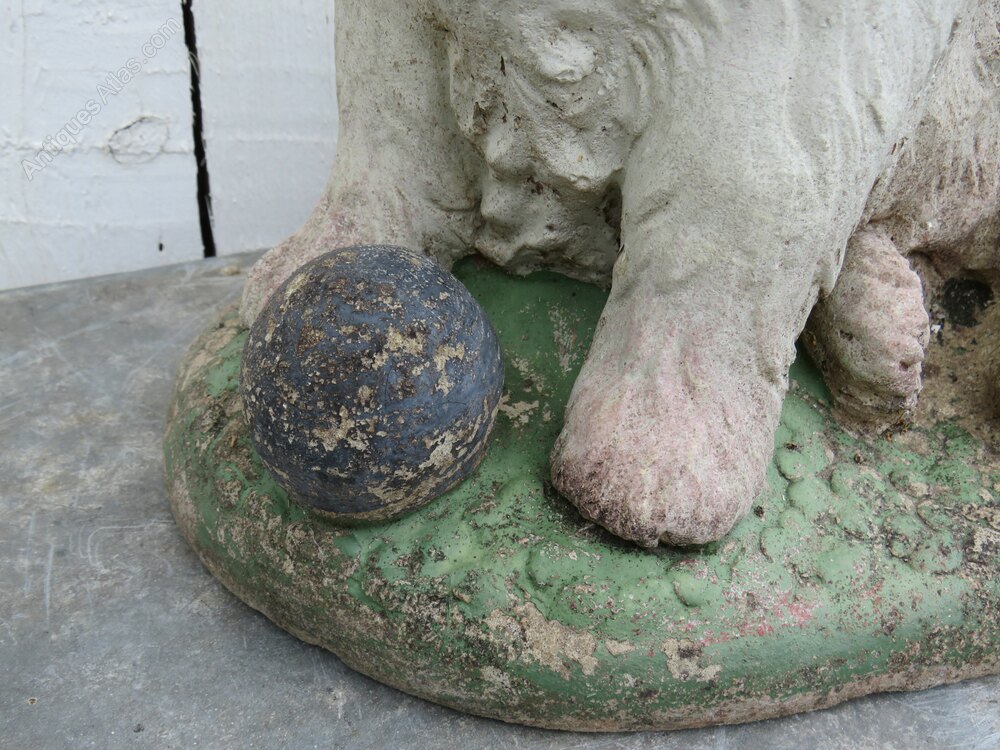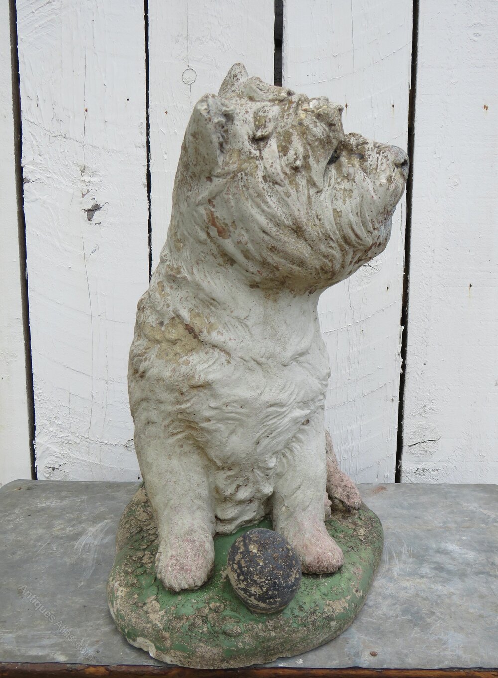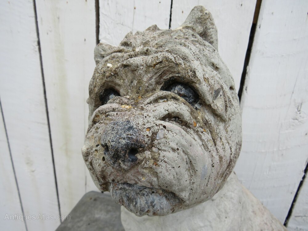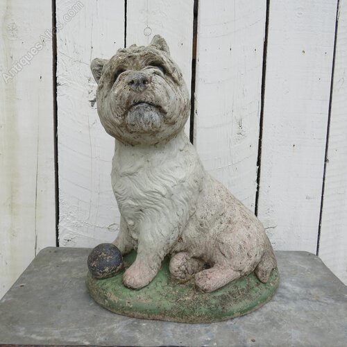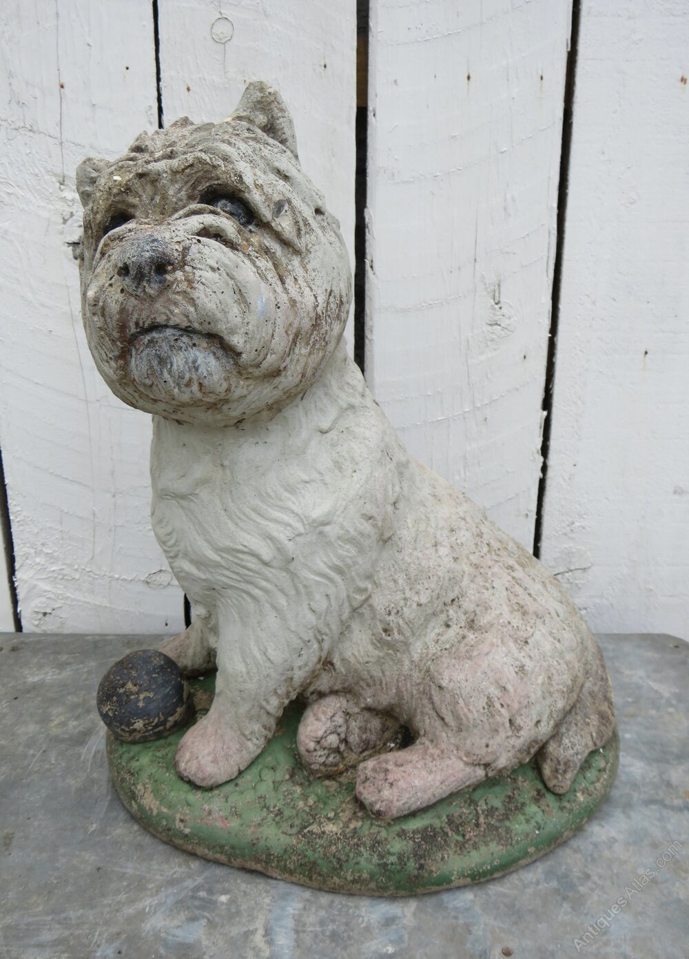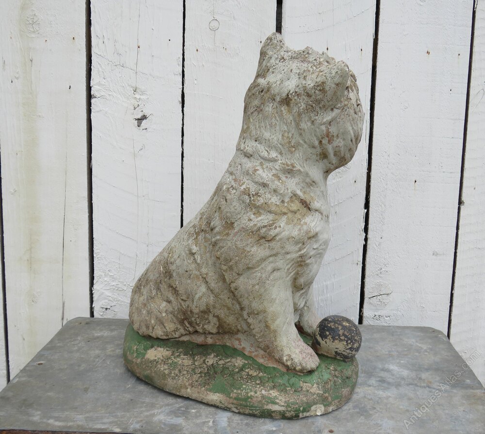 Vintage English decorative reconstituted stone statuary weathered garden dog ornament.