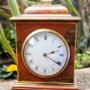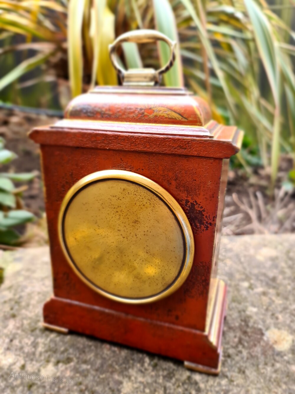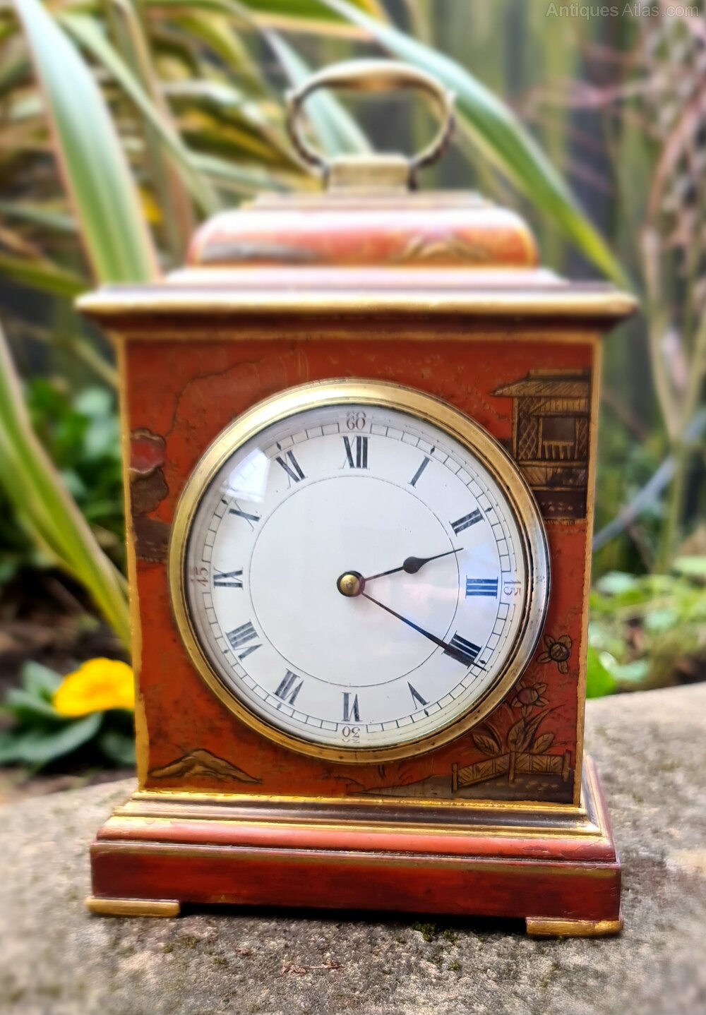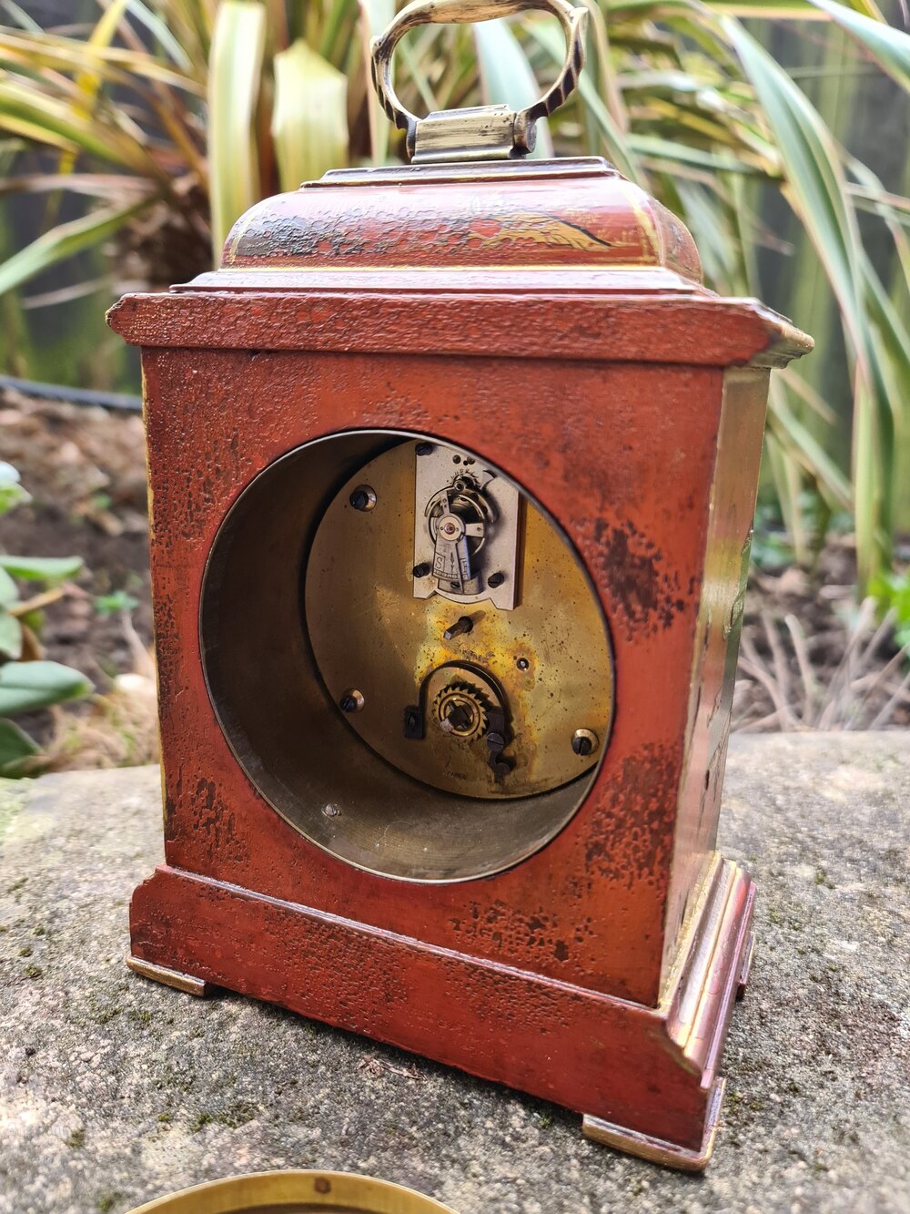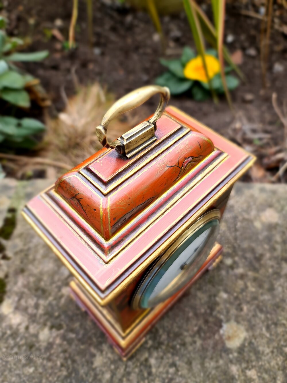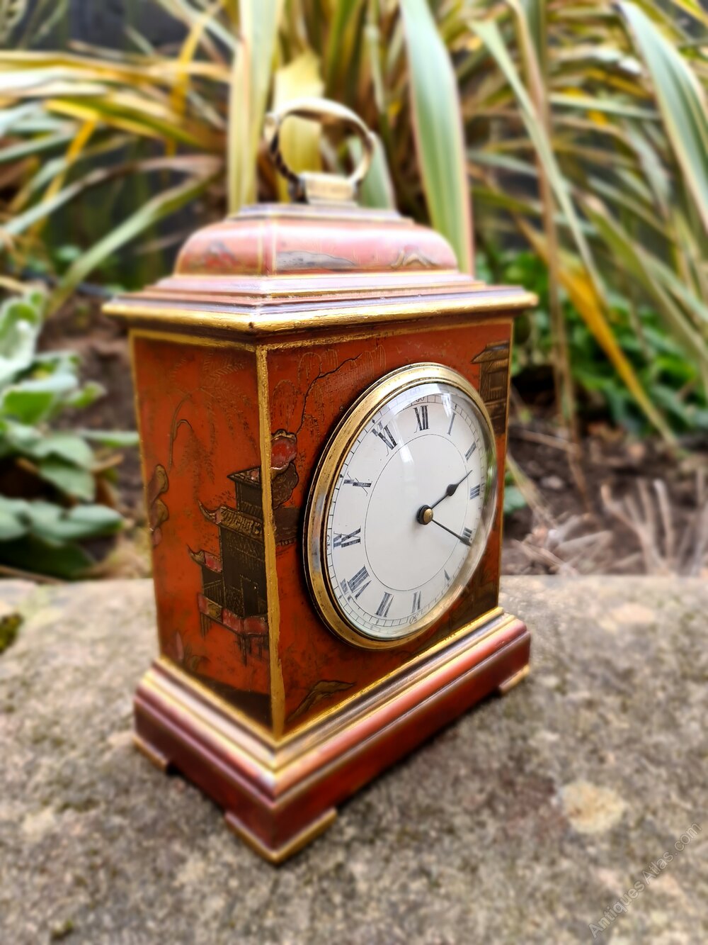 Circa 1930's caddy shaped mantel antique clock in subtle muted red Chinoiserie design. Good condition to the case with gilt highlighs, standing on gilt bracked feet. Winds from the rear, dial in good shape. A really neat antique clock, ticking away fine, a nice piece.