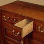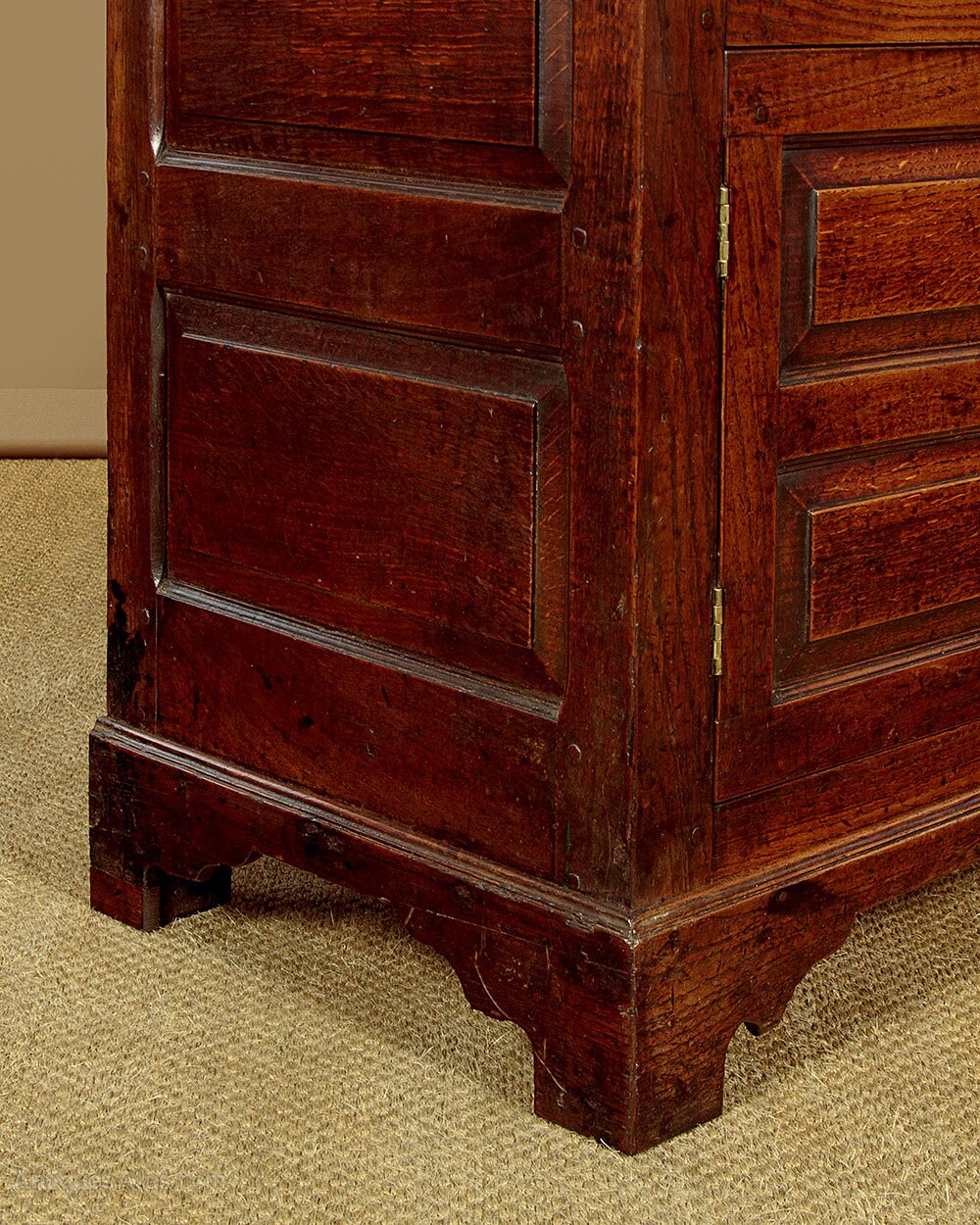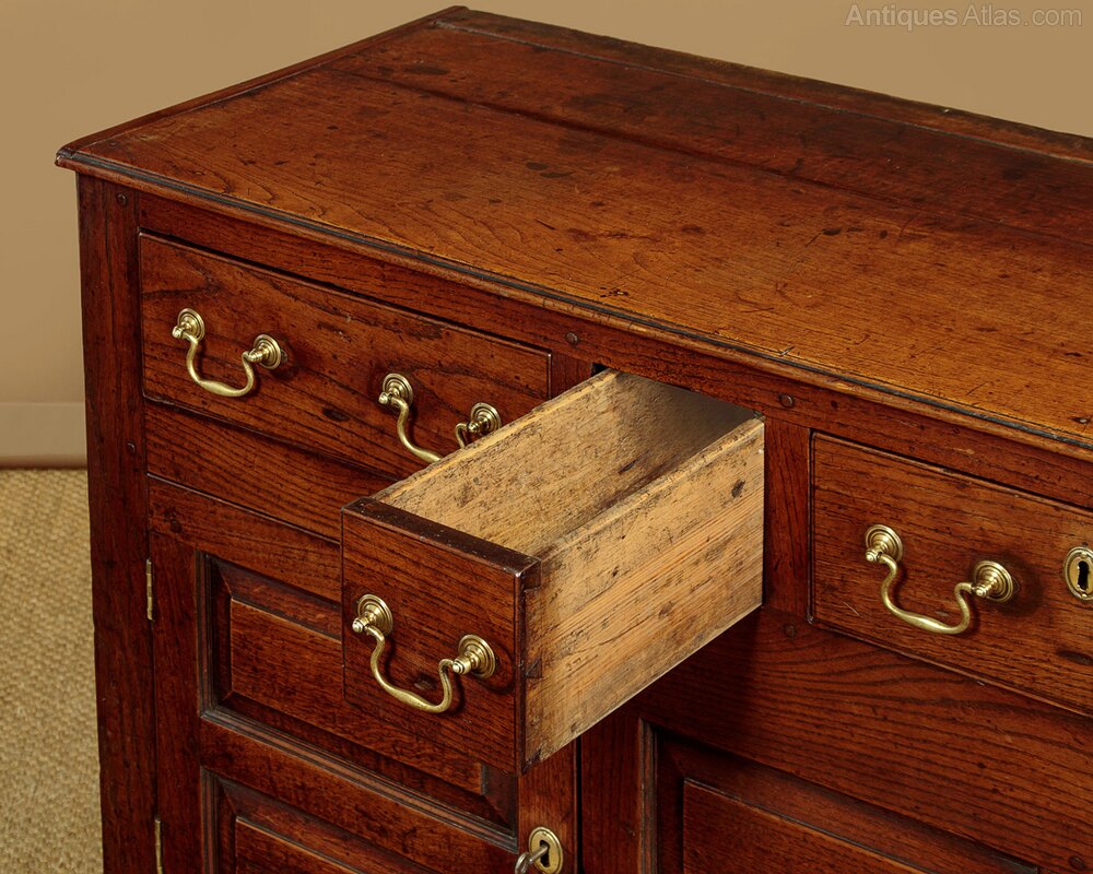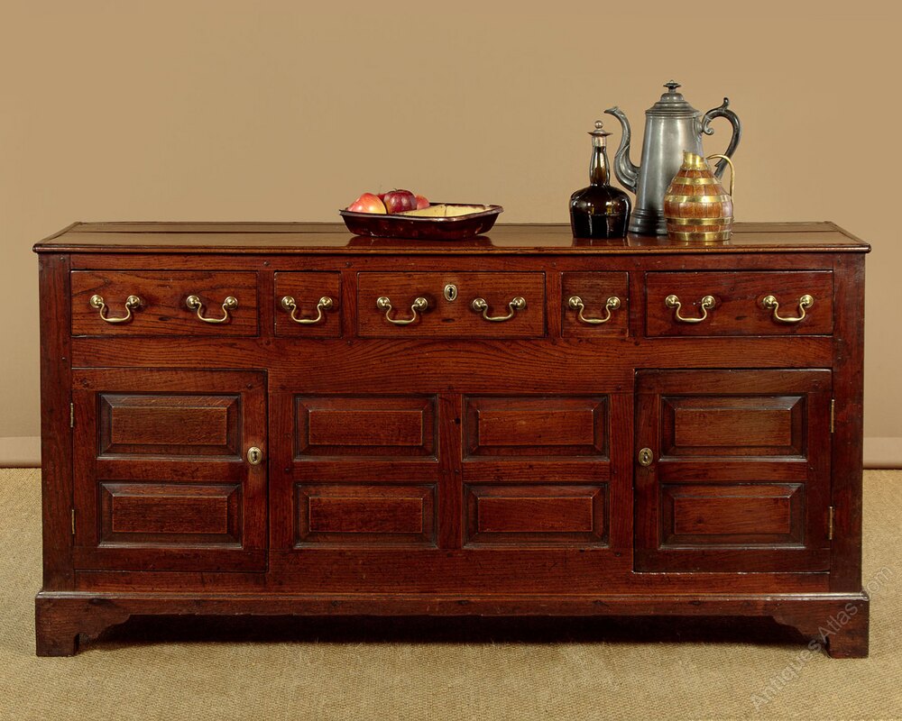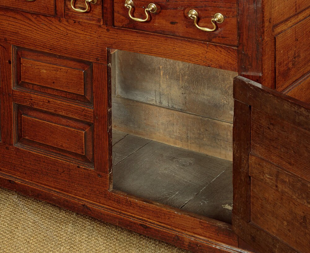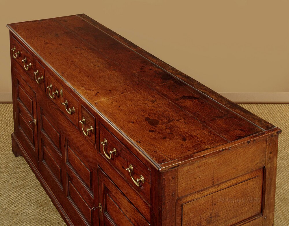 Late 18th.c. Welsh oak cupboard dresser base c.1770. Two plank top with a groove along the back edge to form a plate stand, a moulded front edge and cleated ends. Over an unusual configuration of drawers featuring two slim 'knife' drawers in between the three drawers of more normal proportions, all with brass swan neck handles. With two cupboards below (internal depth 16½") with a central divider between. Rectangular raised and fielded panels set within a moulded frame to doors and the centre and repeated in larger form on the sides. Moulded trim around the base and shaped bracket feet to the front and sides. Pine back panels, also (quite unusually) raised and fielded. Some old marks and wear to the top, generally excellent colour and condition, cleaned and waxed in our workshops. Keys supplied for both cupboards.