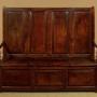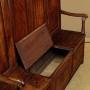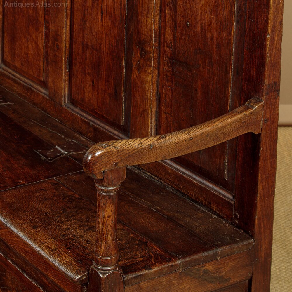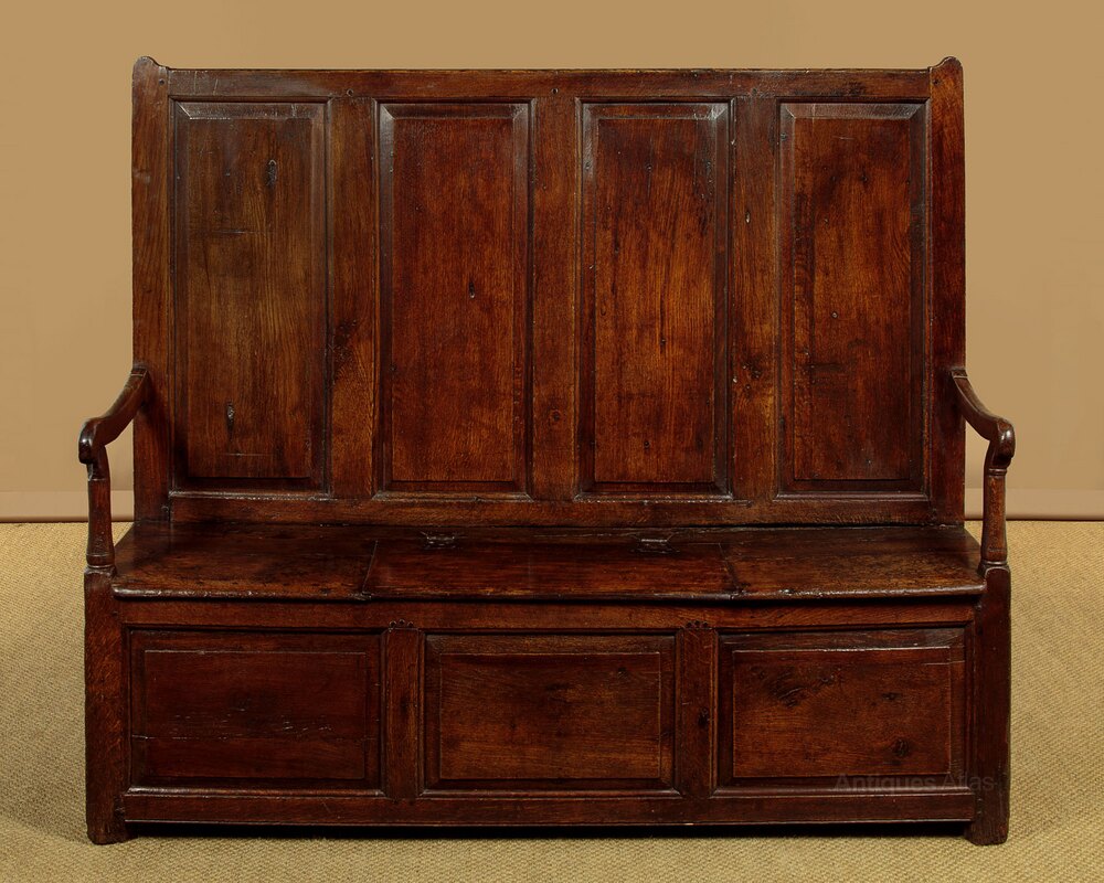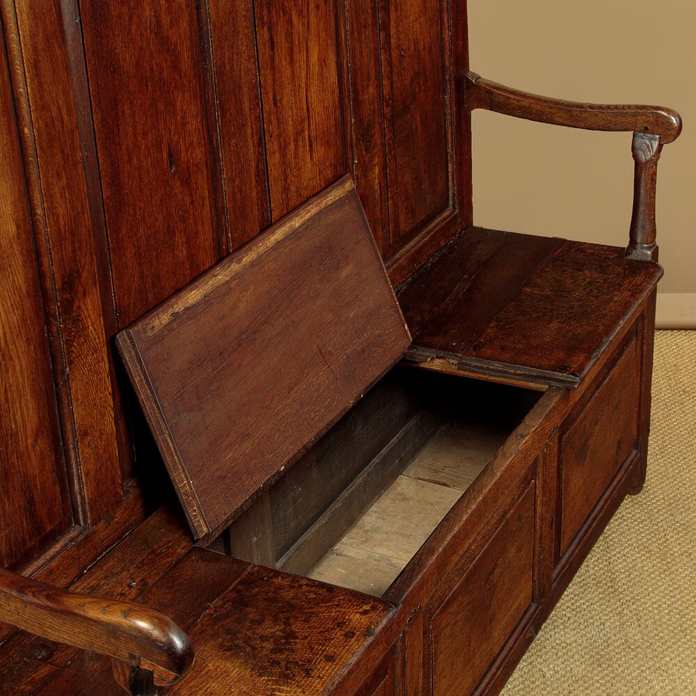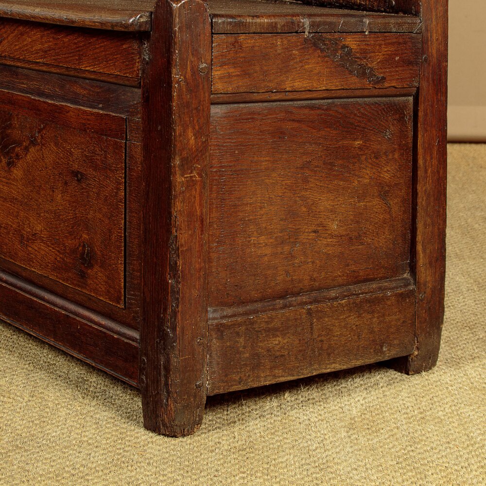 Mid 18th.c. Welsh oak box settle or hall seat c.1740. High backrest with four raised and fielded panels and a simple moulded edge to the surrounding rails and mullions. Shaped tops to the rear stiles and gently curving arms on turned supports. Over a board seat (height 18½"), the centre panel lifting on handmade iron hinges to reveal useful storage space below for boots and shoes etc. Three raised and fielded panels below the seat, flat panels at the sides, again all with a moulded edge to the surrounding timbers. Oak back panels. lovely colour and character, note the pegged joints and the little burn marks on the backrest panels caused by candle flames. Excellent condition, restored cleaned and waxed in our workshops.
