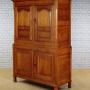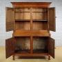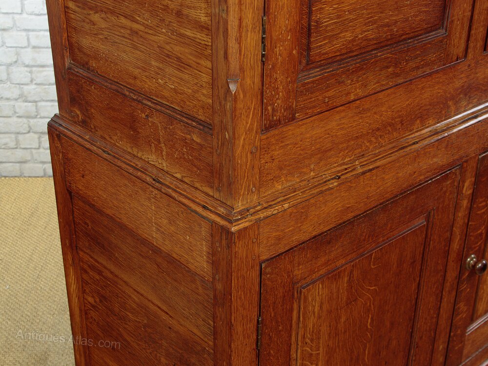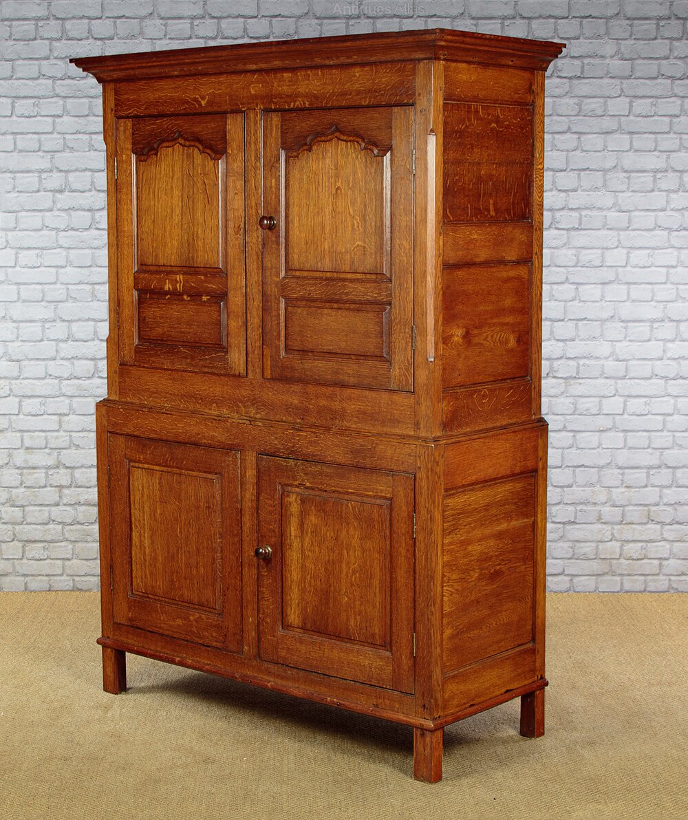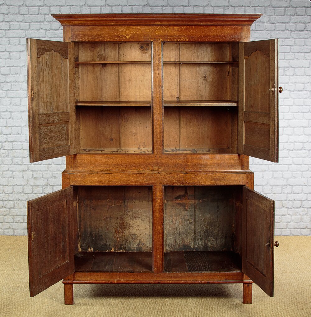 Very useful early 19th.c. Welsh oak kitchen cupboard c.1810. In two pieces, the upper section fitted with one full depth (17½") shelf plus a shallower shelf above, over a slightly deeper cupboard base (internal depth 19"). Moulded cornice over lovely ogee arch shaped raised and fielded panels to the upper doors. Square lower panels, also raised and fielded and with moulded surround. Wooden knobs, ogee moulding at waist, and a simple thumb moulding around the base. Raised on the original long stiles. Oak panelled sides, deal back boards. With a repair to the bottom left hand corner of the right hand upper door. Otherwise very good colour and condition, cleaned and waxed in our workshops.