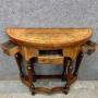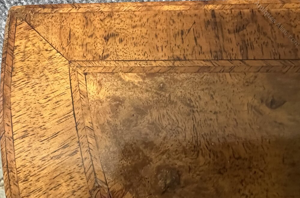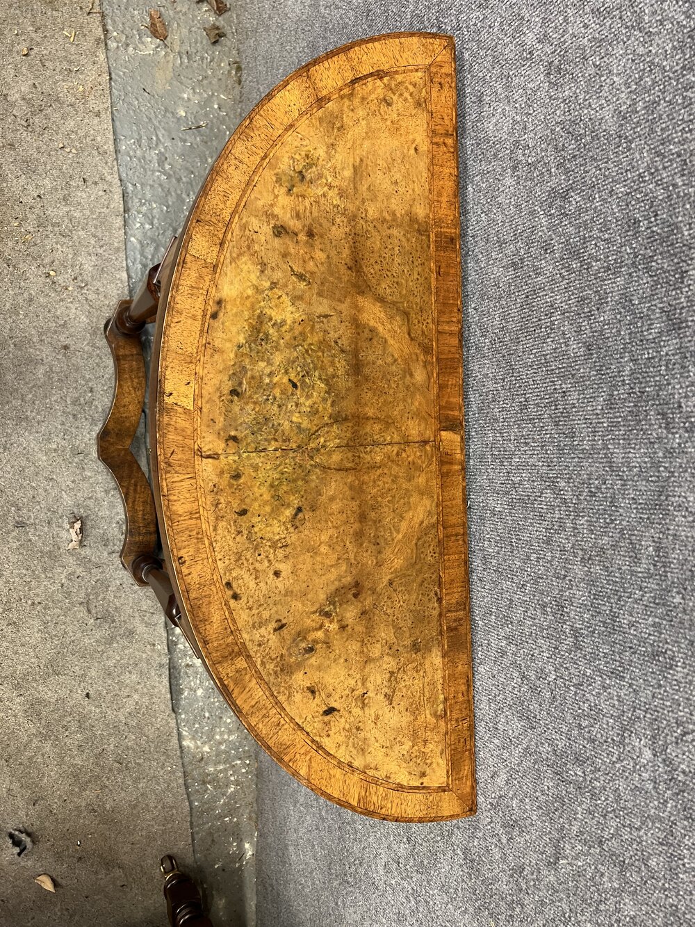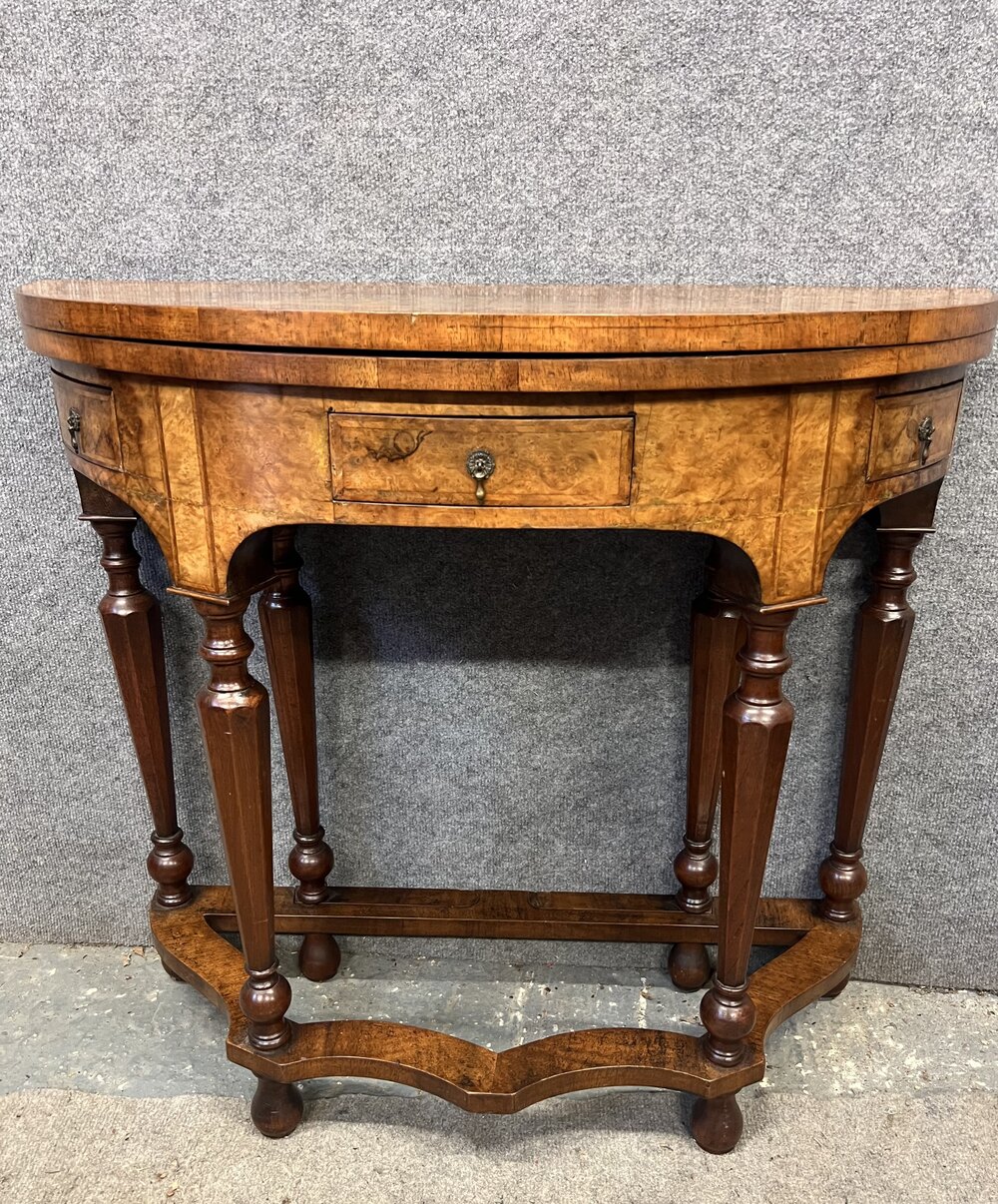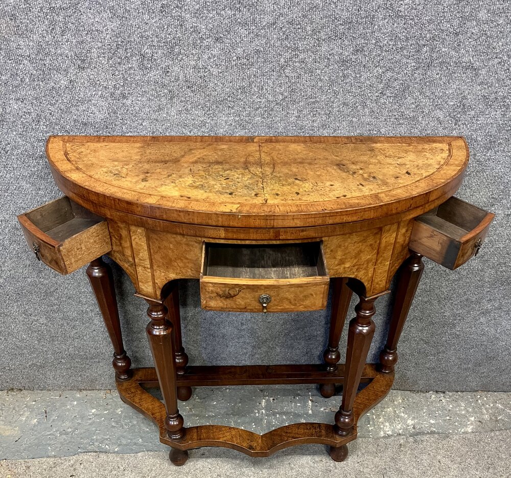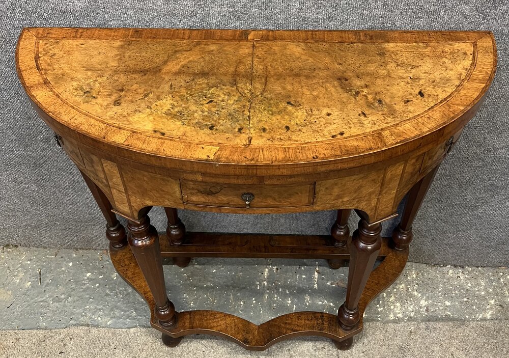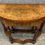 An attractive William and Mary style credence table in burr walnut. The book matched top having cross banded edge between 2 lines of herring bone inlay. The top opens to a polished interior and is supported on 2 hinged gate legs.Below are 3 frieze drawers all having herring bone inlay and brass drop handles with oak linings. The table is raised on 6 turned, tapering and flat sided legs all joined with shaped stretchers and standing on bun feet. Condition- Good and original. Dimensions:- Height…28.5’’/ 72.5cm. Width…31’’/ 79cm. Depth…12.25’’/ 31cm. Open Depth…24.5’’/ 61.5cm. Delivery to most of U.K. £48.