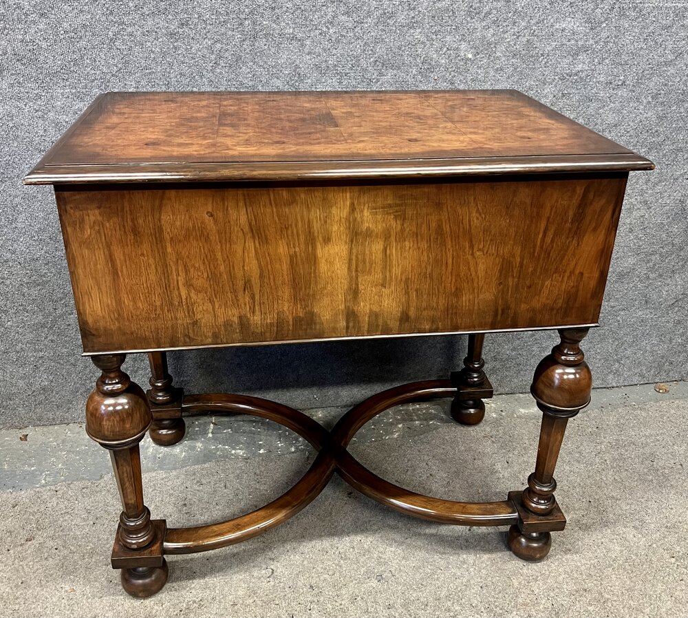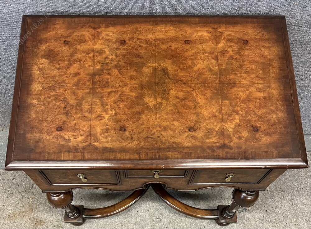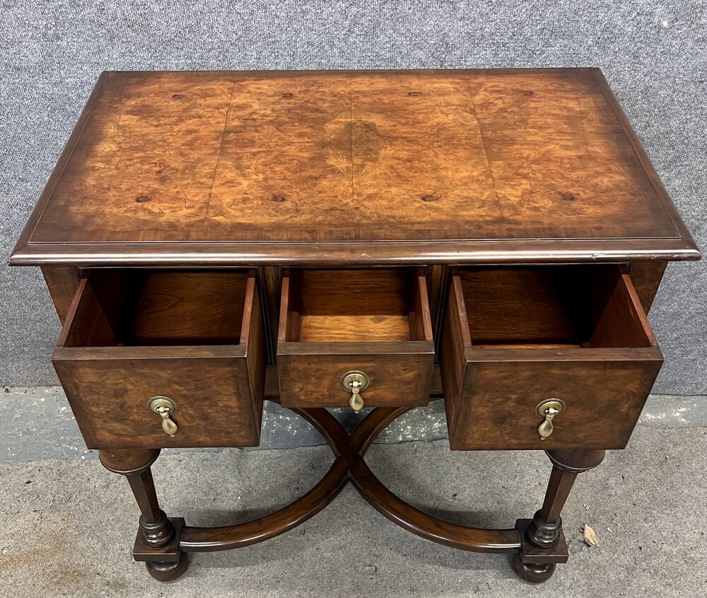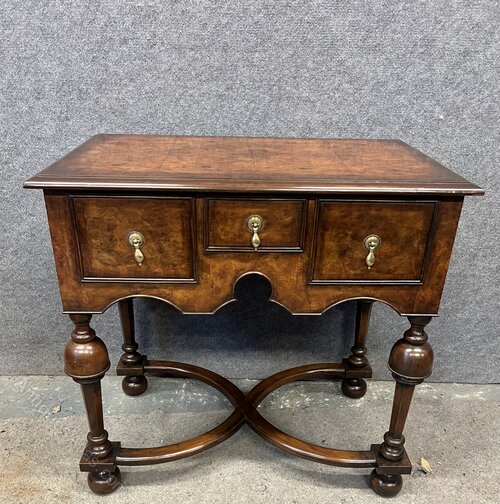 A good quality freestanding William & Mary style burr walnut low boy. The book matched top having a cross banded and moulded edge above a small centre drawer flanked by 2 larger drawers all having cross banding and cock beaded frames with brass pear drop handles. Below a shaped and cock beaded frieze leading to cup and cover turned legs with flat sides and joined by shaped “X” frame stretchers and raised on turned bun feet. Condition- very good with solid mahogany linings. Dimensions:- Height…30''/ 76cm. Width…31.5''/ 80cm. Depth…19.75''/ 50cm. Delivery to most of U.K. by antique furniture carrier £50.