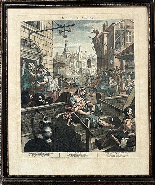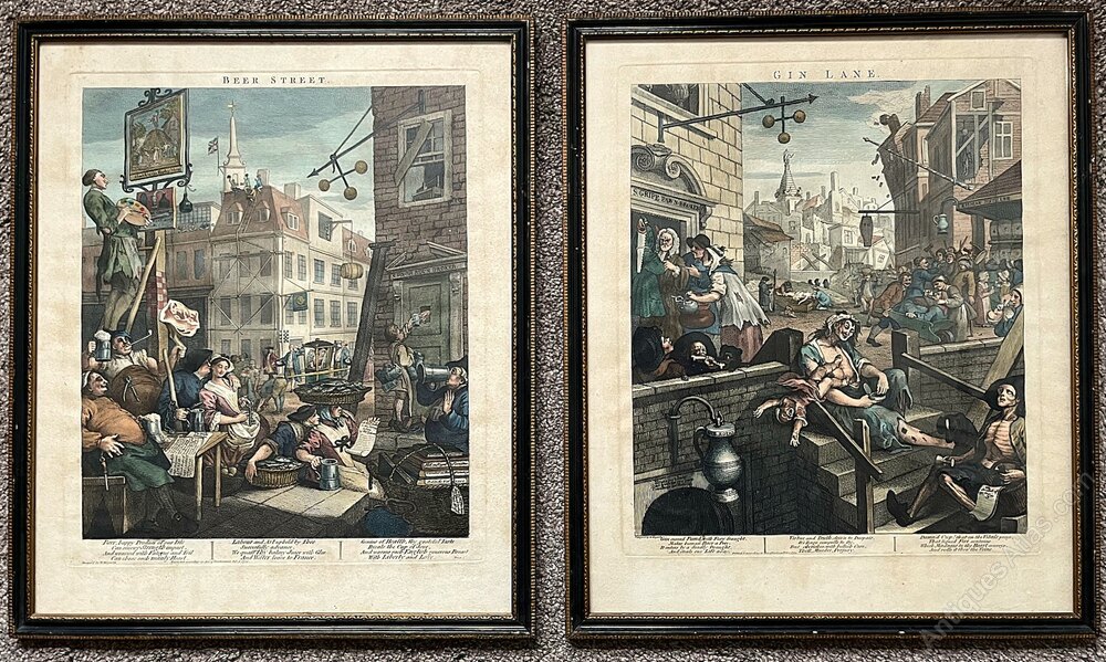 Two Antique hand-coloured prints after William Hogarth dating to the early 1800s. The two prints are of possibly Hogarth's most well known and sought after etchings Beer Street and Gin Lane. They come in good quality Hogarth frames each measuring 48.8 x 41.1 cm. Judging by the label to the rear of the frames, the prints were put into these frames in the 1970s. As can be seen in the photos, both prints are in good condition with some spotting but retaining good, vibrant colouring.
