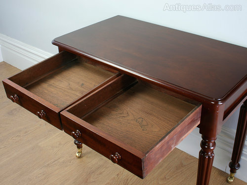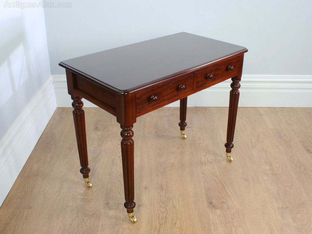 This is an attractive and superb quality antique William IV mahogany side table, circa 1830 – 1840. The table is stamped “Kerby, New Oxford Street, London, no. 615” on the top of the drawer which would have been attributable to the cabinet maker of this table. The table features a stunning rich mahogany colour formed from a single piece of mahogany with a thumb moulded edge. Below, sits two working drawers which feature turned mahogany turned knobs. The drawers also feature mahogany drawer linings, which have been hand dovetailed (sign of quality). The table sits on four stunning tapering reeded legs, which terminate on brass collars and brass castors. This table is a truly classic design from the William IV period. All in all, this is a very pretty and superb quality table.