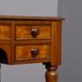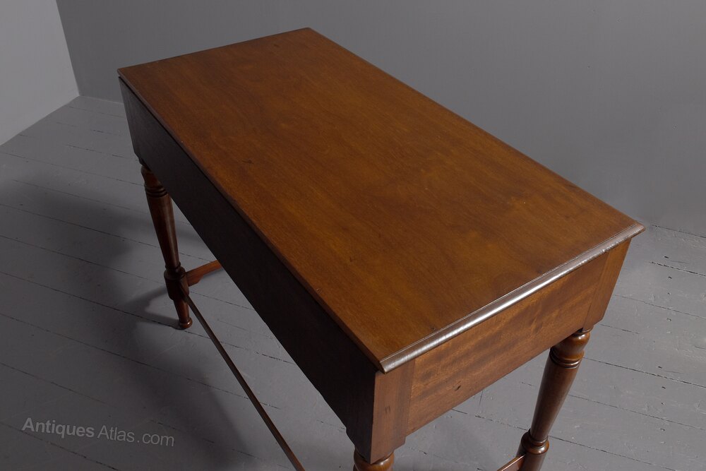 Circa 1840, William IV figured Spanish mahogany hall/side table. The figured rectangular shaped top with a moulded edge sits over 4 short and one long, mahogany lined frieze drawers, with moulded edges and a Bramah lock on centre drawer. Supported by very fine baluster and ring turned supports with three quarter stretchers.