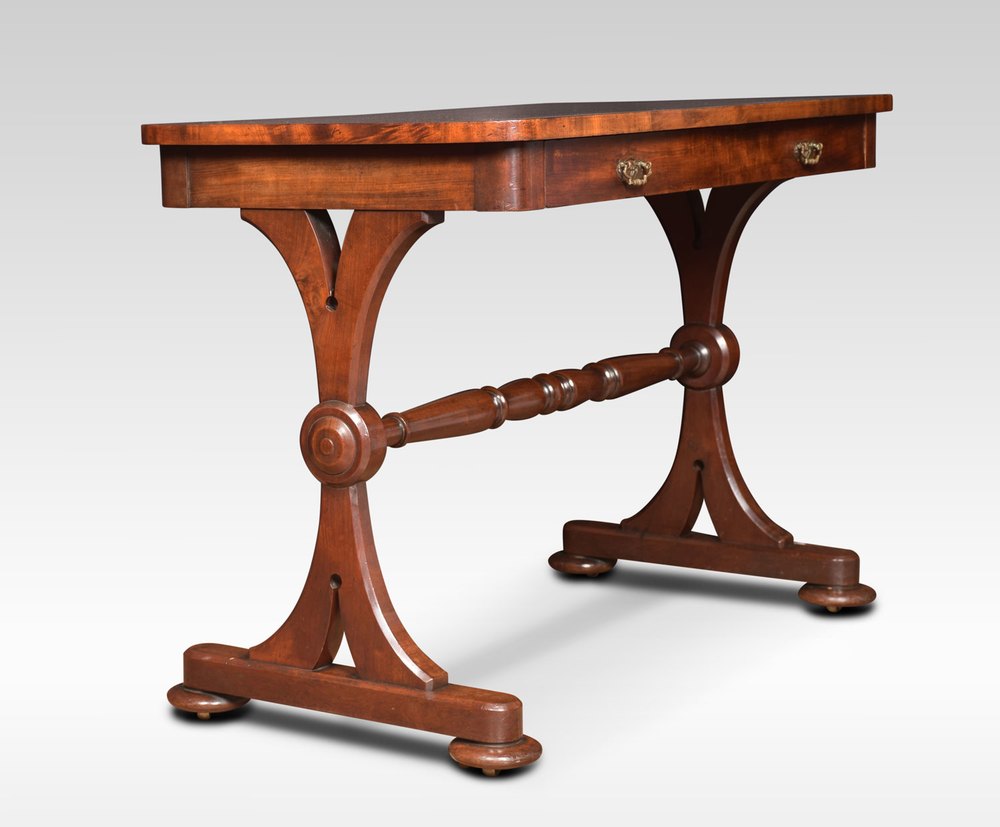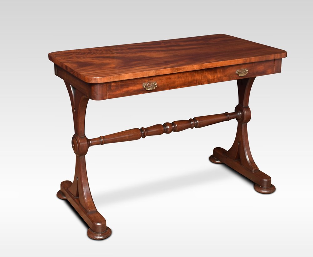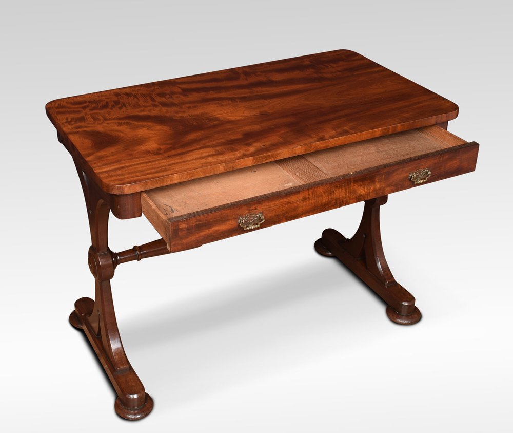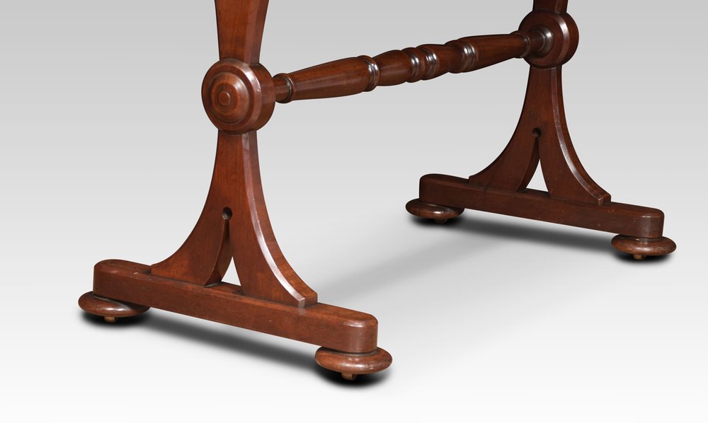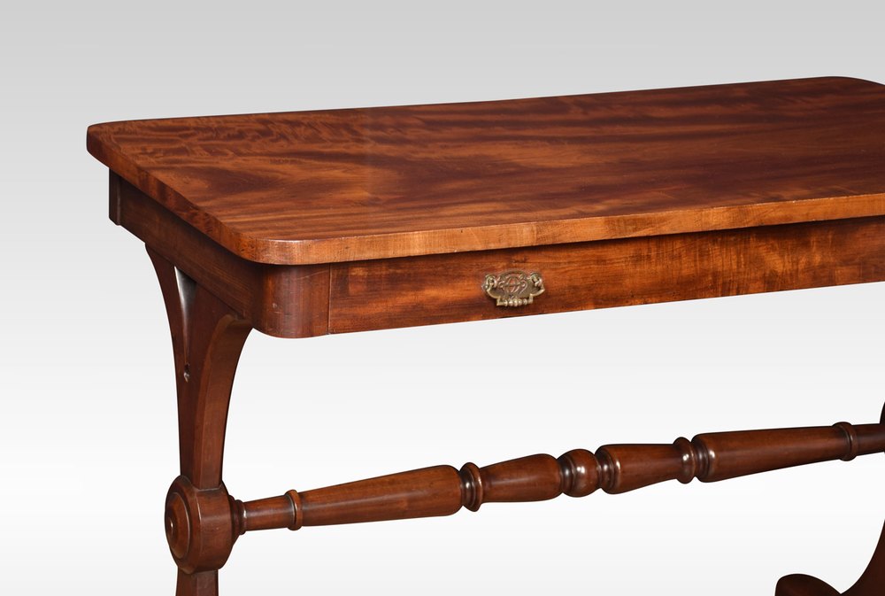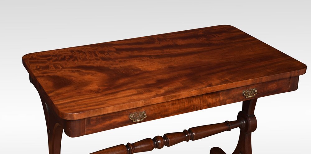 William IV side table, the large rectangular figured mahogany top above freeze draw fitted with brass handles. All raised up on twin end supports united by stretcher. Terminating on bun turned feet with original castors.