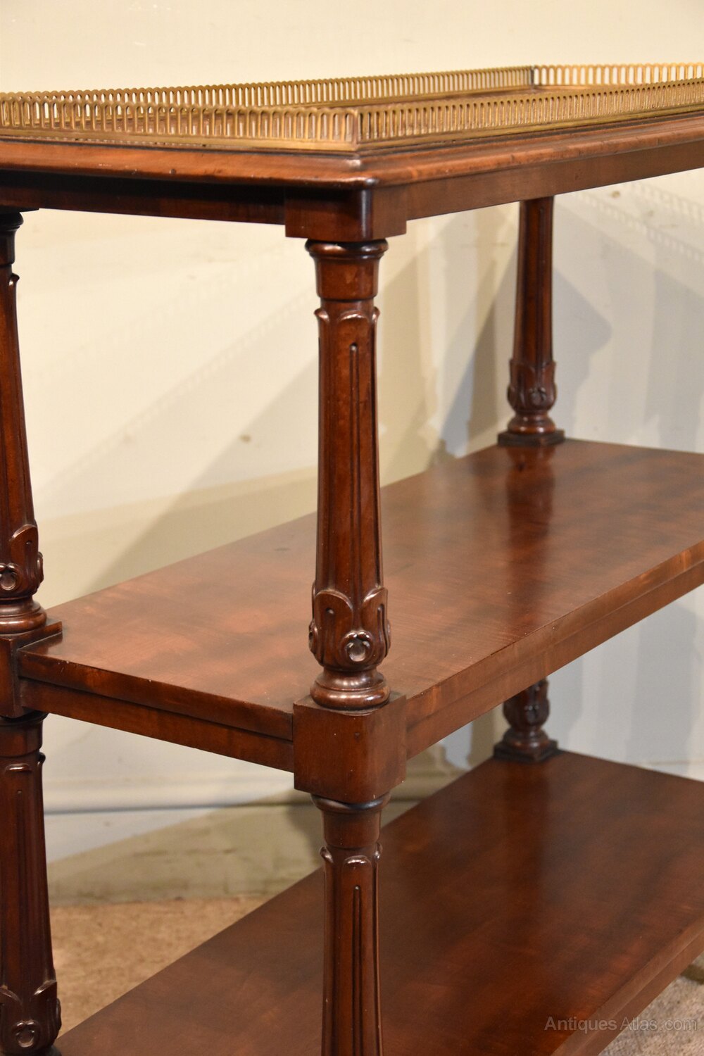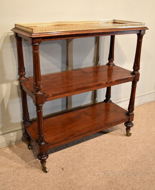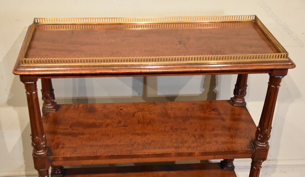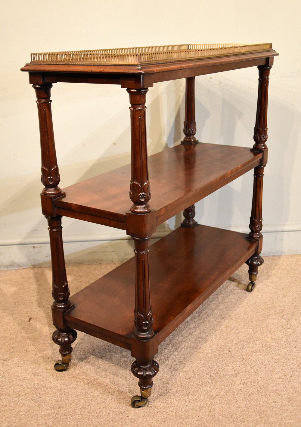 A fine quality William IV mahogany three tier whatnot with well carved and fluted turnings raised on castors with alter brass gallery.