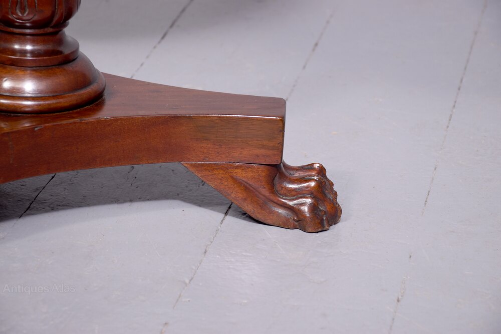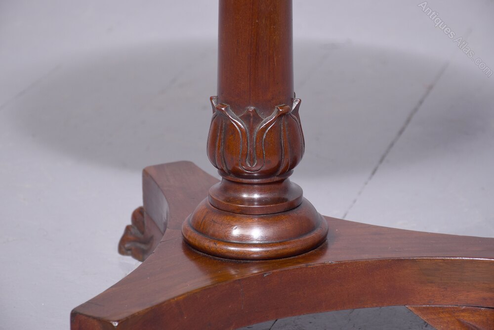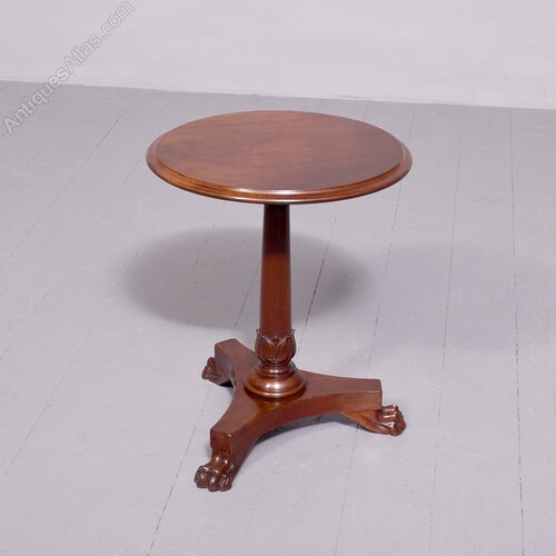 Circa 1830 with alterations. Neat-sized William IV mahogany wine/occasional table on platform base. The circular top in figured Spanish mahogany with a molded edge supported on a tapering column with fine acanthus carvings above a turned collar over a tripartite platform base on lion-claw feet. Quality and functional item,.
