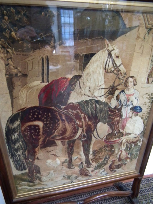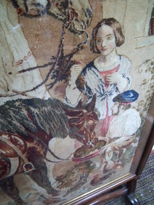 Circa 1840, finest quality William IV rosewood fire screen with a hand embroidered equestrian scene, acanthus carvings to top of the screen, standing on finely carved claw supports connected by a curved stretcher.
