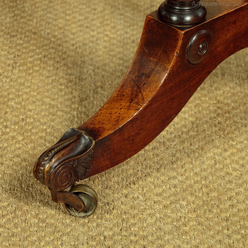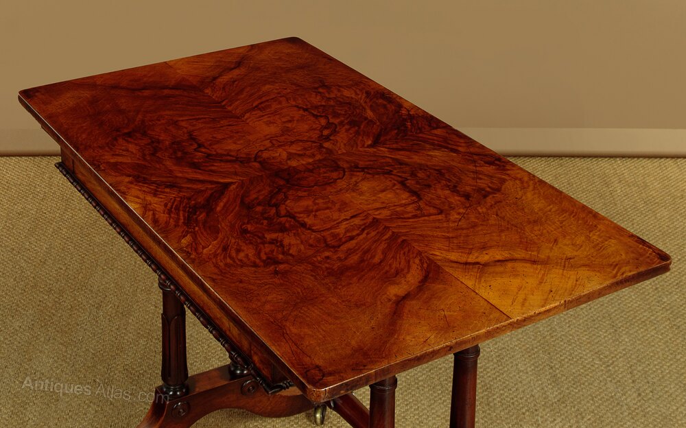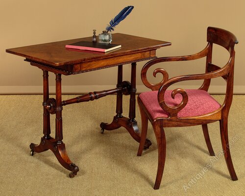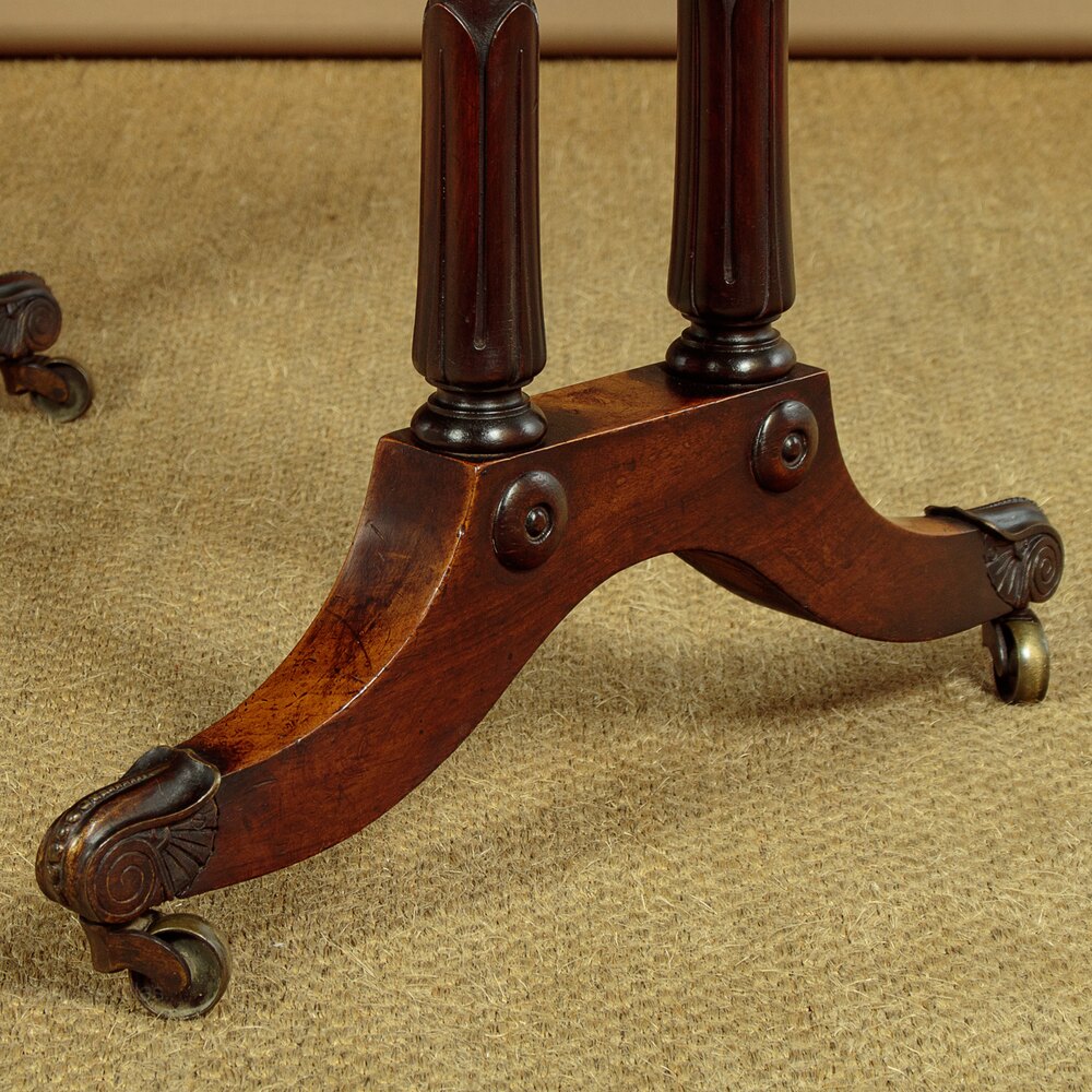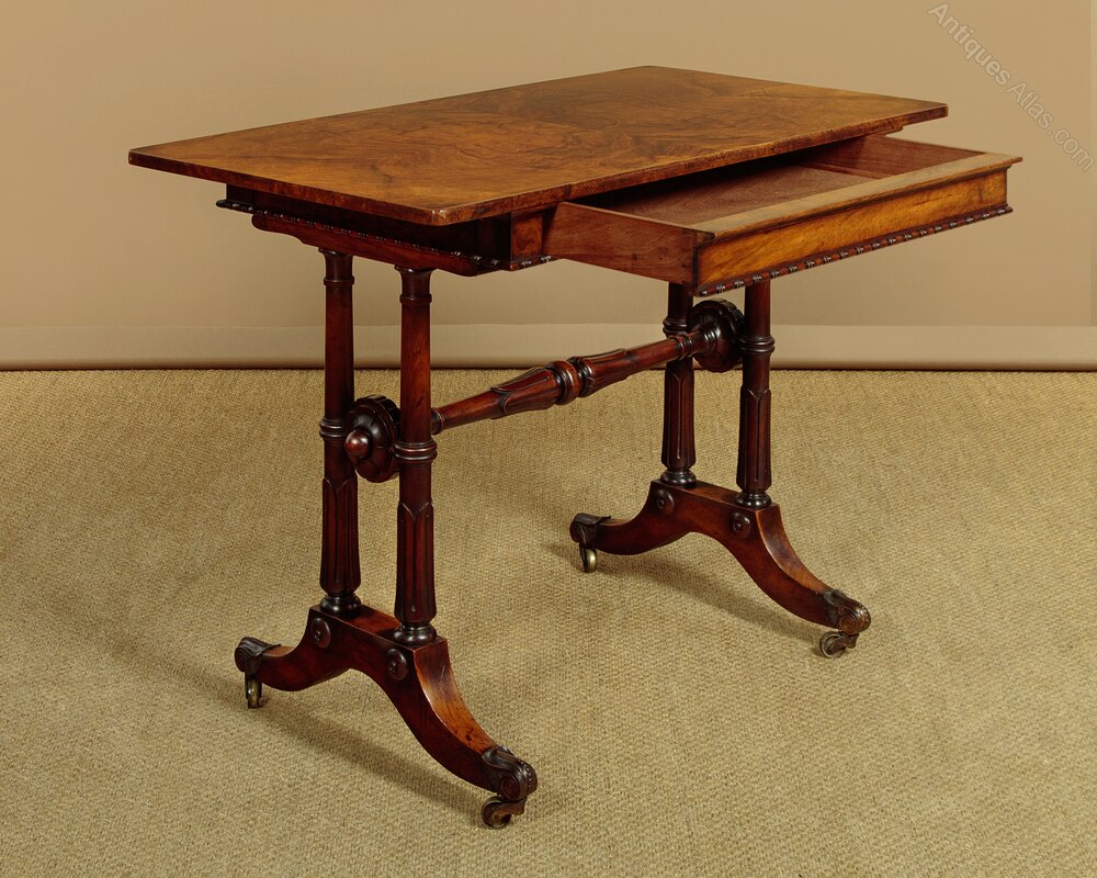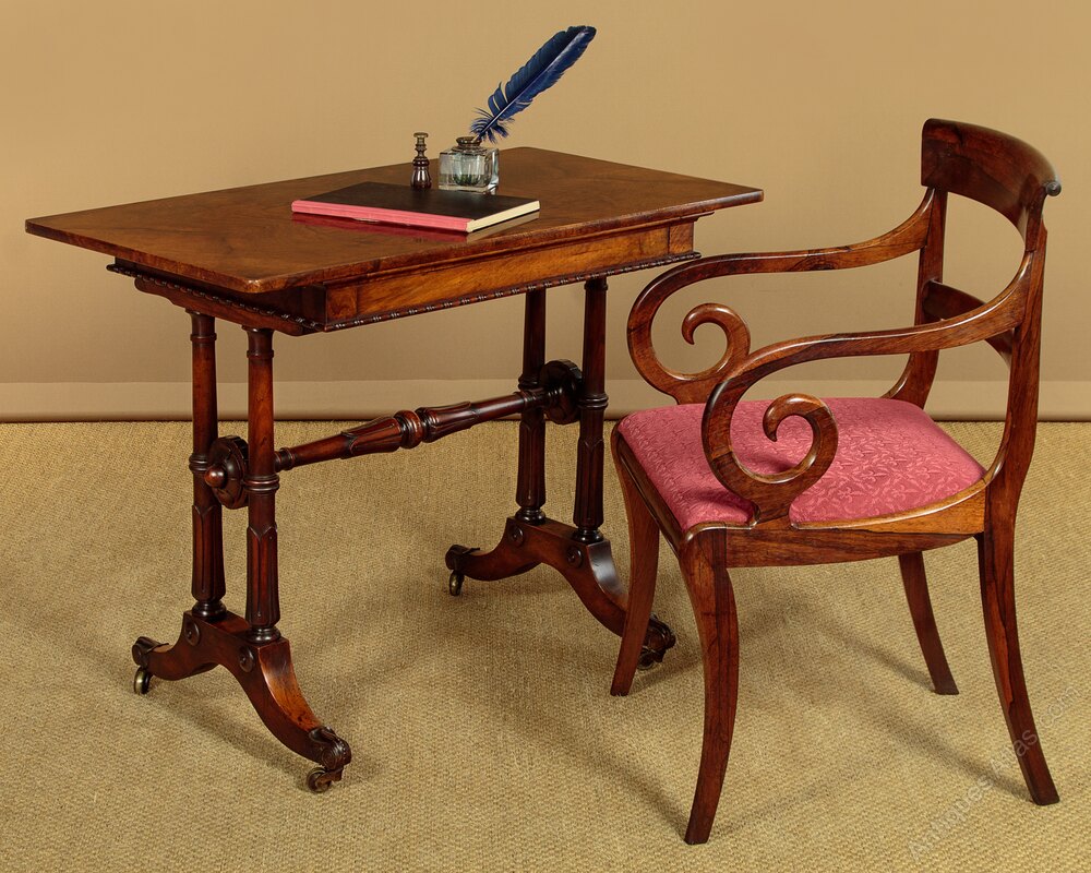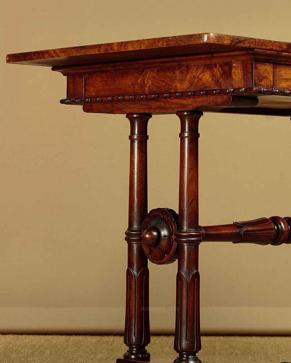 Superb quality William IV walnut writing or table c.1835, attributed to the acclaimed London cabinet maker George Seddon. Beautifully figured walnut veneers to the top, arranged to form a quartered symmetrical pattern. Over a slim mahogany drawer, the polished walnut veneered front and unusual carved moulding to the bottom edge continued on the sides and rear of the table. Raised on pairs of turned column legs with papyrus leaf carving, joined with a turned stretcher (set high to allow the table to be sat at easily) with carved roundels to the terminals. Swept feet front and rear, on the original brass castors with superb and very distinctive cast brass toes. Serial number stamped inside the drawer. Excellent colour and condition, cleaned and waxed in our workshops.