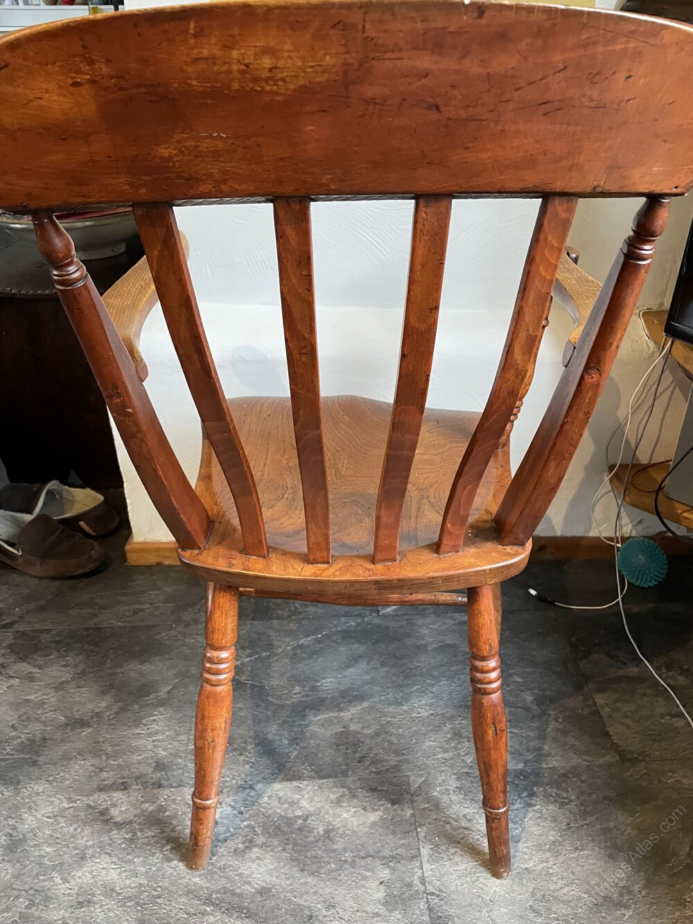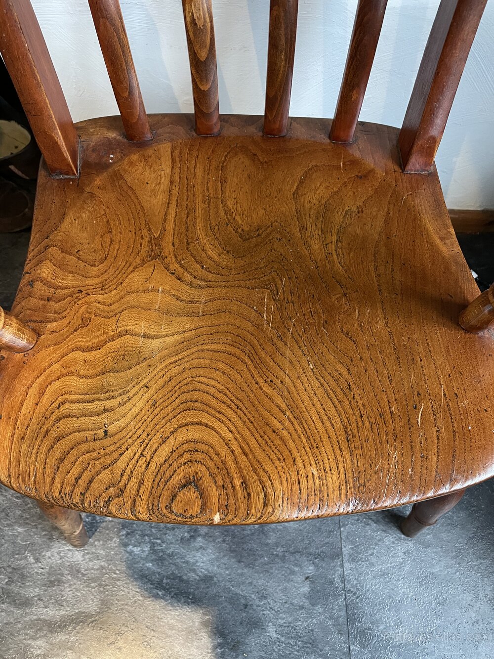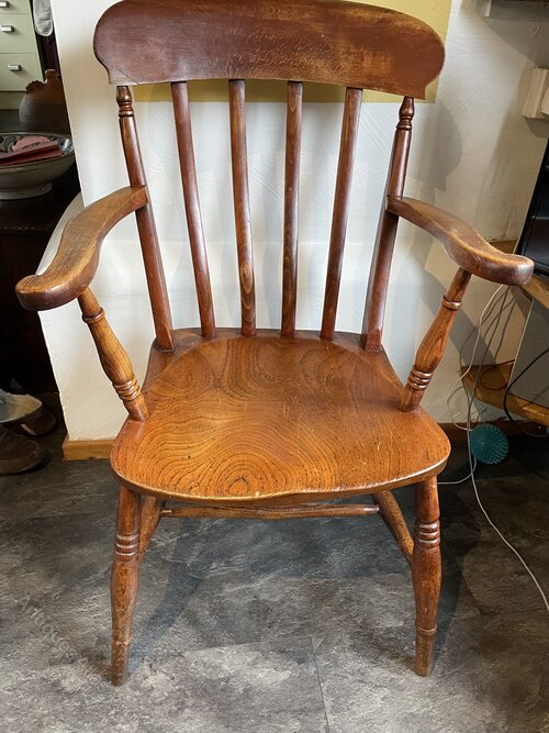 A low backed Windsor chair with elm seat .
