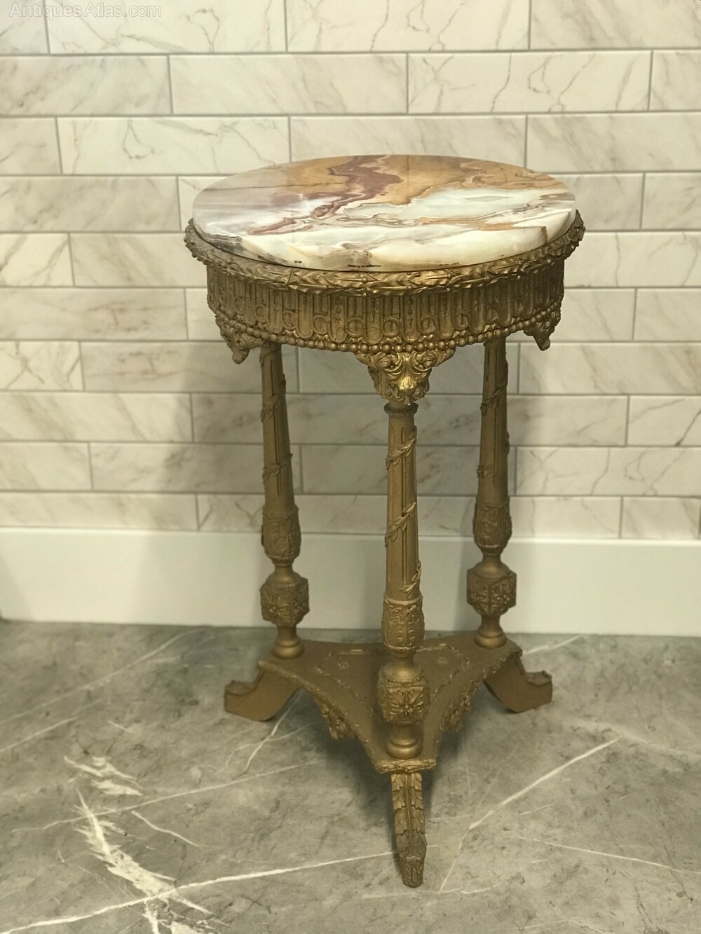 19th French Pedestal Wine Table with round 1” inch thick veined Onyx polished top made with cultured marble and standing on three turned wooden columns decorated with flower mouldings and finished in gilt.
