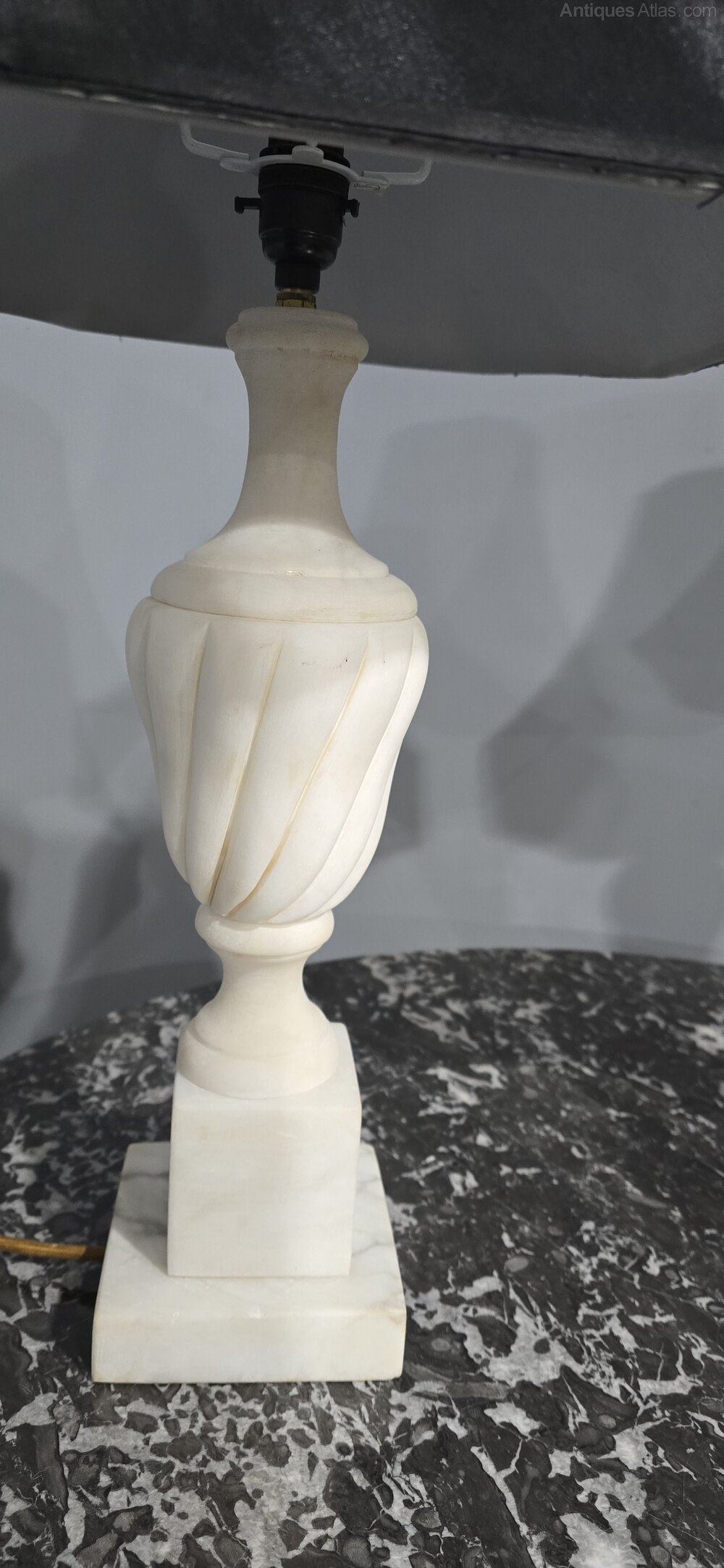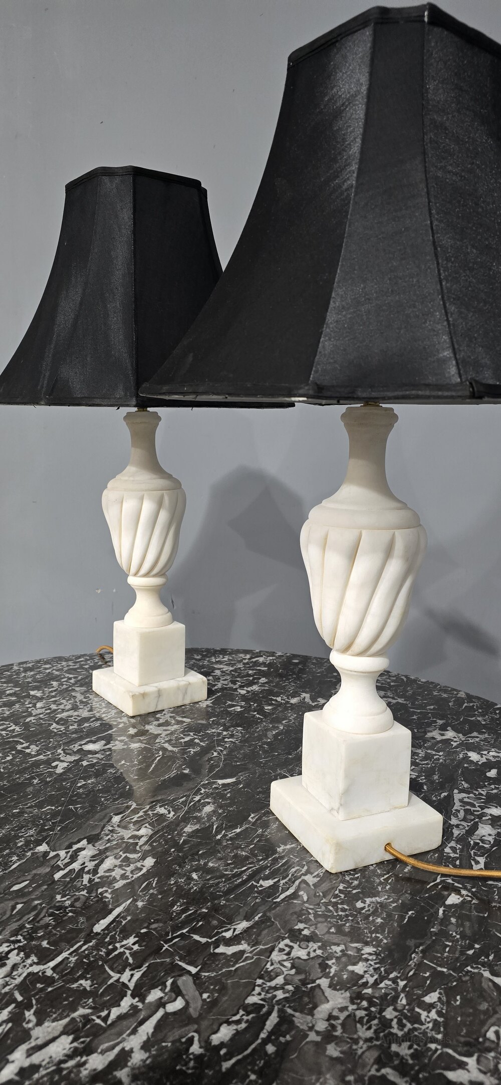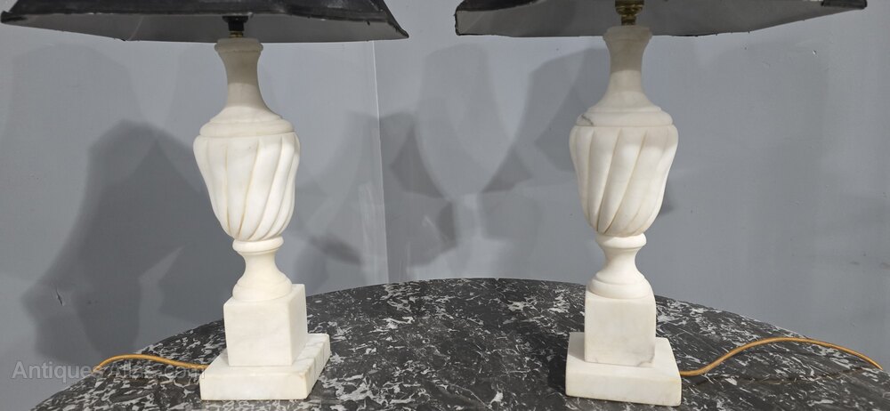 A large pair of French white marble table lamps, with carved spiral bodies, rewired with gold flex, an black solk light shades, in excellent overall condition.