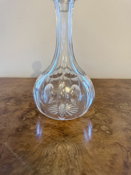 Wonderful quality antique Edwardian glass decanter having a quality antique Edwardian glass decanter with fantastic cut glass detail and the original circular shaped cut glass stopper.