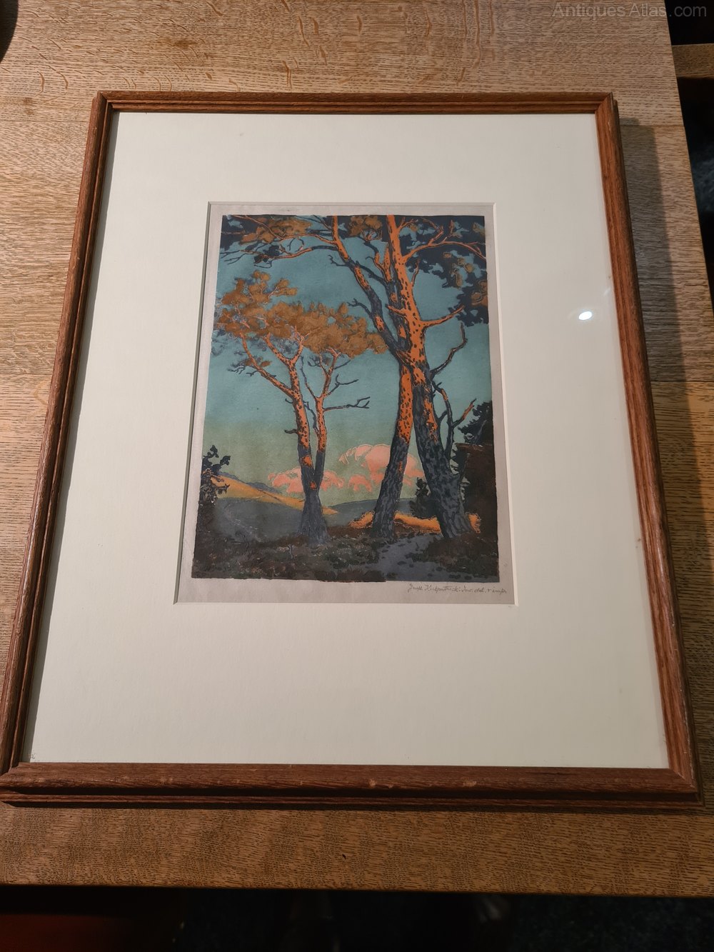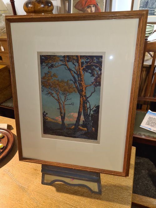 A simply beautiful woodcut of trees and clouds in the evening light. The artist has captured warmth and movement in this difficult medium.