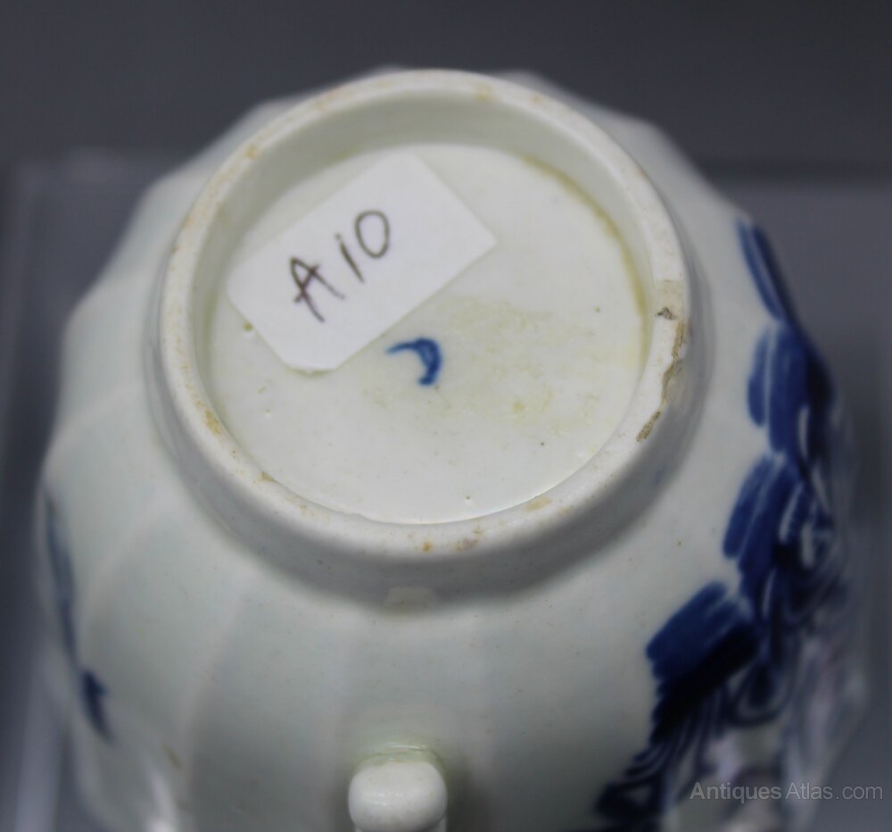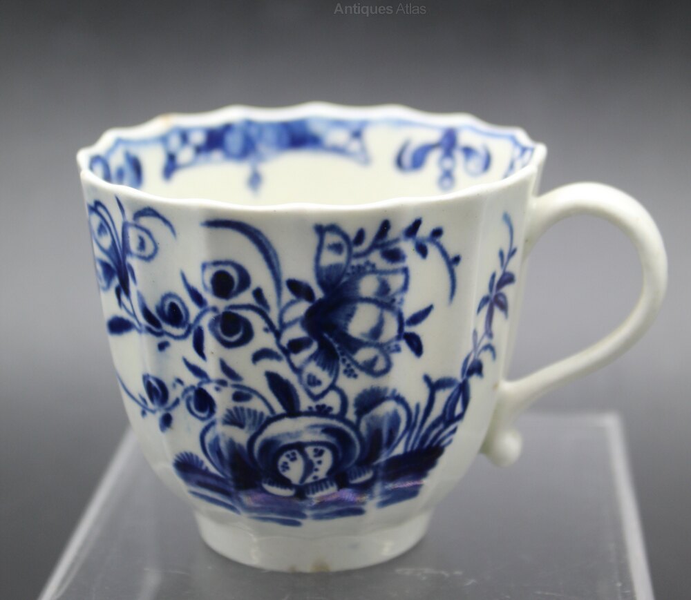 Lovely blue and white Worcester first period, cup, C1770. Crescent mark, Chinese inspired floral sprays decoration. 6.4cm diameter, 8.2cm diameter from handle to rim, and 5.8cm high. Firing marks to inside base of bowl and minor chips and rubbing to decoration.