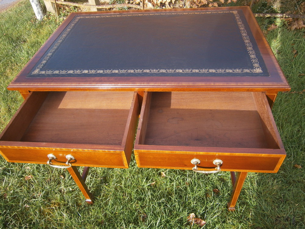 Look a superb Edwardian mahogany and inlaid writing table, with 2 drawers, box wood stringing, and satinwood inlaid.