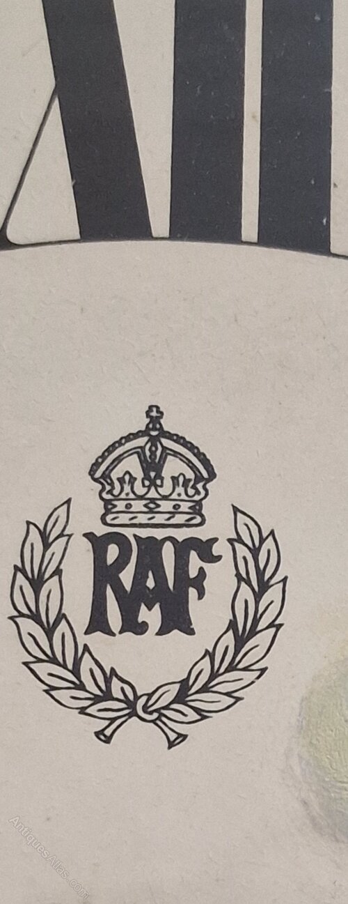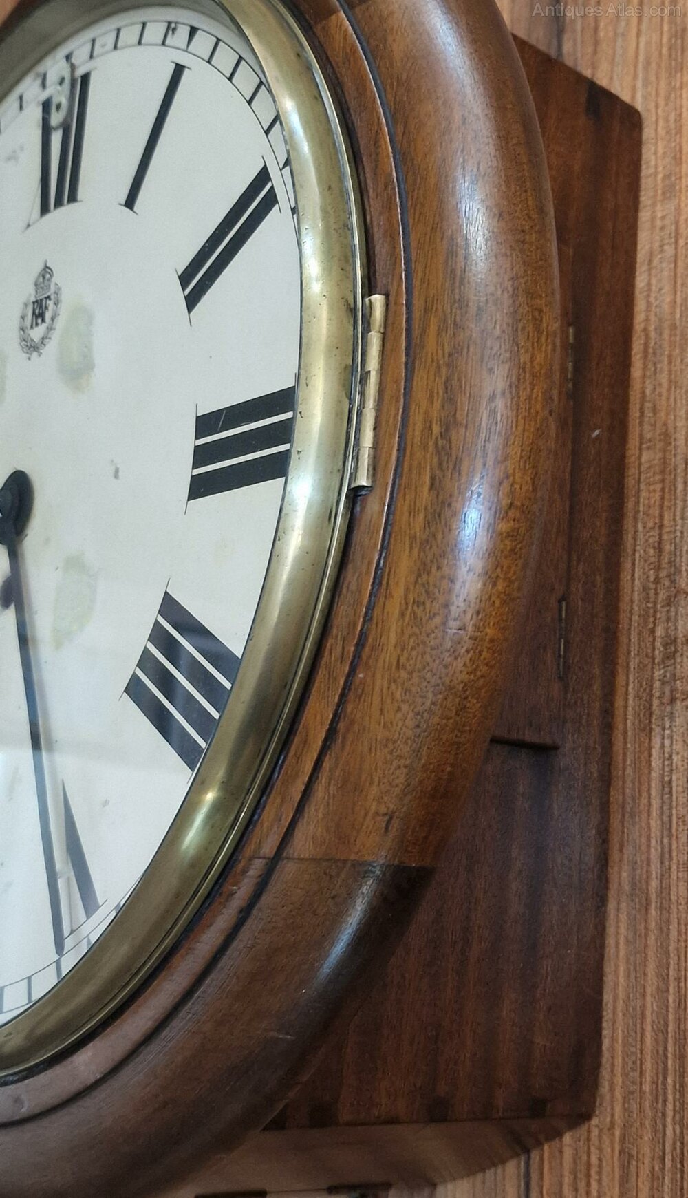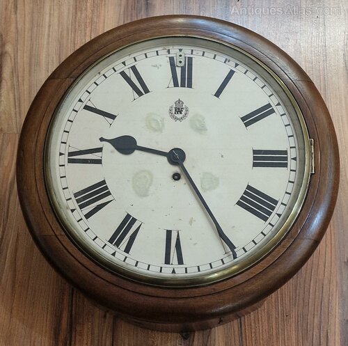 A historical WW2 period RAF wall clock. A mahogany case with a cast brass bezel and bevelled glass. A 14" original dial (repairs to the 4 dial feet) with the RAF laurel emblem and blued steel hands. The original case bottom lock and key.
