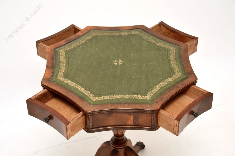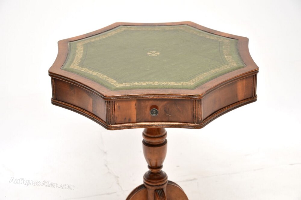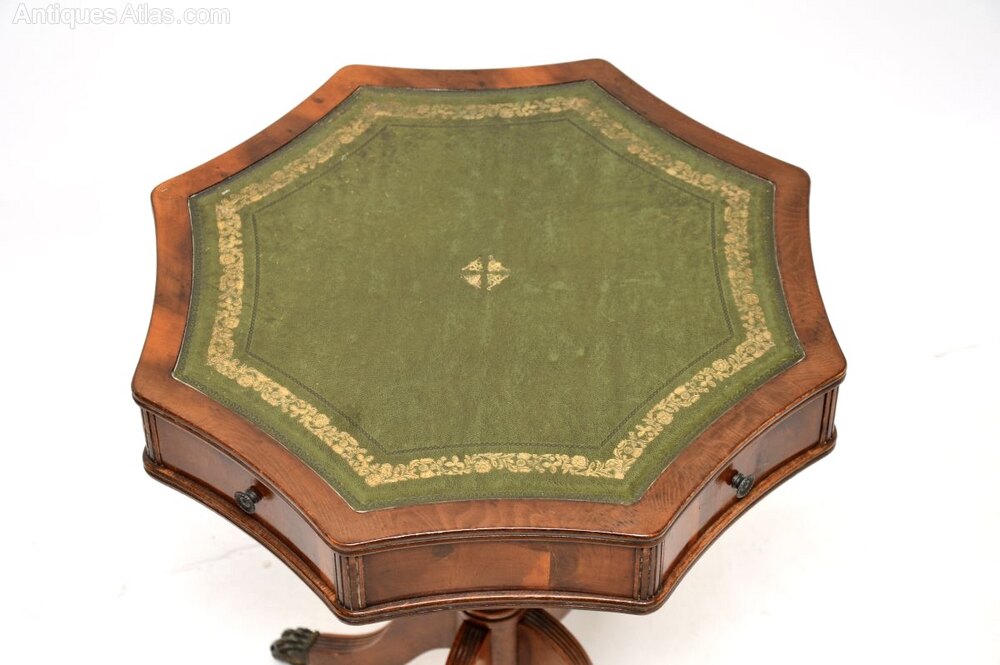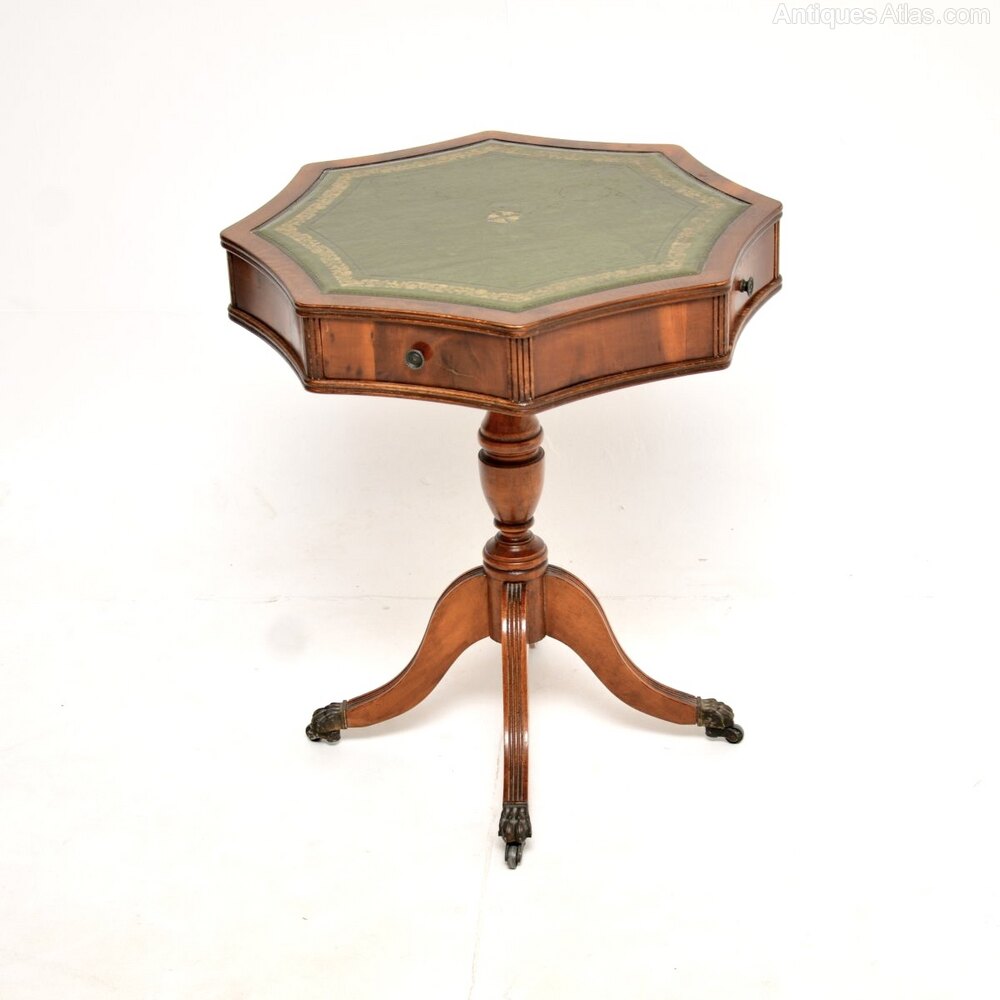 A lovely antique yew wood leather top drum table in the Regency style. This was made in England, it dates from around the 1950’s.