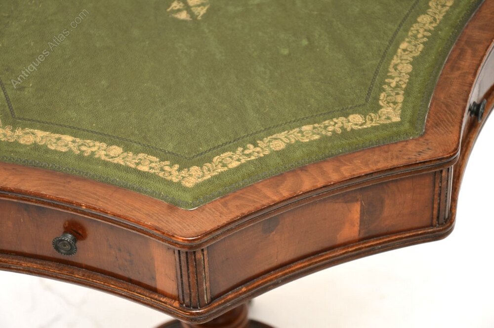 It is a very useful size to be used as a side table or coffee table, it is of very nice quality. The beautifully shaped top has an inset leather surface with gold tooled edges, there are four drawers and nicely panelled side. This sits on a single column with splayed reeded legs, terminating in hairy paw casters.