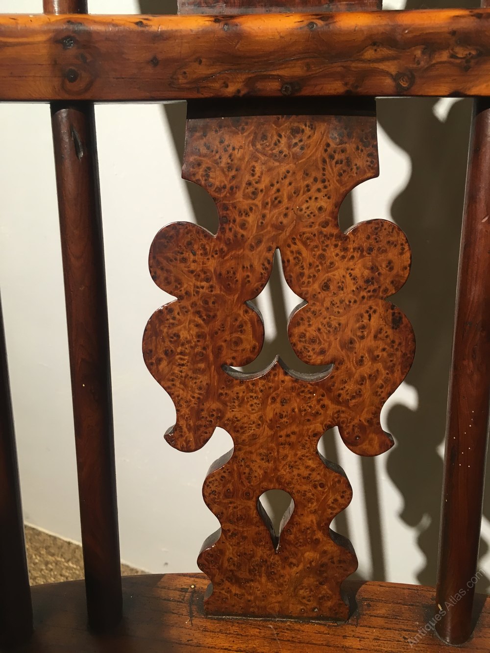 English circa 1910 , the main body of the chair is beautifully figured yew , the seat is a single slab of elm and the central back slat is the most gorgeous figured elm ..
