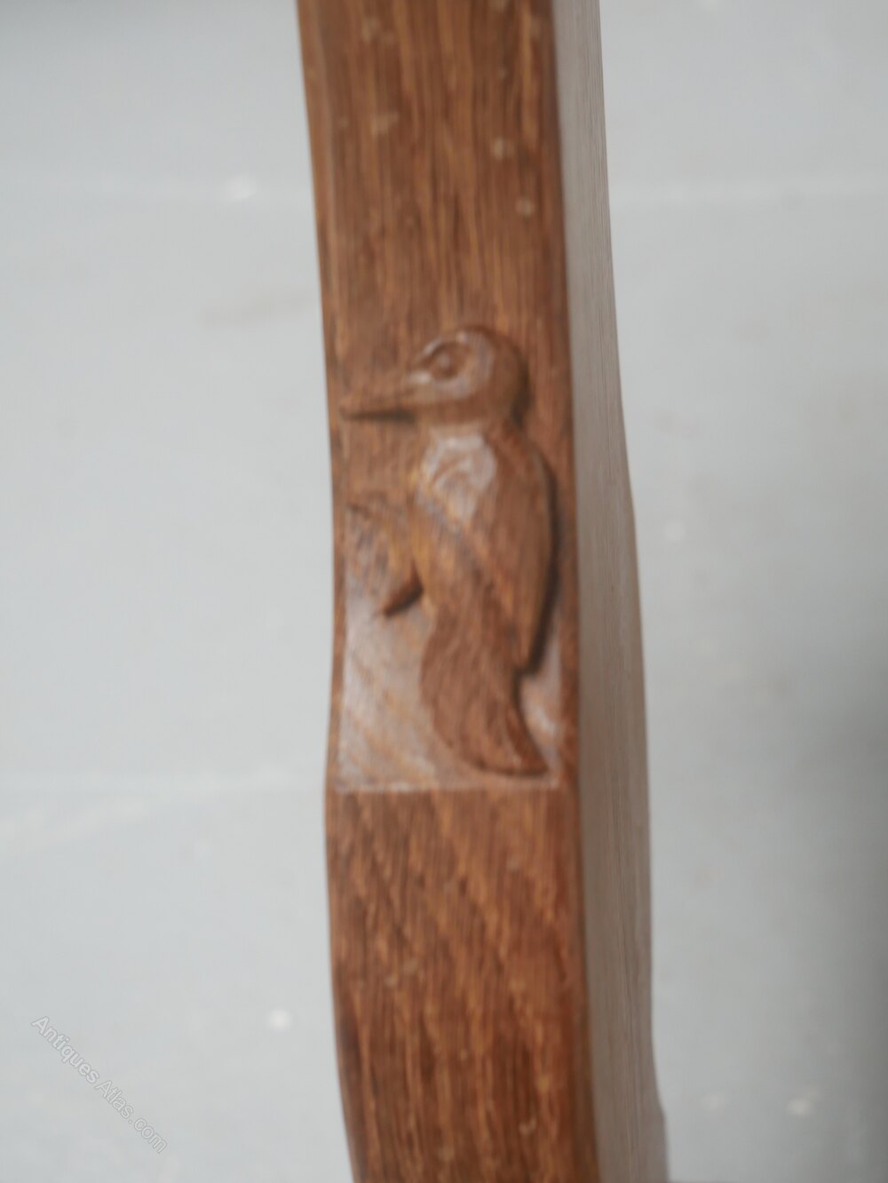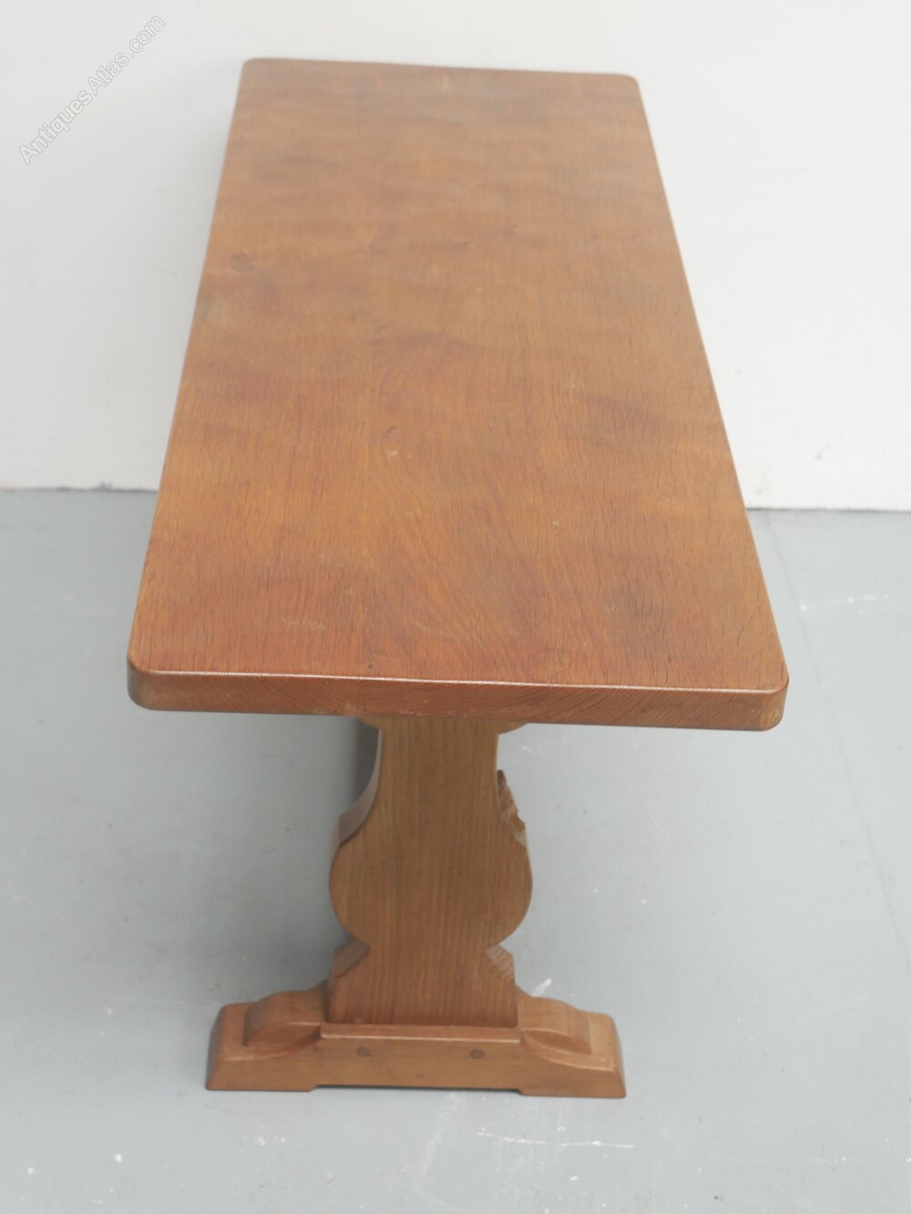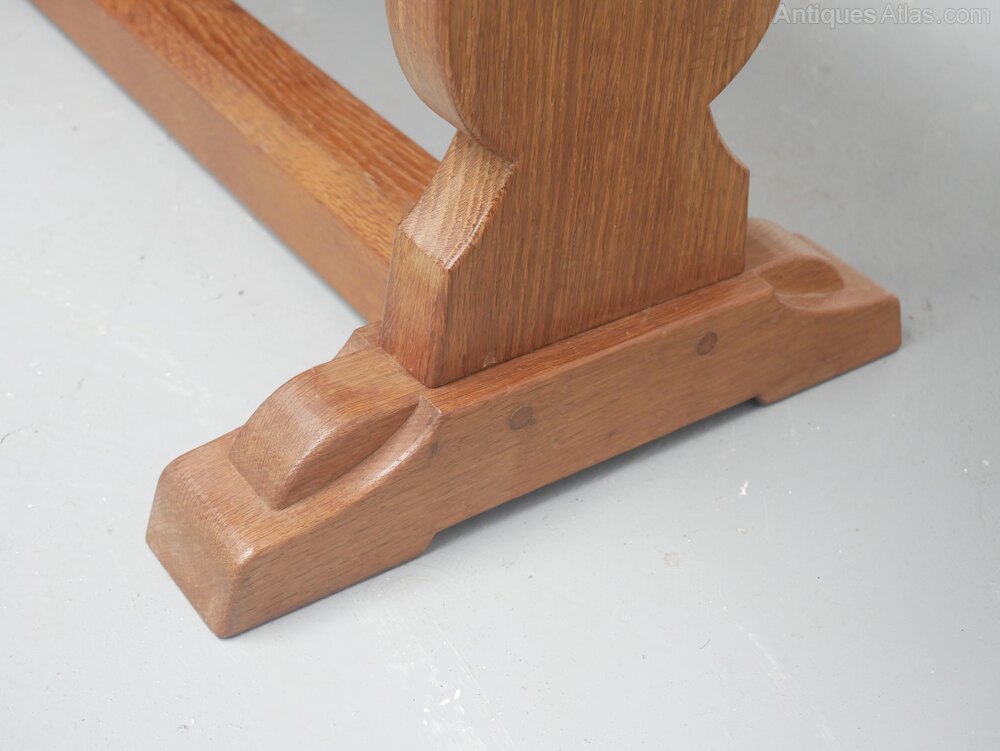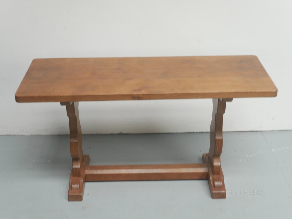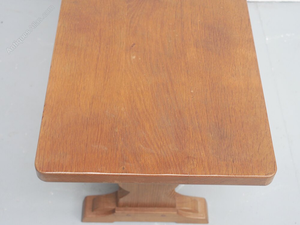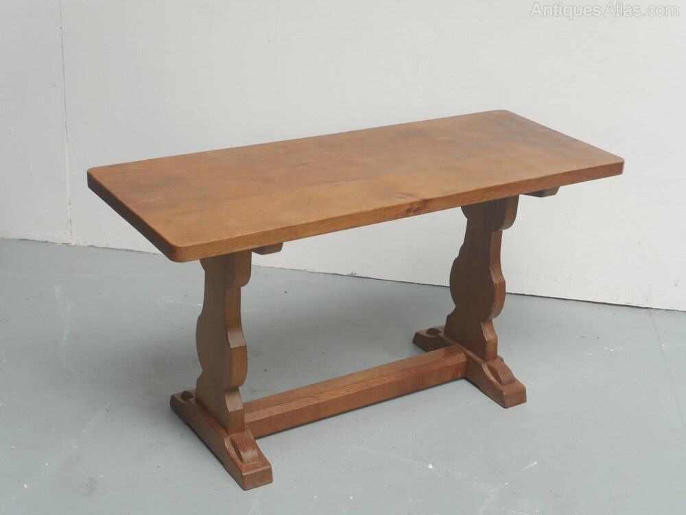A good solid oak oblong coffee table with a carved woodpecker motif for the Yorkshire cabinet maker Stan Dodds. The table top has rounded corners with sledge feet and supporting stretchers, in good condition.