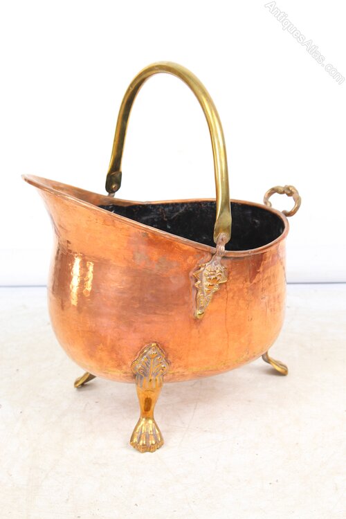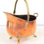 A stylish vintage copper log bin or coal bucket. helmet shaped with brass carry handle, with rivet details and raised on brass lions paw feet. A good size for storage of coal, logs or kindling etc.Construction