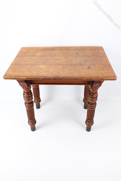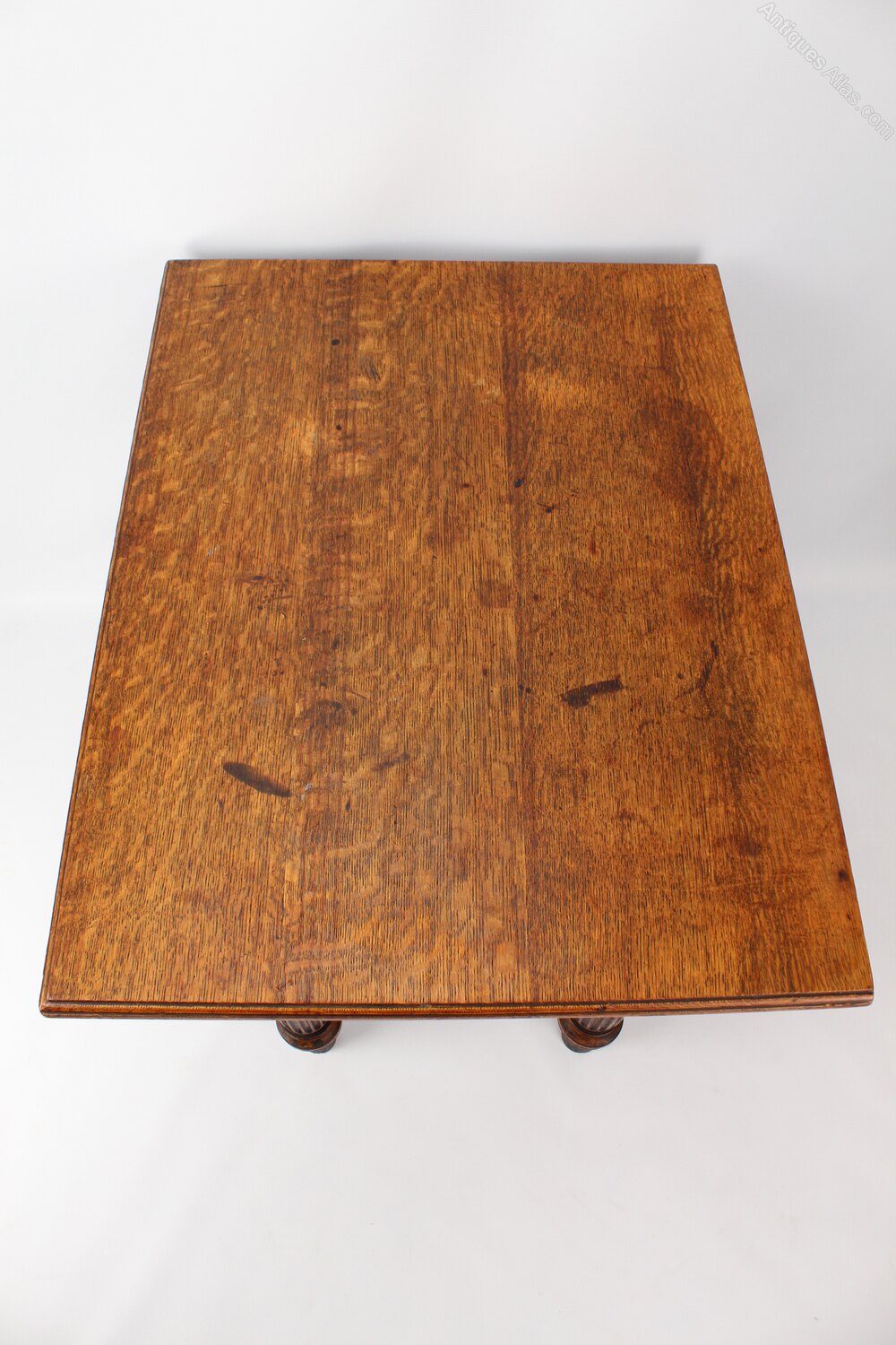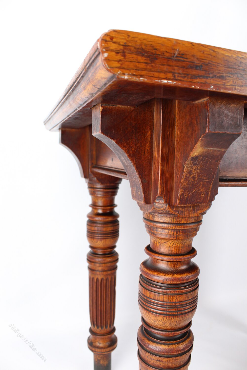 A good quality antique Victorian oak desk or table dating from circa 1890. The well-figured over-sailing solid oak top supported by bulbous turned and channelled legs supported with carved oak corner brackets. A very substantial and solid table offering lots of workspace as a desk or would work well in a retail environment to display clothes/wares.Construction/Wood: