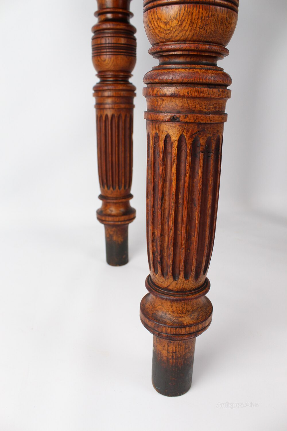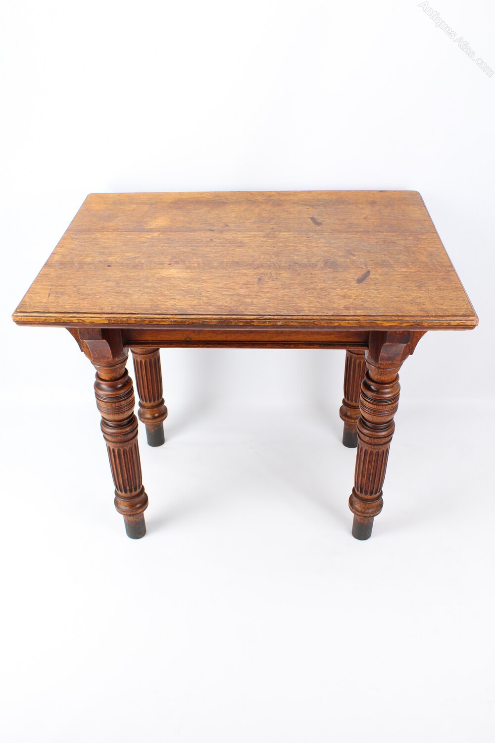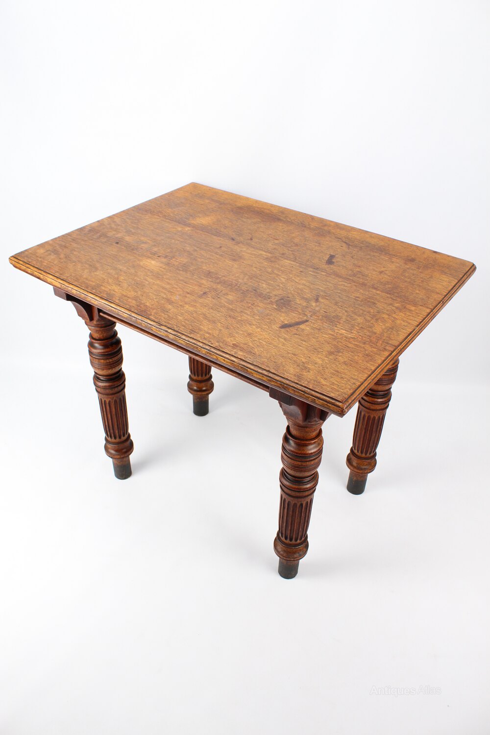 A good quality antique Victorian oak desk or table dating from circa 1890. The well-figured over-sailing solid oak top supported by bulbous turned and channelled legs supported with carved oak corner brackets. A very substantial and solid table offering lots of workspace as a desk or would work well in a retail environment to display clothes/wares.Construction/Wood: