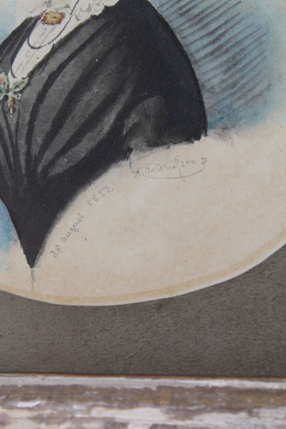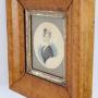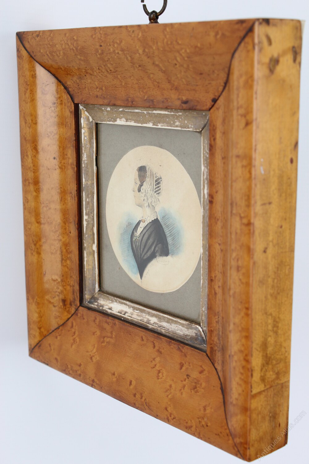A charming antique Victorian miniature head and shoulder profile portrait of a lady signed and dated 1852, in original attractive birds eye maple frame. The lady is in a black dress, white lace hair bonnet and is wearing brooches and a necklace, with the date 28 August 1852 below and signed with what appears to be “H Anderson”. This wonderful watercolour is on paper and is housed behind glass and is in its original birds eye maple cushioned frame with nicely aged inner gilt slip and complete with brass hanging loop.Construction/Wood:
