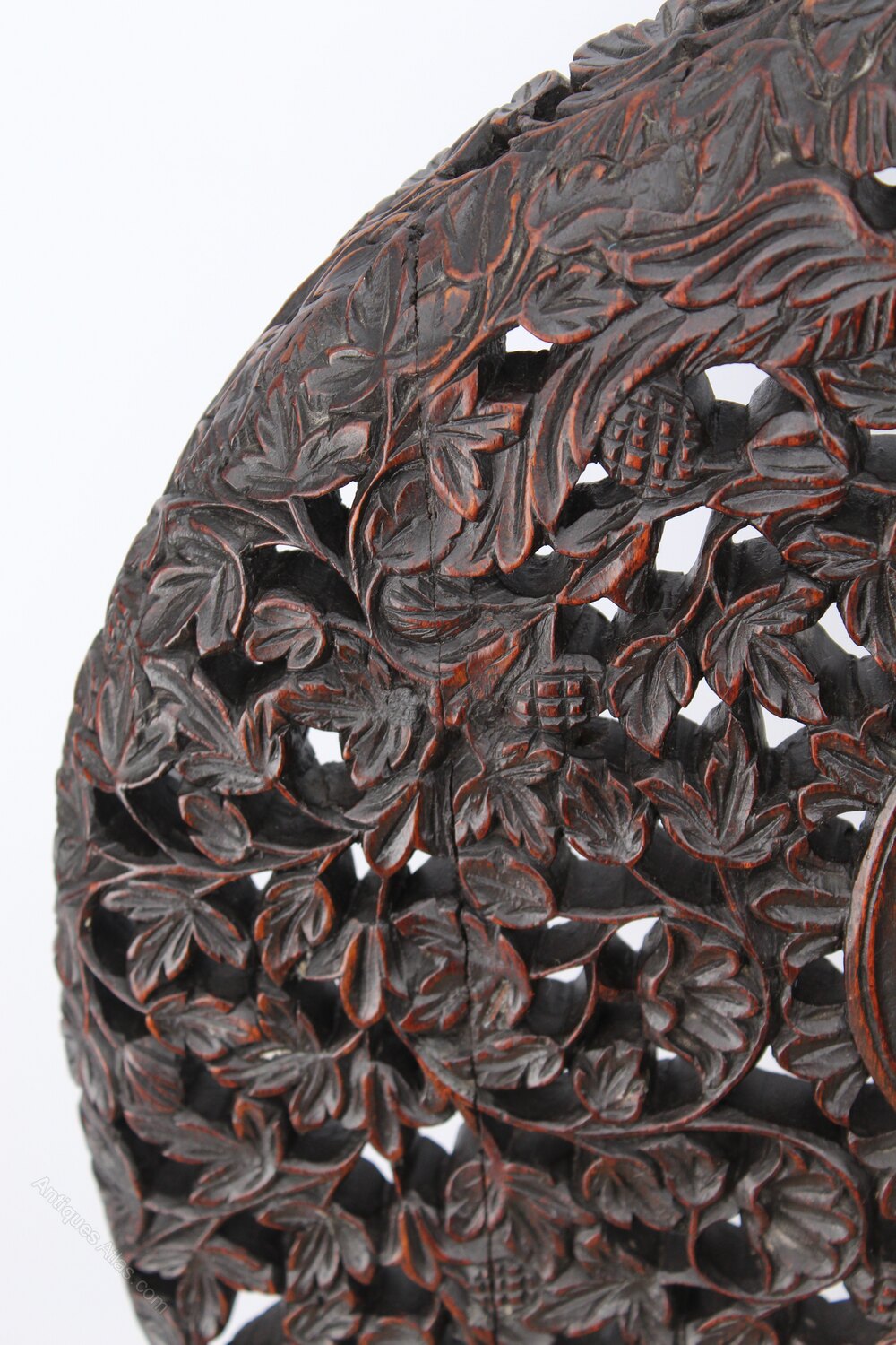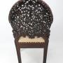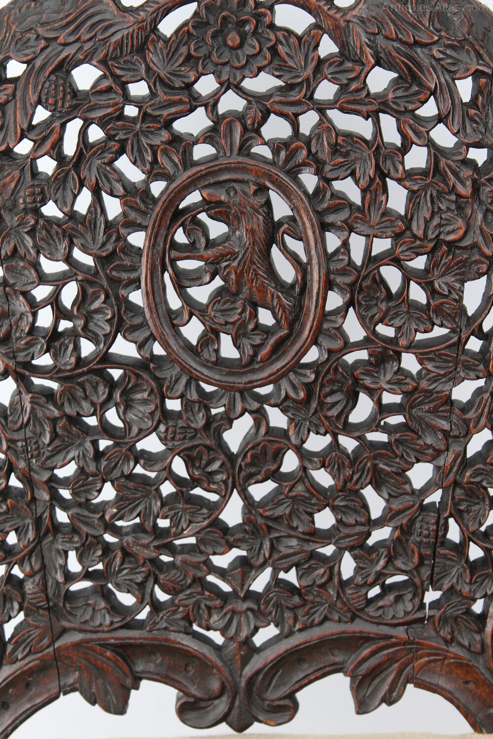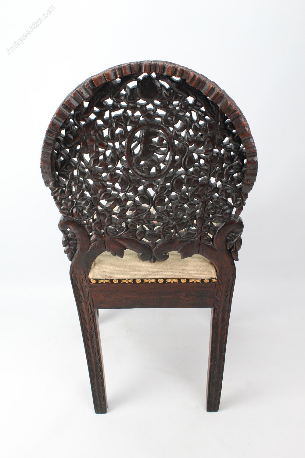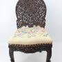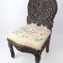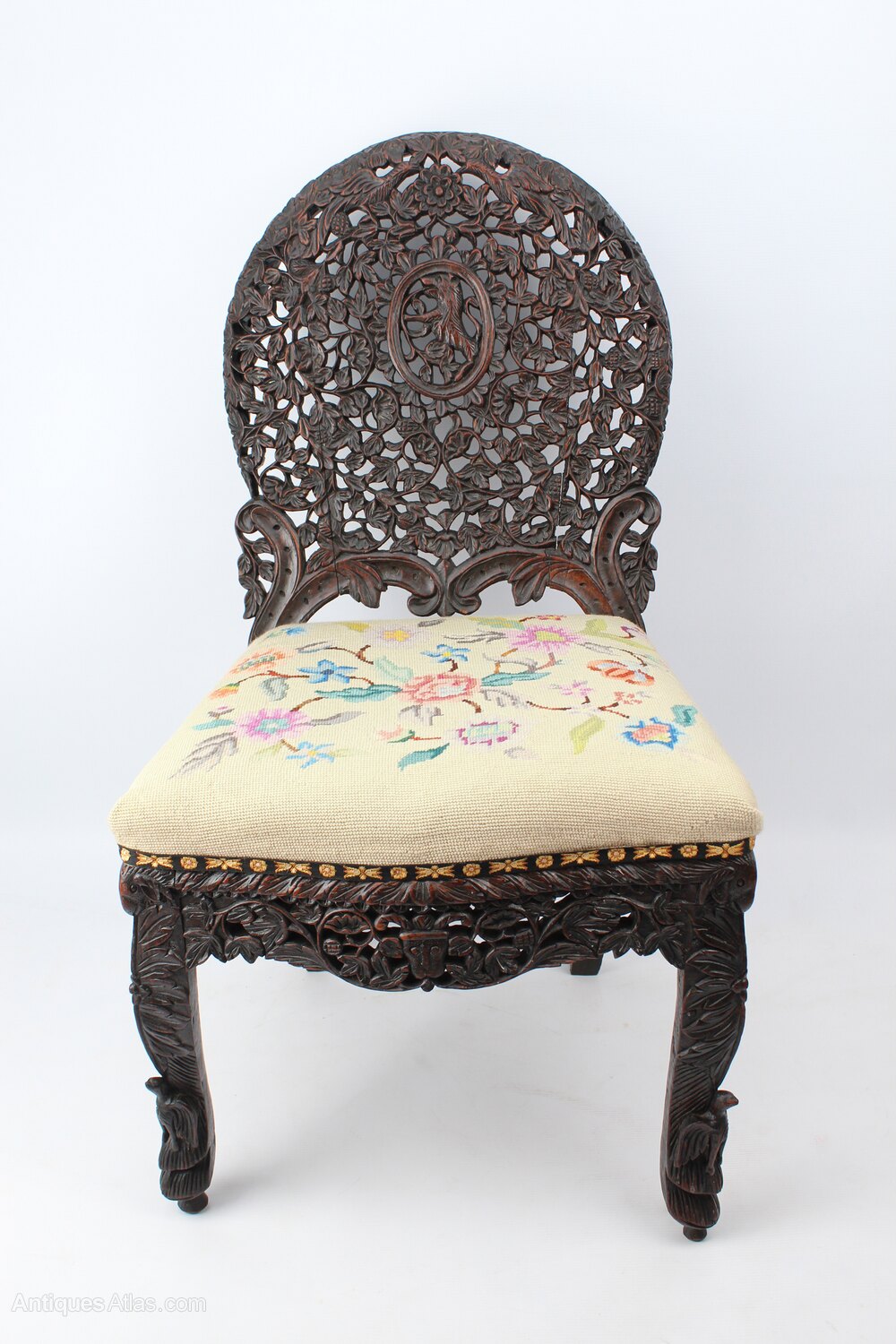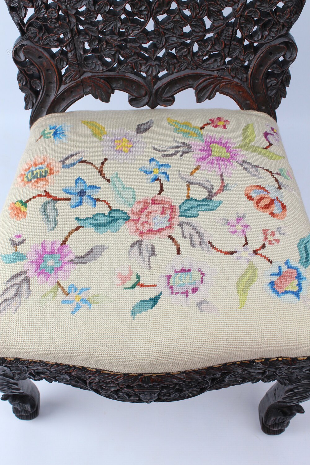 A handsome antique Burmese or Anglo-Indian carved Padouk chair dating from the late 19th Century. The really good quality, ornately carved and pierced back features a central wild boar cartouche within a network of foliage and vines intertwined around a pair of birds. The seat is upholstered in an attractive floral needlepoint tapestry on a cream ground and the seat rail and legs are profusely carved with foliage and animals, the knees with rams heads and the feet with eagles. In good condition, solid and sturdy with wonderful colour displaying its original patina. Would make a great bedroom dressing table chair or desk chair.Construction/Wood: