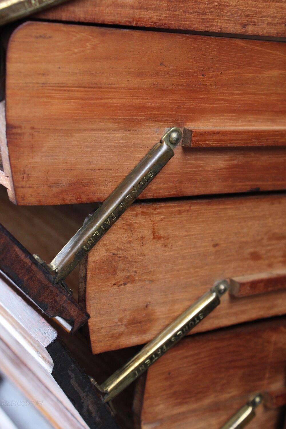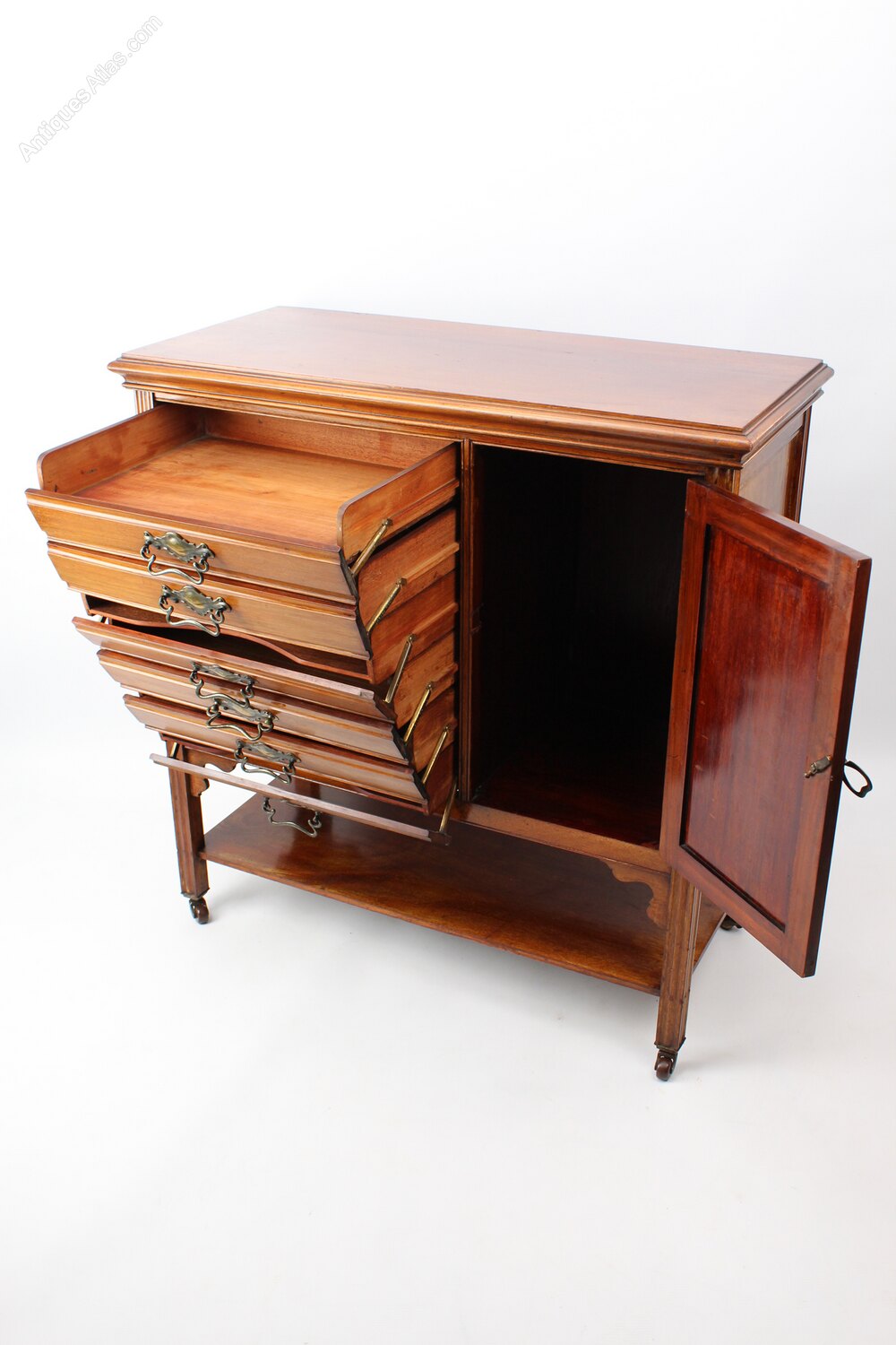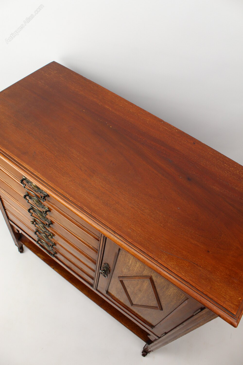 A handsome antique Edwardian music cabinet in an Arts and Crafts influenced design dating from circa 1905. In richly figured mahogany, it comprises 6 drawers which drop down (on brass stones patent hinges) when opened to allow for sheet music/papers and to the side is a cupboard. The drawers and cupboard have their original attractive arts and crafts drop handles, it has a shelf underneath the drawers and it stands on slim square legs terminating in original brass and ceramic casters. A really stylish and useful item that would make a great music cabinet, collectors chest, hall unit or filing cabinet.Construction/Wood: