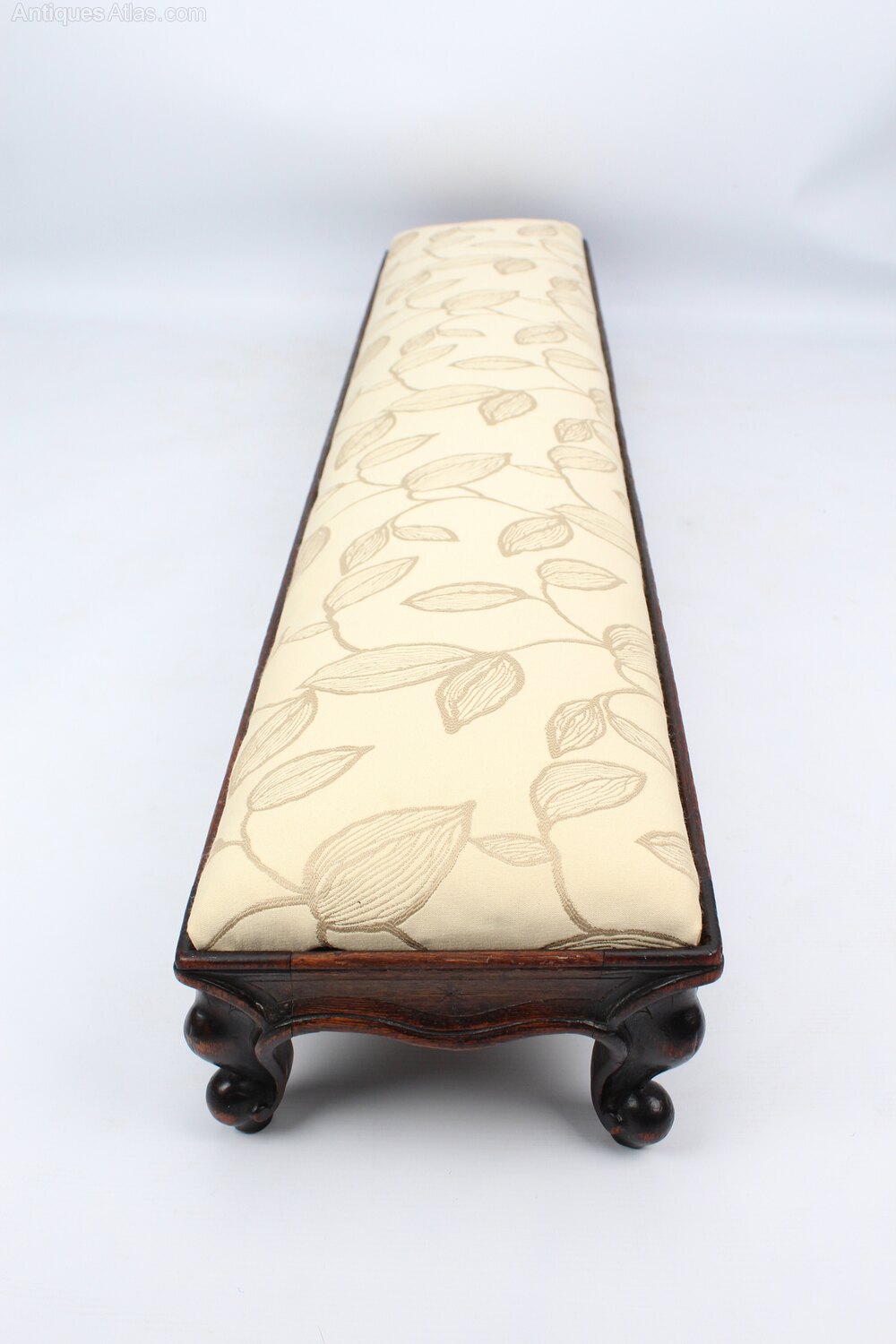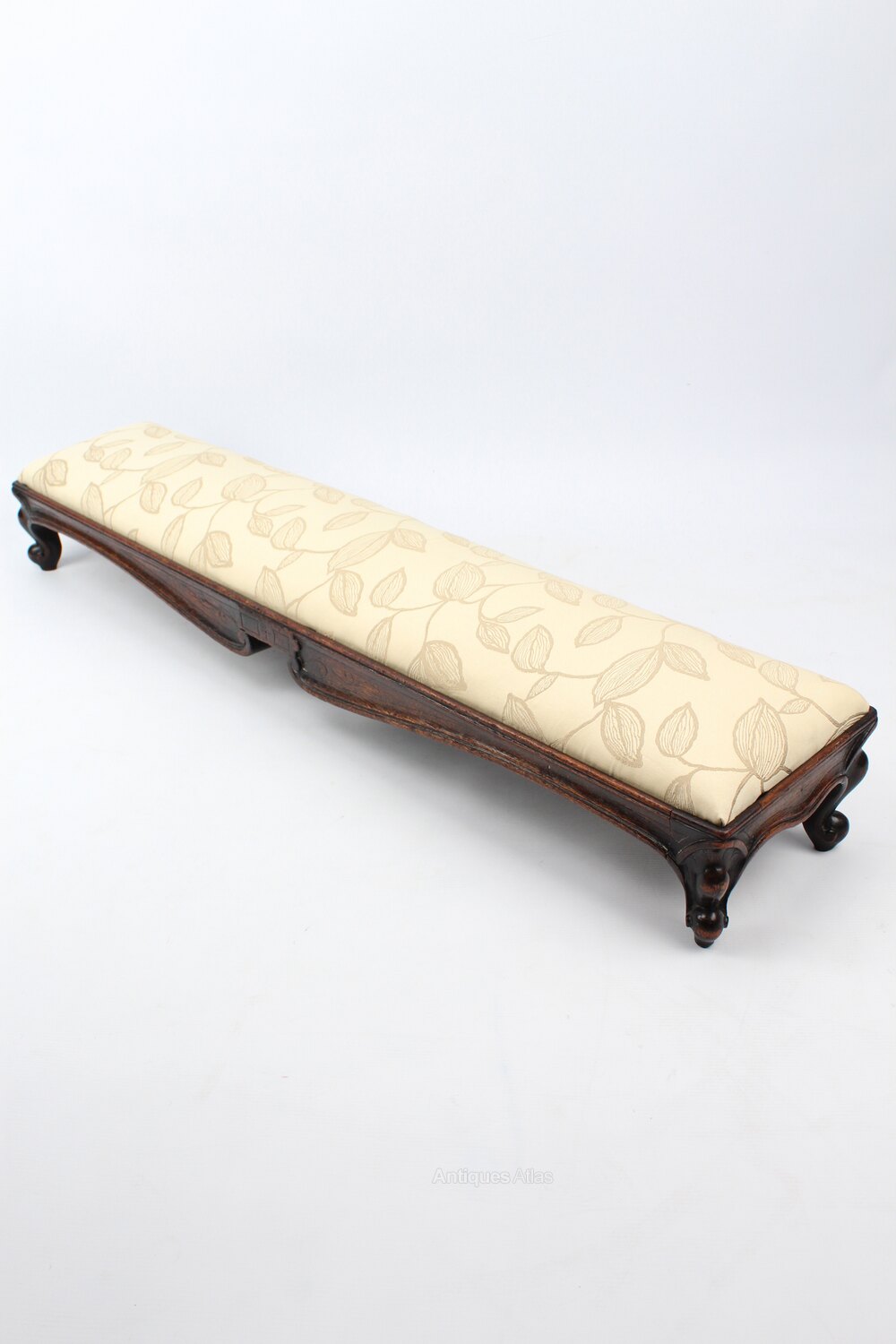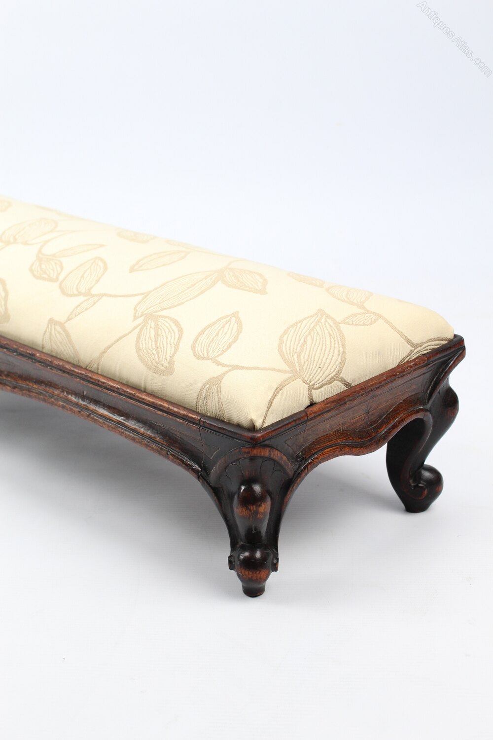 An attractive and unusual antique Victorian footstool or fender stool dating form circa 1860. Measuring 112cm or 3ft7 long, the upholstered seat pad is set at a raked angle and it stands on short carved cabriole legs in solid oak. The frame is shaped at the front and has carving around the edges and to the legs, the drop in seat pad is upholstered in a cream fabric with an embroidered leaf pattern. The joints are solid and sturdy, the frame with good original colour and patina.Construction/Wood: