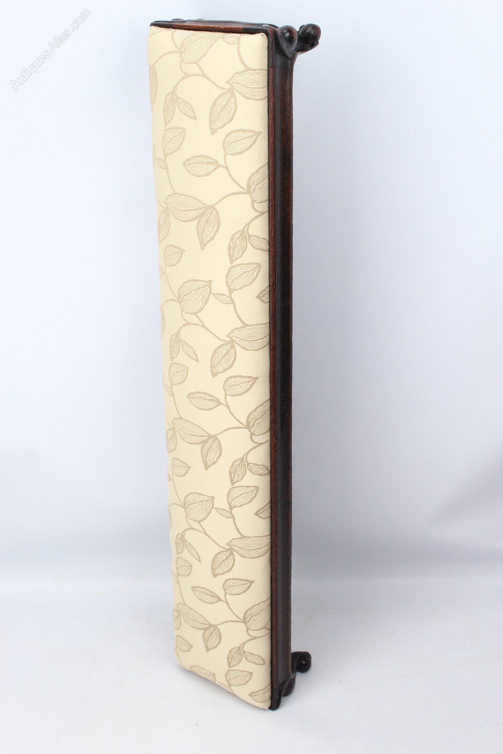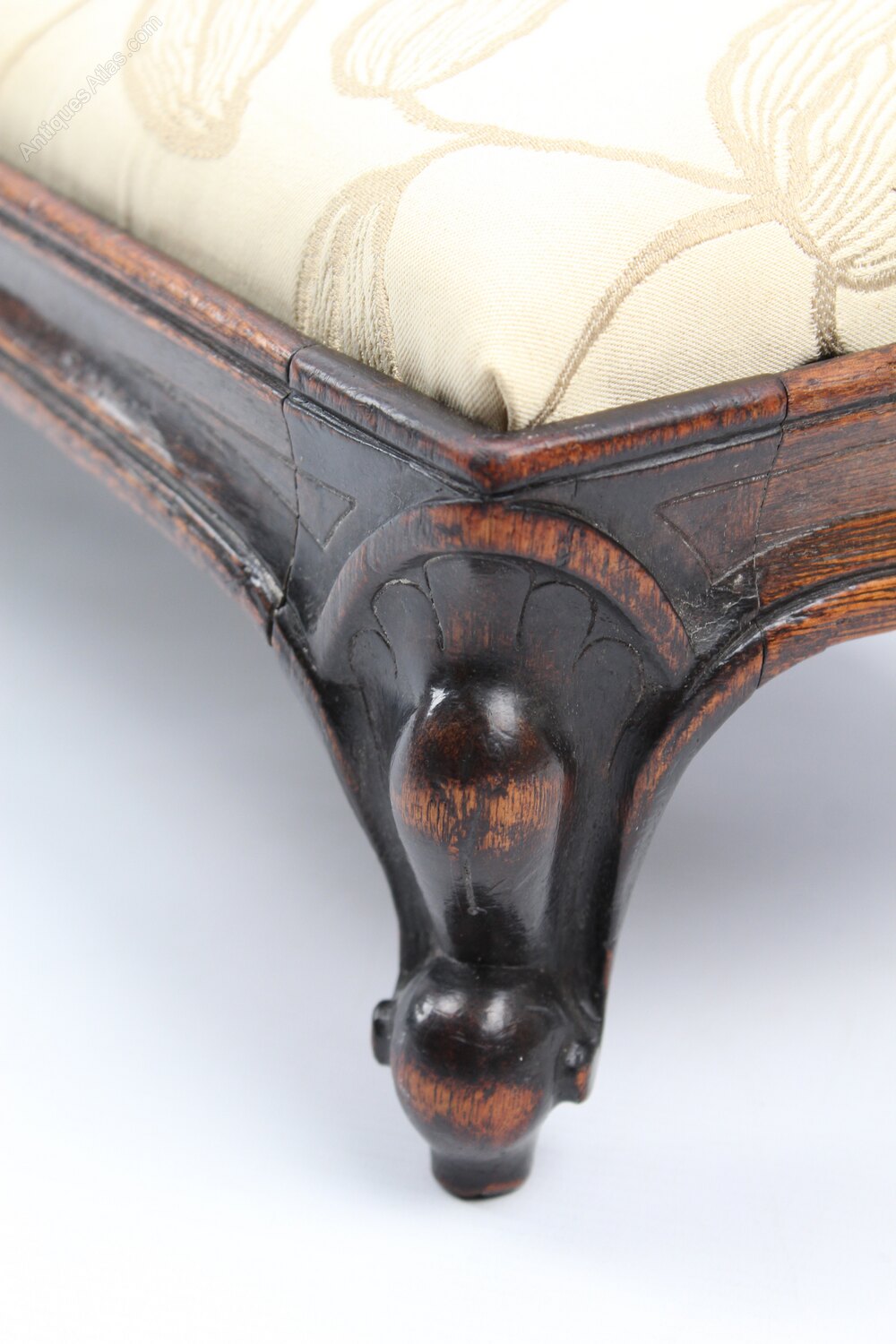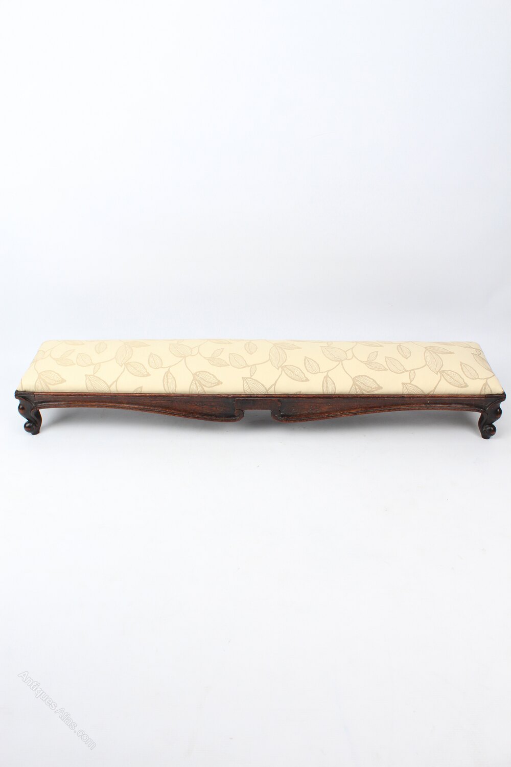 An attractive and unusual antique Victorian footstool or fender stool dating form circa 1860. Measuring 112cm or 3ft7 long, the upholstered seat pad is set at a raked angle and it stands on short carved cabriole legs in solid oak. The frame is shaped at the front and has carving around the edges and to the legs, the drop in seat pad is upholstered in a cream fabric with an embroidered leaf pattern. The joints are solid and sturdy, the frame with good original colour and patina.Construction/Wood: