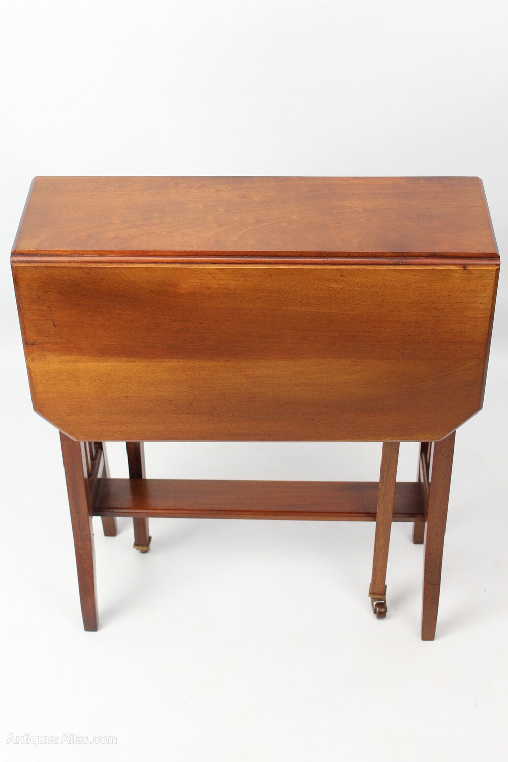 An elegant small antique Edwardian Sutherland table in walnut dating from circa 1905 retailed by Christopher Pratt & Sons. With rectangular drop leaves with canted corners, on slender tapered supports united by under tier, the front and back legs terminating in brass and pot casters. With paper label underneath for: “C. PRATT & SONS 3361 BRADFORD”.Construction/Wood: